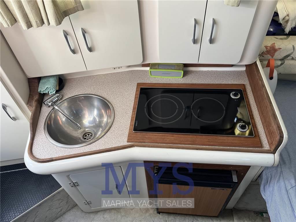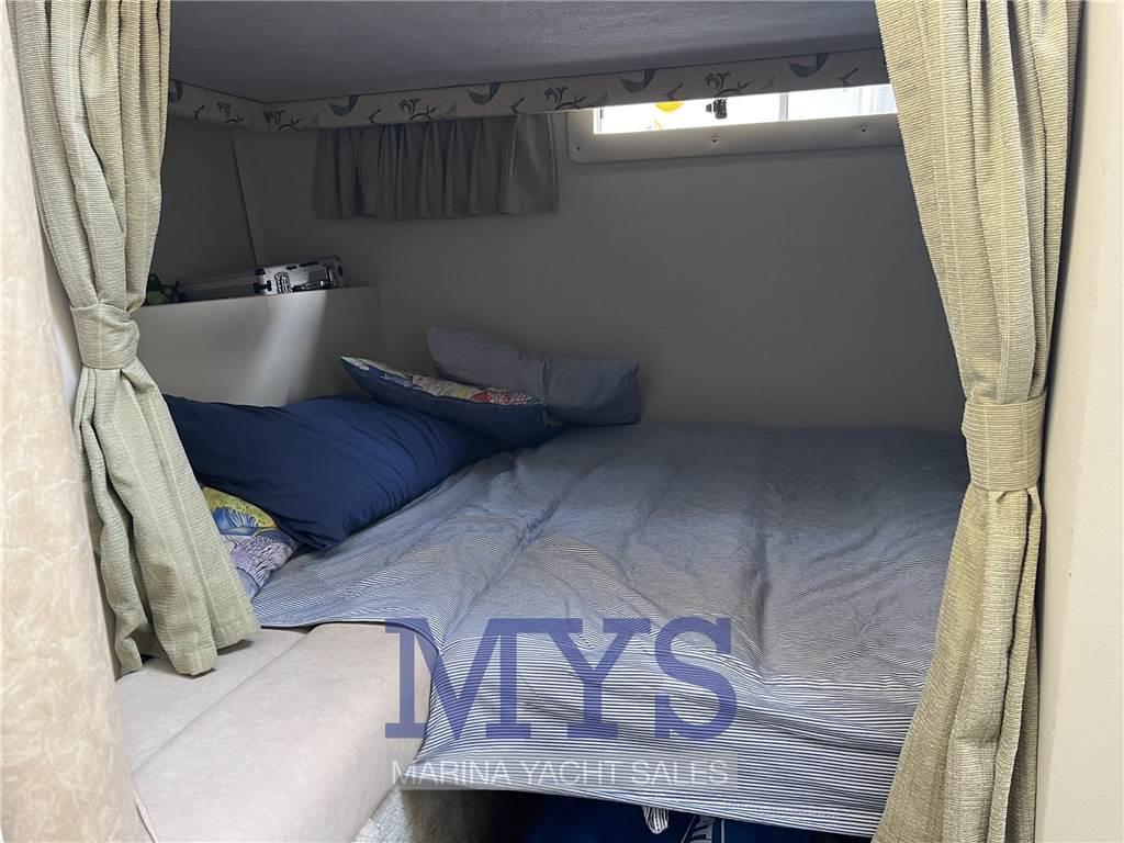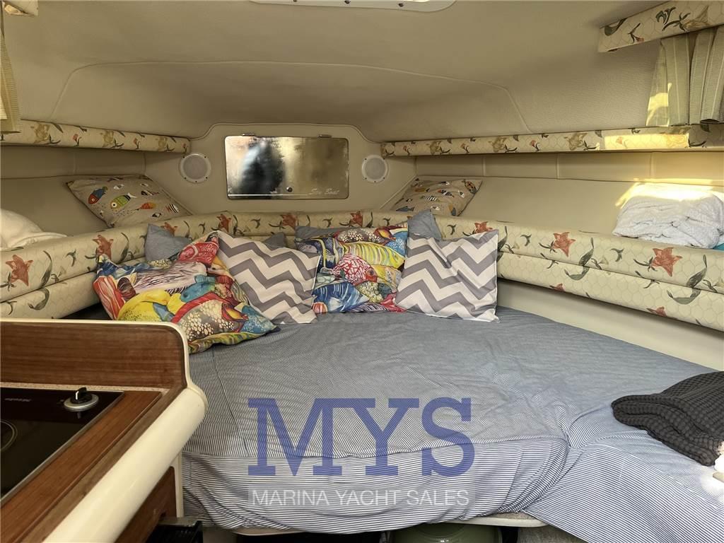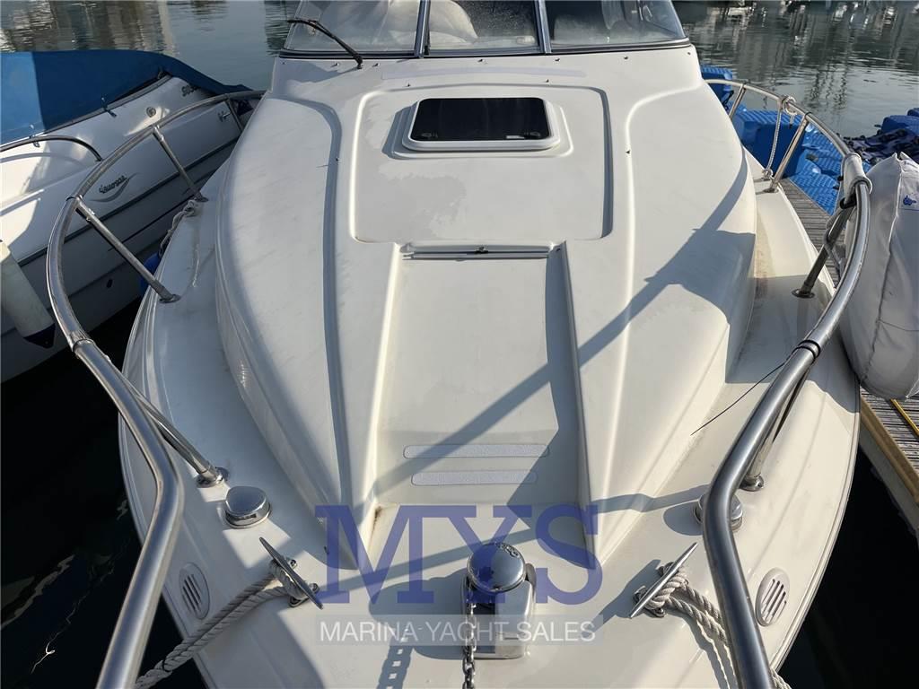 Notas internasCabina con letto a V di prua cabina ospiti con letto matirmoniale alla francese a poppa Cucina a murata dotata di lavello, frigo, forno e fuochi Notas de la instrumentaciónStrumentazione motoriPlotter gps (Garmin) Eco Log VHF Vericello elettrico Flaps idraulici Batterie Caricabatteria Boiler acqua calda 1 frigo Radio e stereo Autoclave pompa di sentina elettrica pompa di sentina manuale salpancira elettrico Notas de armamentoTendalini di chiusura totale pozzettoCuscineria esterna |