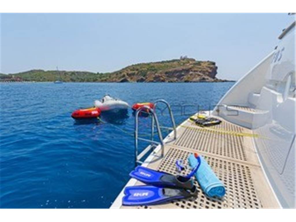 Notas internasAccommodation in One Master cabin with walk -in wardrobe, One VIP cabin and Two twin cabins which can be convertible to double all with ensuite facilities Notas de la instrumentaciónTenders & Toys:4.2m Rib with 40hp engine Waterskis (adults) Wakeboard Tubes Floating mats Beach Games Snorkeling & Fishing Equipment Notas de armamentoAllestimento tecnico e di coperta:Ancora, Doppia timoneria, Passerella, Pozzetto Teak, Presa 220V banchina, Tavolo pozzetto, Tender, Winch. Dotazioni domestiche di bordo: Aria condizionata, Impianto acque nere, Prese interne 12v, Prese interne 220v. Dotazioni di sicurezza: Dotazioni di sicurezza entro 3 miglia, Dotazioni di sicurezza entro 6 miglia, Dotazioni di sicurezza entro 12 miglia, Dotazioni di sicurezza entro 50 miglia, Dotazioni di sicurezza oltre 50 miglia, E.P.I.R.B.. Intrattenimento: Impianto TV, Ricevitore satellitare, Stereo, TV. Cucina ed elettrodomestici: Congelatore, Cucina, Frigorifero esterno, Frigorifero interno, Lavasciuga, Lavastoviglie, Lavatrice. Tappezzerie: Bimini, Cuscineria completa, Cuscineria fly, Cuscineria Pozzetto, Tendalino. |