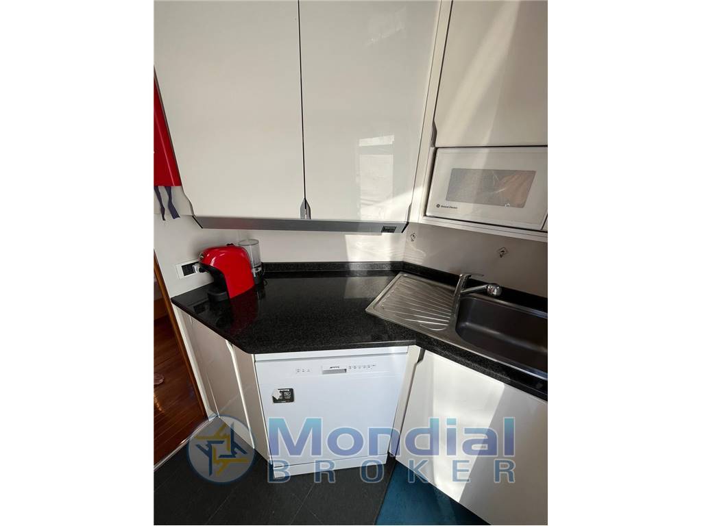 Notas de armamentoImpianto antincendio, Presa d'acqua diretta in banchina, Ancora (Bruce 50 Kg), Slpancora elettrico, 2 verricelli di ormeggio a poppa. Serbatoio acque nere in inox con vasca di decantazione (2x600) + ispezione, Impianto di depurazione dell'acqua, Predisposizione dissalatore, Autoclave, Boiler, Cassaforte, Aria Condizionata reversibile, Antenna TV satellitare, TV digitale terrestre, TV salone, Impianto TV in tutte le cabine, Lettore DVD/CD, Impianto audio Bose, Cantina vini, Macchina caffè, Lavastoviglie Smeg, Lavatrice. Bimini sul fly, Cuscineria prendisole, Cuscineria di poppa e di prua, Cuscineria fly, Cuscineria pozzetto, Coprifinestre, Tavolo pozzetto con Copertura, Porta d'ingresso a poppa in inox, Doccia di prua, Lavaggio catena, Luci di poppa fisse, Luci di cortesia, Scaletta bagno, Passerella idraulica, Tender Eurovinil 270 NUOVO 2022, Motore FB Yamaha 4hp, Zattera per 10 persone.