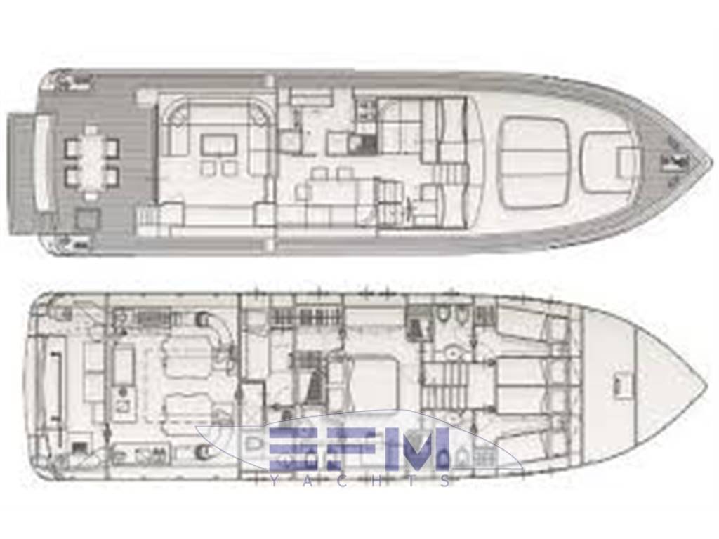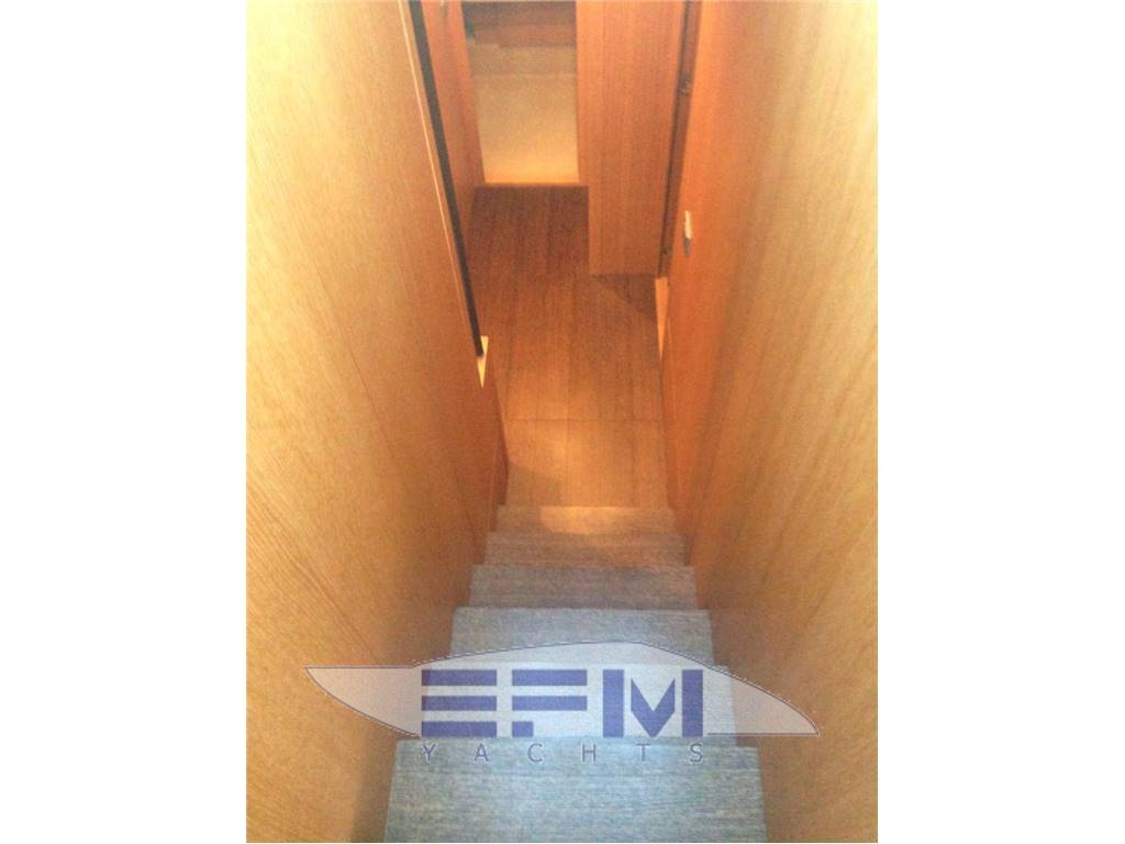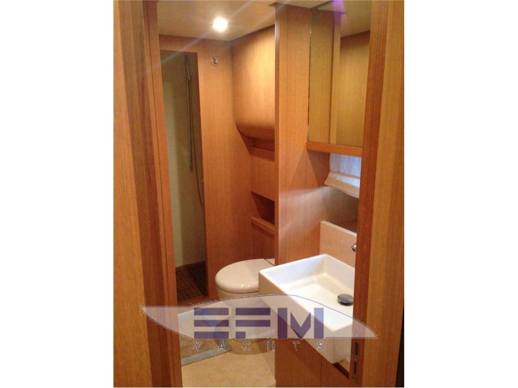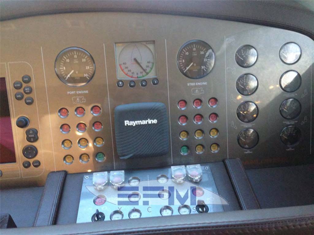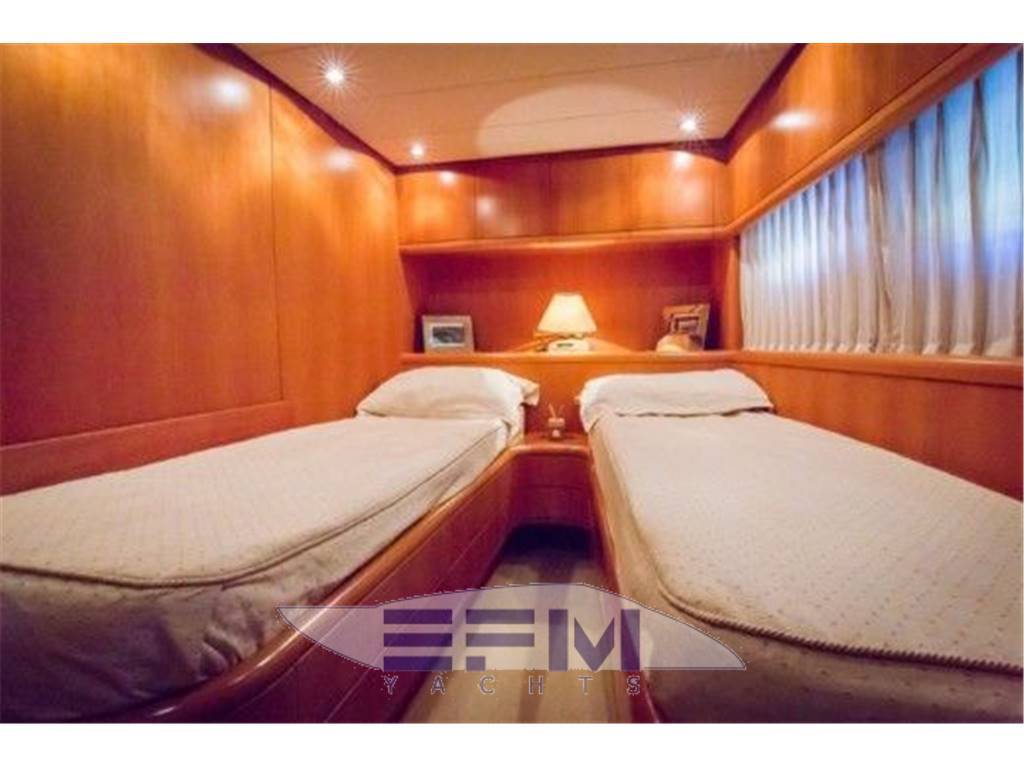 Notas internasMain deck: Salon with U-shaped sofa and storage - dining area - galley with door to exterior side corridor and stairs down to pantry - wheelhouse - dinette. Lower deck: Owner’s cabin at midship with bathroom and walk-in wardrobe - two twin guest cabins, each with private bathroom Two-bed and bathroom crew accommodation at bow. Interni In rovere satinato - Ponte di coperta: Salone con divano a U e mobile contenitore - zona pranzo - cucina con porta di uscita sul camminamento laterale e locale cambusa - timoneria- dinette. Ponte inferiore: cabina armatore a centro barca con bagno e dressing - due cabine ospiti a letti in piano ognuna con bagno privato. Alloggio equipaggio a prua con 2 letti e bagno. Notas de la instrumentaciónWheelhouse: multifunction display Raymarine C120 (Radar 48 mg./Plotter GPS/ECO) - autopilot Raymarine ST6001 - tridata ST60 Raymarine - rudder angle indicator Raymarine ST60 - VHF Raymarine RAY240Fly bridge: multifunction display Raymarine C 80 (Plotter GPS/ECO) - rip. autopilot ST6001 - tridata ST60 Raymarine - rudder angle indicator Raymarine ST60 - VHF Raymarine RAY240. Elettronici In plancia: monitor multifunzione Raymarine C120 (Radar 48 mg./Plotter GPS/ECO) - autopilota Raymarine ST6001 - tridata ST60 Raymarine - angolo di barra Raymarine ST60 - VHF Raymarine RAY240. Sul fly: monitor multifunzione raymarine C 80 (Plotter GPS/ECO) - rip. autopilota ST6001 - tridata ST60 Raymarine - angolo di barra Raymarine ST60 - VHF Raymarine RAY240. Notas de armamentoEntertainmentIn salon, TV LCD 27" , DVD, Hi-Fi, decoder - TV LCD 22” with DVD and Hi-FI in Owner’s cabin - car stereo in guests cabins Systems Bow thruster - stern - air conditioning (48.000 BTU) - CCTV system with two cameras and one display - flaps. Household Appl Galley: frigo/freezer - electric hob - oven - washdisher. Small fridge in salon - small fridge and BBQ on fly - washing machine and dryer in galley peak Deck equipment Winch - two capstans at stern - retractable hydraulic gangway -hydraulically operated stern platform- crane for tender on fly bridge - bimini top Audio video In salone TV LCD 27 “ - DVD - Hi-Fi - decoder - TV LCD 22” con DVD e Hi-FI in cabina armatore - car stereo nelle cabine ospiti. Antenna TV satellitare . Impianti Elica di prua - elica di poppa - aria condizionata (48.000 BTU) - Impianto TVCC con 2 camere ed un monitor - flaps. Elettrodomestici In cucina: frigo/freezer - piastra di cottura elettrica - forno - lavastoviglie. Frigo bar in salone - frigobar e BBQ sul fly - lavatrice ed asciugatrice nel gavone cucina. Attrezzature Verricello - due tonneggi poppieri - passerella idraulica a scomparsa - pedana di poppa ad apertura idraulica - gru per tender sul fly - bimini top. |