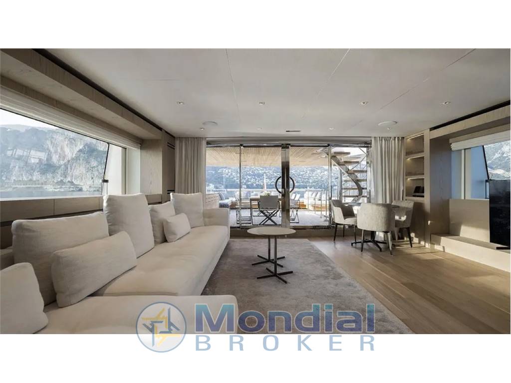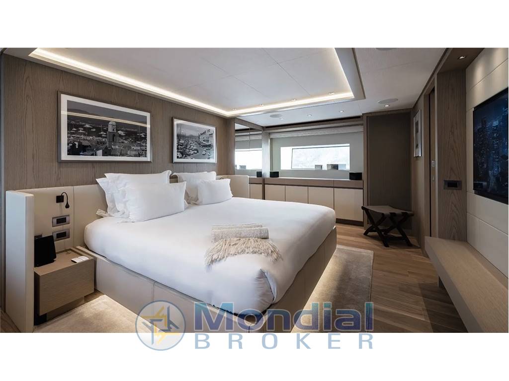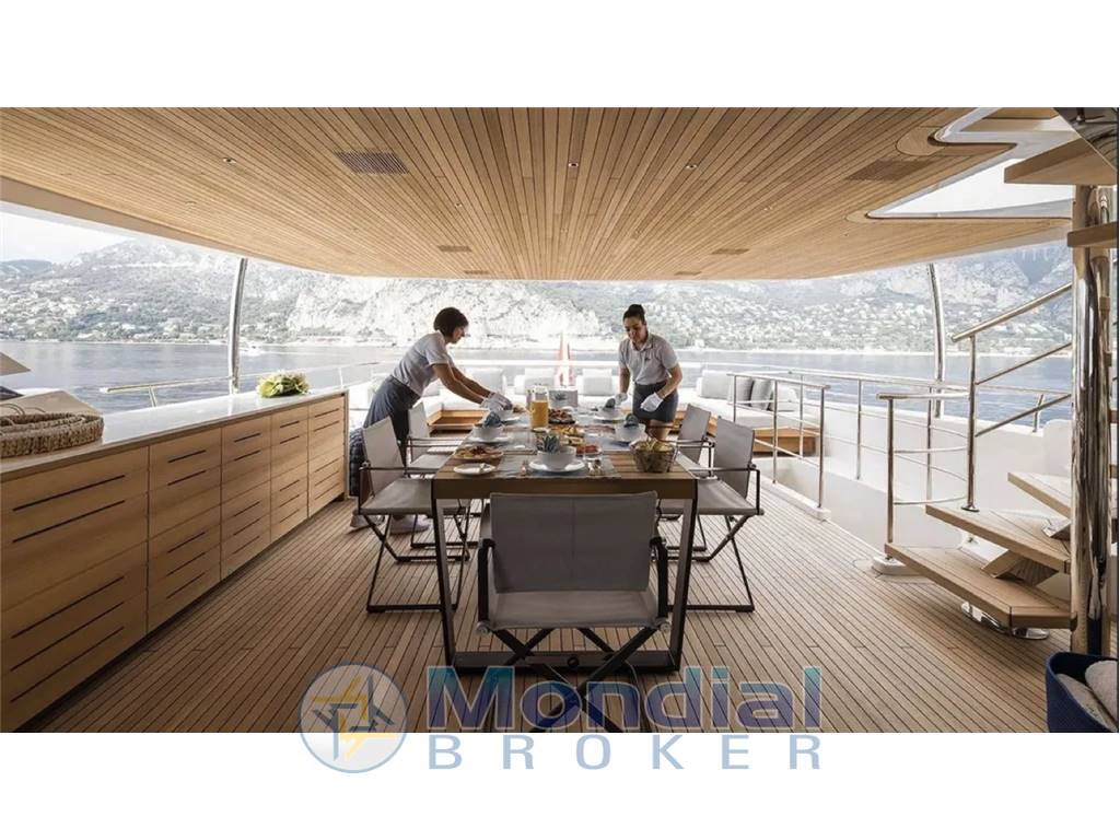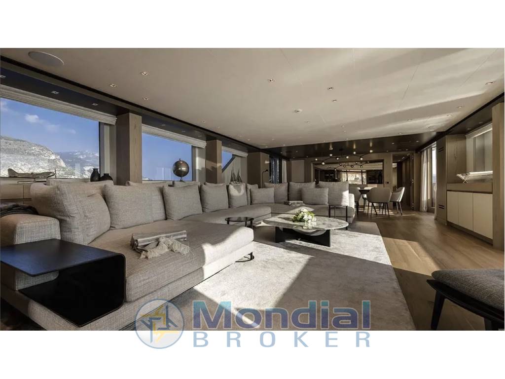 Notas internasThe Sanlorenzo SD126 was designed to optimize and maximize all spaces, while enriching the interior areas with natural light. The sheer line amid ship is cut to let the enlarged side windows catch as muchlight as possible, allowing guests enjoy the view even while sitting in the salon. The bow is a living space with sofas, sunbathing cushions. Up top, the flybridge is expanded into a generous sunbathing and entertaining area, to a tender garage at the transom and hydraulic lift swim platform. The overall space and livability of this 126’ triple deck motor-yacht must be seen to be appreciated. With an interior volume 314 gt she can comfortably accommodate 10 passengers in 5 cabins There is a generous on-deck, full beam Owner suite, with study, generous walk-in closet and the big head. The big upper skylounge, with a serving pantry and day head, leads to an exceptionally large upper aft deck, with a covered formal dining area seating 10 guests. These areas combined with a spacious covered aft deck and 2 sunpads plus a seating area on the foredeck give exceptional exterior spaces allowing even the largest groups to get away and relax.