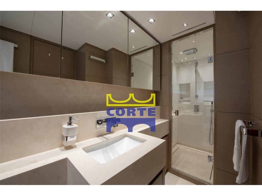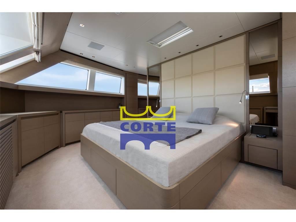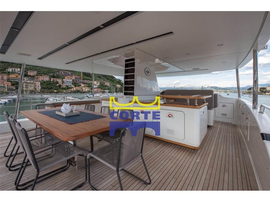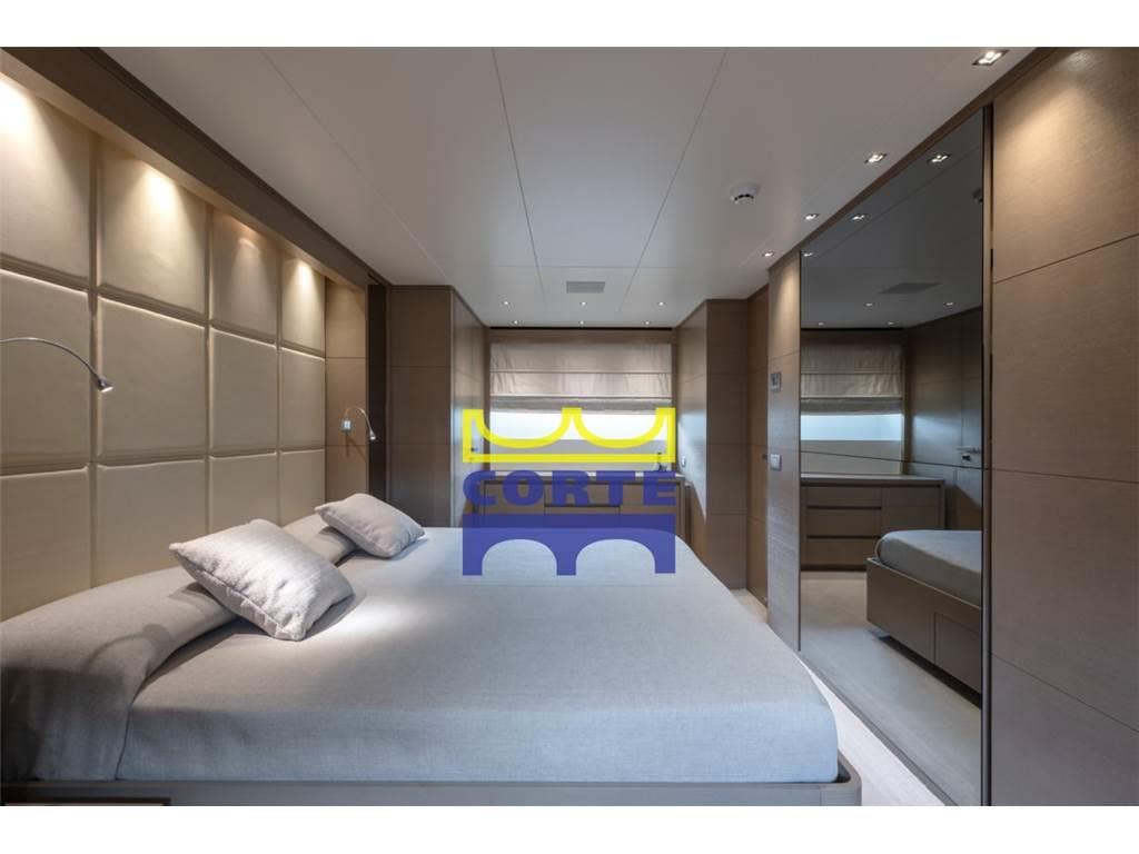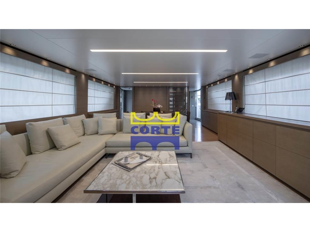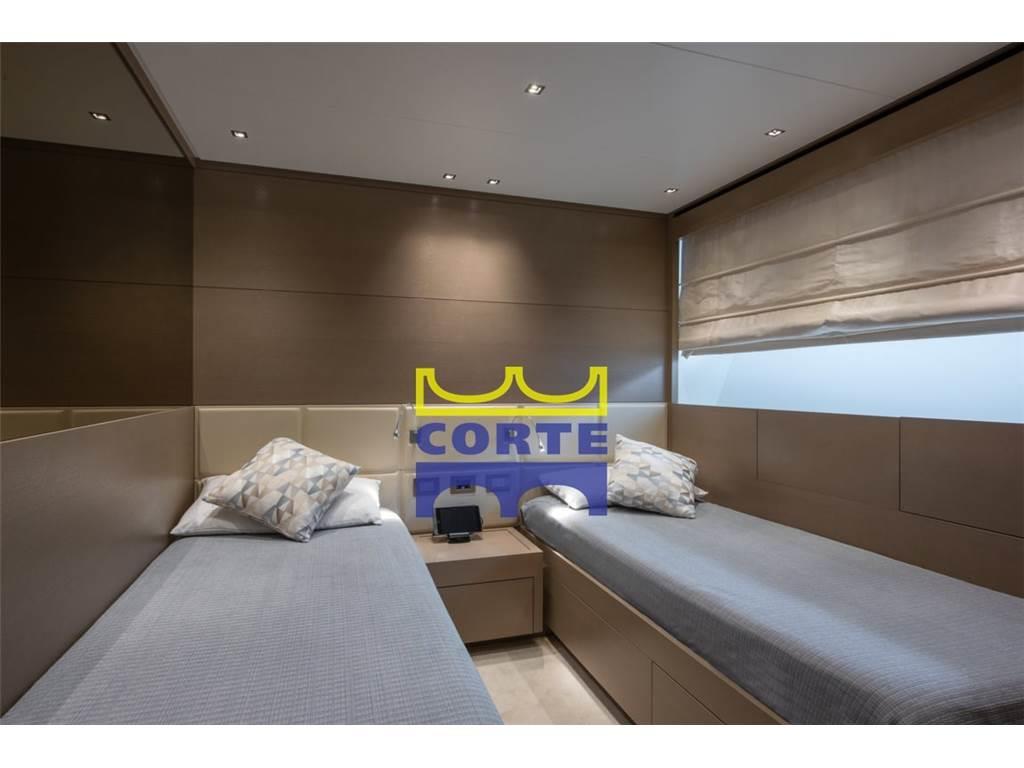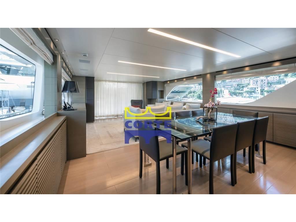 Notas internasPonte principale; Ampio salone con divano Minotti, poltrona, tavolino e mobile contenitore ; zona pranzo con tavolo e 8 sedie. Day toilet Cucina separata attrezzata con piano ad induzione, lavastoviglie, frigorifero e freezer. Cabina armatoriale matrimoniale con bagno e cabina armadio. Pozzetto inn teak con tavolo, divano e sedie. Ponte inferiore: Cabina VIP matrimoniale con bagno. N° 2 cabine ospiti con letti in piano e bagno. . Equipaggio: Dinette, Cabina comandante singola con bagno, 2 cabine marinaio letti a castello con bagni. Fly Zona pranzo con tavolo e 8 sedie Mobile contenitore, con angolo cucina. Zona prendisole a poppa con lettini. Plancia di comando. Pavivemtazione in teak. Notas de la instrumentaciónAIS, Allarme fumo/gas, Allarme motore, Allarme sentina, 2 Ancora, Angolo barra, Antenna radar, Autoclave, Autogonfiabile, Batterie, Bocche di Lupa, Bussola, Camminamenti laterali in teak, 2 Caricabatterie, Comando motori elettronico, Computer di bordo, Contamiglia, 2 Display (multifunzione 19''), Doccia esterna, Doppia timoneria, Ecoscandaglio, Elica di poppa - stern thruster (idraulica), Elica di prua - bow thruster (elettrica), Faro orientabile, Flap idraulici, Garage per tender, GPS, Gruette per moto d'acqua, Hard top, Impianto antincendio, Indicatori Flaps, Lavaggio catena, Luci di cortesia, Luci subacquee, Passerella (elettroidraulica a scomparsa), Piattaforma (poppa in teak), Pilota automatico (AP 50), Plotter, Pompa di sentina automatica, Pompa di sentina elettrica, Porta ingresso, 2 Porta laterale, Pozzetto Teak, Presa 220V banchina, Presa acqua banchina, Radar, Radio VHF (RS82), Ripetitore strumentazione, 2 Salpa Ancore Elettrico, Scaletta da bagno, Sedile Copilota, Sistema Depurazione acque nere, Stabilizzatori (pinne), Tavolo pozzetto, Tromba, 2 Winch tonneggio di poppa, Winch tonneggio di pruaNotas de armamentoAltoparlanti, Antenna Satellitare TV, Aria condizionata, BBQ/ Grill (sul fly), Boiler, Cassaforte, Clima reversibile (Condaria), Congelatore, Controllo Domotica (parziale), Copripozzetto, Cuscineria completa, Decoder satellite, Digitale Terrestre, Dissalatore (230 litri ora), E.P.I.R.B., Forno, 2 Frigorifero esterno (flybridge), Frigorifero interno, ICE Maker, Impianto acque nere, Impianto TV, Inverter, Lavasciuga, Lavastoviglie, Lavatrice, Meccanismo saliscendi per TV (salone), Oscuranti, Pavimento interno in legno, Piastra in vetroceramica, Prese interne 12v, Prese interne 220v, Serbatoio Acque Nere, Stereo, Telecamera (termica), Teli chiusura T-Top, Telo Copertura Fly, Telo copriconsolle, Tendalino (fly), 6 TV (in salone, cabine e zona equipaggio), WC marino elettrico, Winecooler, impianto tvcc |