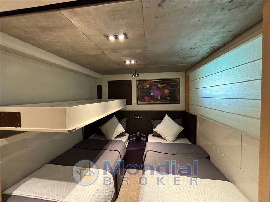 Notas internasCabina armatoriale matrimoniale con bagno; Cabina Vip con bagno. Due cabine ospiti, ognuna con bagno. Bagni con riscaldamento a pavimento. Due cabine equipaggio per 4 persone. Cucina con piano in vetroceramica, frigo, freezer, forno e microonde. Notas de la instrumentaciónRadar Raymarine 72 Mg, 2xMonitor per Raymarine (plotter,gps,radar,echo), Display multi Raymarine su fly, Autopilota (ripetuto su fly), Stazione vento, Tridata Raymarine, Vhf (in plancia e su fly), Joystick ZF.Nr 2 Generatori Kohler da 40Kw, Caricabatterie, Inverter per frigo e tv, Nr 22 Batterie. Notas de armamentoTVCC con 7 telecamere e monitor, Telefoni interni, Wifi, Antenna tv sat, Tv 20" in cabine ospiti e equipaggio, Tv con impianto hifi in cabina Vip e salone, Tv in sala da pranzo, Tv su fly, Nr 6 Luci subacquee.Dissalatore Idromar 230lt/h, Aria condizionata Super Tropic 170.000 BTU, Lavastoviglie, Cantinetta vini, Icemaker e frigorifero in salone e su fly, Lavatrice e asciugatrice in zona equipaggio Passerella idraulica telescopica, Piattaforma bagno idraulica, Nr 2 Winches ormeggio a prua, Tender, Jet ski. |