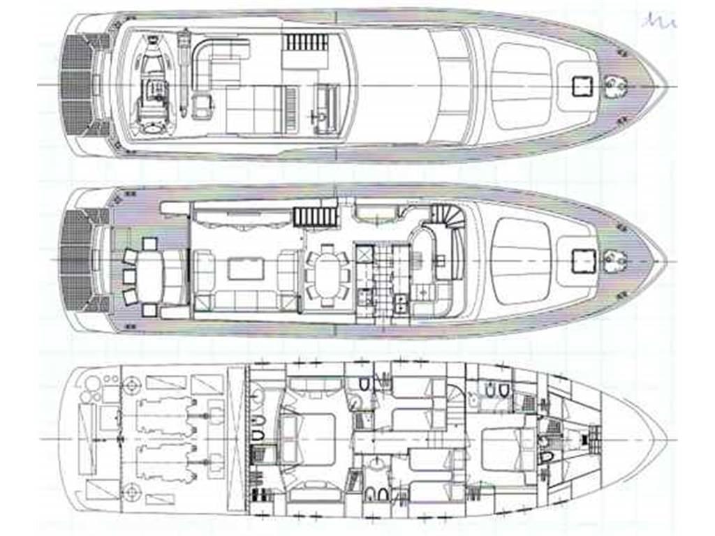 Notas internasNotas de la instrumentaciónAngolo barra, Antenna radar, Bussola, Contamiglia, Display, DSC vhf, Ecoscandaglio, Fax, GPS, Interfono, Pilota automatico, Plotter, Radar, Radio VHF, SSB.Notas de armamentoAllestimento tecnico e di coperta:Allarme motore, Allarme sentina, Ancora, Autogonfiabile, Camminamenti laterali in teak, Doccia esterna, Doppia timoneria, Elica di poppa - stern thruster, Elica di prua - bow thruster, Flap idraulici, Gruette per tender su fly, Indicatori Flaps, Lavaggio catena, Passerella, Pompa di sentina automatica, Pompa di sentina manuale, Porta ingresso, Porta laterale, Pozzetto Teak, Presa 220V banchina, Presa acqua banchina, Raddrizzatore, Salpa Ancore Elettrico, Scaletta da bagno, Tavolo pozzetto, Tromba, Winch tonneggio di prua. Dotazioni domestiche di bordo: Aria condizionata, Prese interne 12v, Prese interne 220v, Riscaldamento, WC marino elettrico. Dotazioni di sicurezza: Giubbetti di salvataggio. Intrattenimento: Altoparlanti, Impianto TV, Stereo, TV. Cucina ed elettrodomestici: Cucina, Forno, Frigorifero esterno, Frigorifero interno, Lavastoviglie. Tappezzerie: Bimini, Cuscineria completa, Tendalino. |