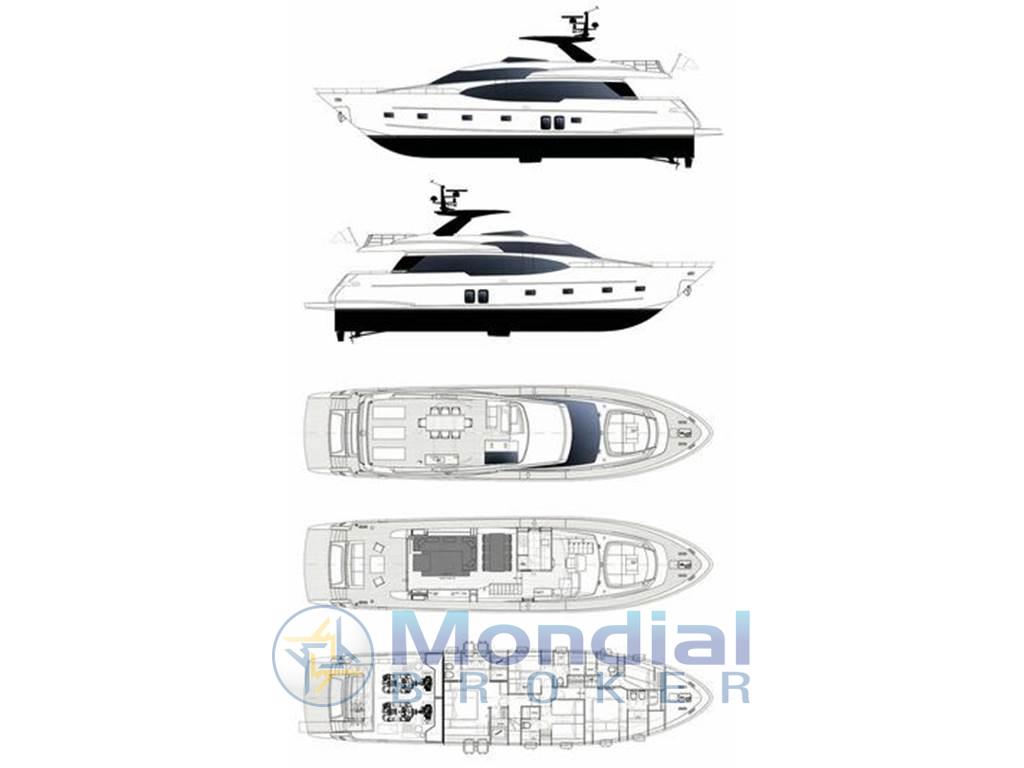 Notas internasNotas de la instrumentaciónAngolo barra (Raymarine Gold Package), Antenna radar, Bussola, Comando motori elettronico, Computer di bordo, DSC vhf, Ecoscandaglio, Pilota automatico, Plotter con antenna GPS, Radar, Radio VHF.Notas de armamentoAllestimento tecnico e di coperta:Allarme motore, Allarme sentina, Camminamenti laterali in teak, Doccia esterna, Elica di poppa - stern thruster, Elica di prua - bow thruster, Flap idraulici, Garage per tender, Hard top, Impianto antincendio, Indicatori Flaps, Lavaggio catena, Luci di cortesia, Luci subacquee, Passerella, Piattaforma, Pompa di sentina automatica, Pompa di sentina elettrica, Pompa di sentina manuale, Pozzetto Teak, Presa 220V banchina, Stabilizzatori (Zero Speed), 2 Winch tonneggio di poppa. Dotazioni domestiche di bordo: Aria condizionata, Clima reversibile, Dimmer per Luci, Impianto acque nere, Pavimento interno in legno, Prese interne 220v, Serbatoio Acque Nere, 5 WC marino elettrico. Intrattenimento: Antenna Satellitare TV, Decoder satellite, DVD, Home Theater, Impianto TV, Meccanismo saliscendi per TV, Stereo, 6 TV. Cucina ed elettrodomestici: Congelatore, Cucina, Forno, Frigorifero esterno, Frigorifero interno, ICE Maker, 2 Lavasciuga, Lavastoviglie, Piastra in vetroceramica, Winecooler. Tappezzerie: Copripozzetto, Cuscineria completa, Teli copri finestra, Telo copriconsolle, Tenda Elettrica (Sun awning for the stern area of fly behind hard top), Tendalino (Bow bimini top with s/steel poles). |