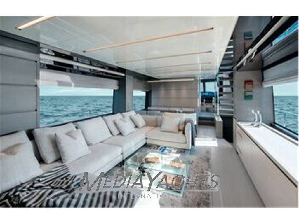 Notas internasOn the main decklarge and bright lounge: living area with "C" shaped sofa and dining area with glass table and 8 seats. On the lower deck master cabin amidships with ensuite bathroom and shower box, VIP cabin with ensuite bathroom and shower box, twin cabin with bathroom and shower box, single cabin with bathroom; crew cabins with separate access.