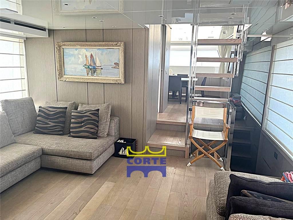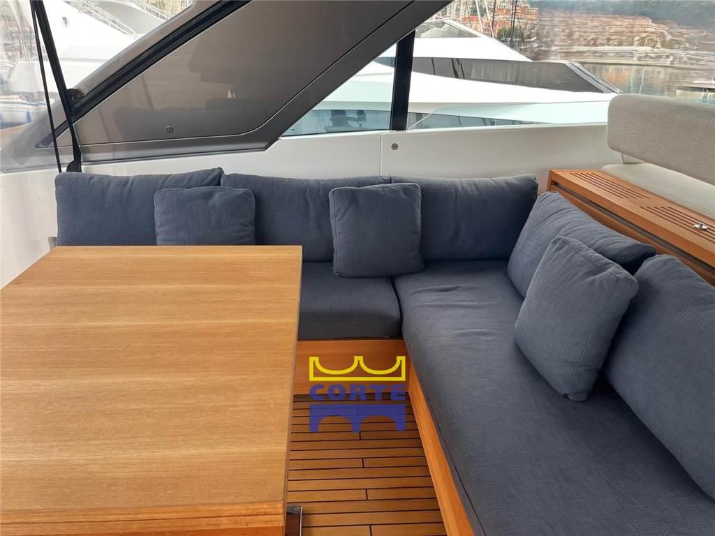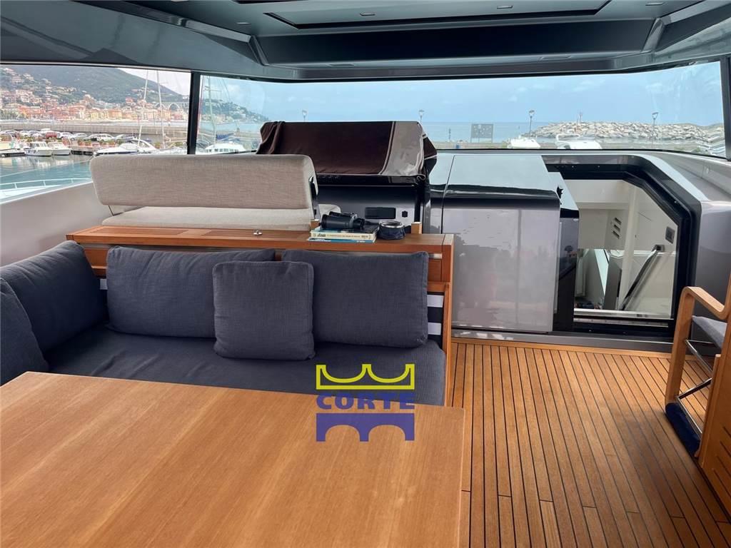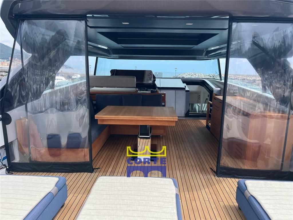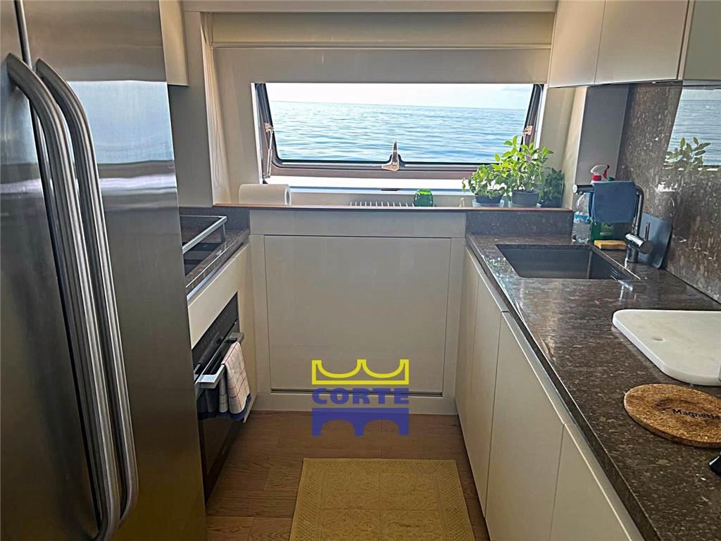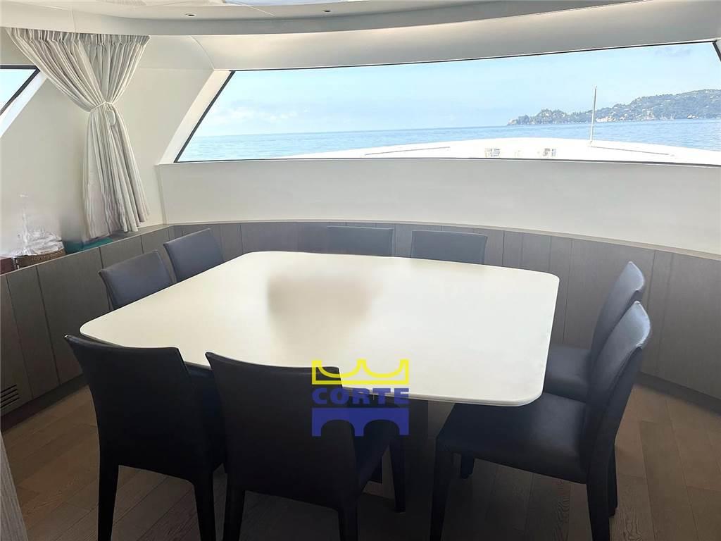 Notas internasIl main deck è un unico open-space perfettamente integrato con l’area di poppa e il pozzetto. Ampio salone con divano a L e tavolo fumo. Cucina separata con passa vivande nella sala pranzo attrezzata con lavello, piano induzione, frigorifero doppio con freezer, forno, lavastoviglie. Zona pranzo con tavolo, sedie e mobili contenitori. Il layout presenta 4 cabine, una armatoriale matrimoniale a centro barca a tutto baglio, una cabina matrimoniale Vip e due cabine ospiti con due letti separati. Ogni cabina ha un proprio bagno separato con box doccia e lavabi in marmo. Cabina crew con due letti a castello e bagno. Il fly è composto da divano a L, ampio tavolo con sedute e postazioni prendisole. L’equipaggio alloggia a poppa, nel pruavia della sala macchine e con accesso diretto al pozzetto.
