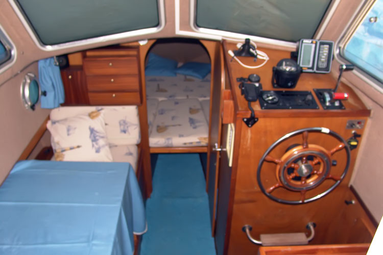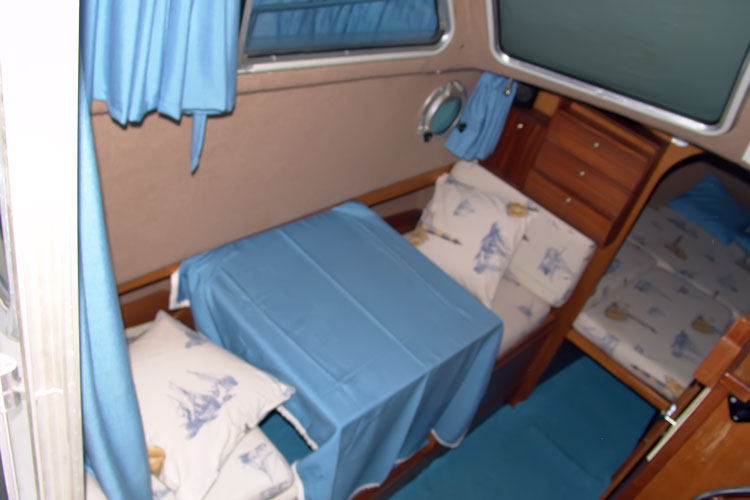 Notas internasDebajo de la cubierta hay una cabina de proa separada con cama de matrimonio a murata armario "V" y la capa; baño con inodoro, lavabo y closet; salón con cofres con mesa convertible en una cama