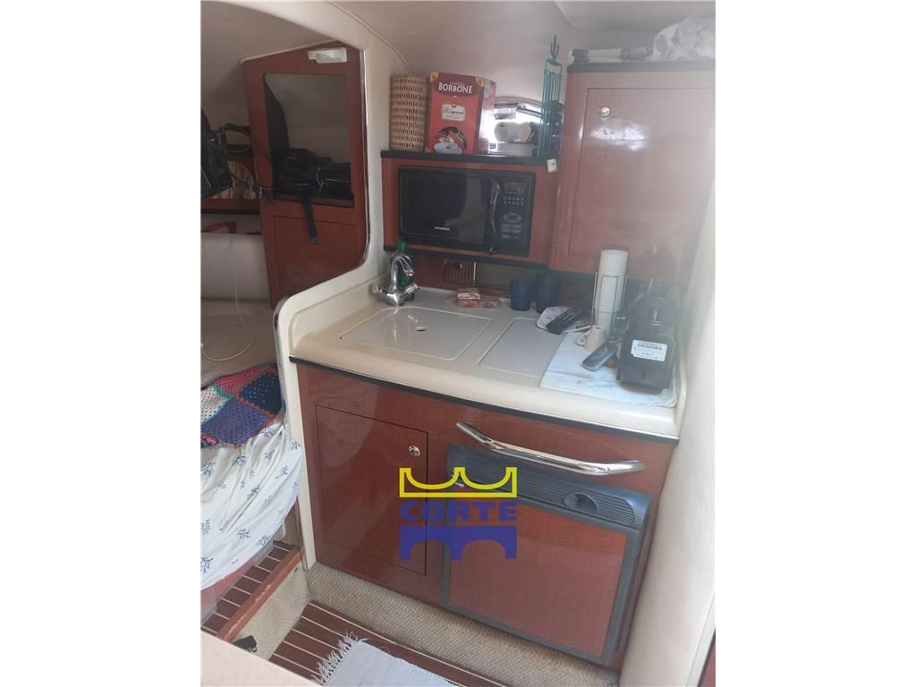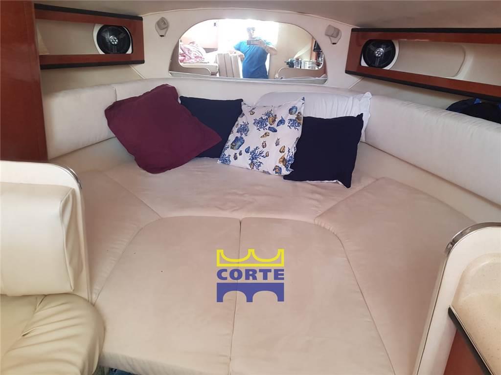 Notas internasCabina ospiti a poppa Bagno separato cpn WC elettrico, lavandino e doccia Cucinotto attrezzato Dinette esterna trasformabile in prendisole Notas de la instrumentaciónAngolo barra, Bussola, Contamiglia, Ecoscandaglio, GPS (Garmin 12''), Radio VHF.Notas de armamentoAllestimento tecnico e di coperta:Allarme motore, Allarme sentina, Ancora, Doccia esterna (con acqua calda), Faro orientabile, Flap idraulici, Impianto antincendio, Lavandino nel Pozzetto, Luci di cortesia, 2 Luci subacquee, Passerella (elettro idraulica), Piattaforma (maggiorata), Pompa di sentina elettrica, Pompa di sentina manuale, Porta ingresso, Presa 220V banchina, Rollbar, Salpa Ancore Elettrico, Scaletta da bagno, Tavolo pozzetto, Tromba, Winch tonneggio di prua. Dotazioni domestiche di bordo: Aria condizionata, Clima reversibile, Prese interne 12v, Prese interne 220v, Serbatoio Acque Nere, WC marino elettrico. Intrattenimento: Altoparlanti, Digitale Terrestre, Impianto TV, Radio AM/FM, Stereo, TV. Cucina ed elettrodomestici: Frigorifero esterno, Frigorifero interno, Microonde, Piastra in vetroceramica. Tappezzerie: Bimini, Copriscafo, Cuscineria completa. |
