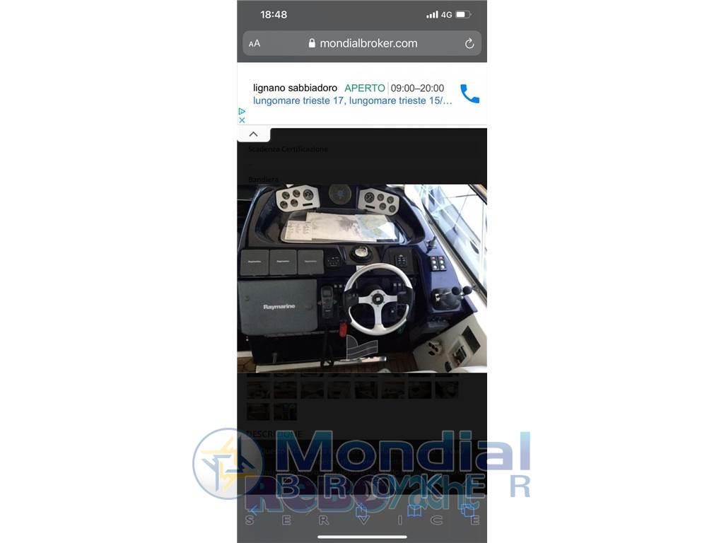 Notas internasNotas de la instrumentaciónAutoclave, Caricabatterie, Contamiglia, Doccia esterna, Ecoscandaglio, Elica di prua - bow thruster, Faro orientabile, Flap elettrici, Hard top, Indicatori Flaps, Passerella (idraulica), Piattaforma (teak), Pilota automatico, Plotter con antenna GPS, Pozzetto Teak, Presa acqua banchina, Radar, Radio VHF, Tavolo pozzettoNotas de armamentoAltoparlanti, Aria condizionata, Boiler, Copripozzetto, Cuscineria di poppa, Cuscineria di prua, Cuscineria Pozzetto, Dotazioni di sicurezza entro 50 miglia, Fornello, Forno, Frigorifero esterno, Frigorifero interno, Impianto acque nere, Impianto TV, Pavimento interno in legno, Serbatoio Acque Nere, Stereo, Teli chiusura T-Top, Teli copri finestra, TV, Zattera di salvataggio, Grill e lavandino pozzetto |