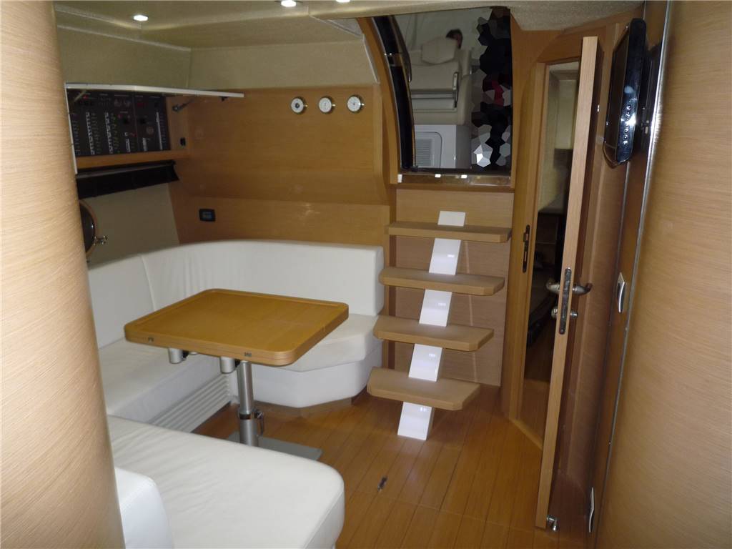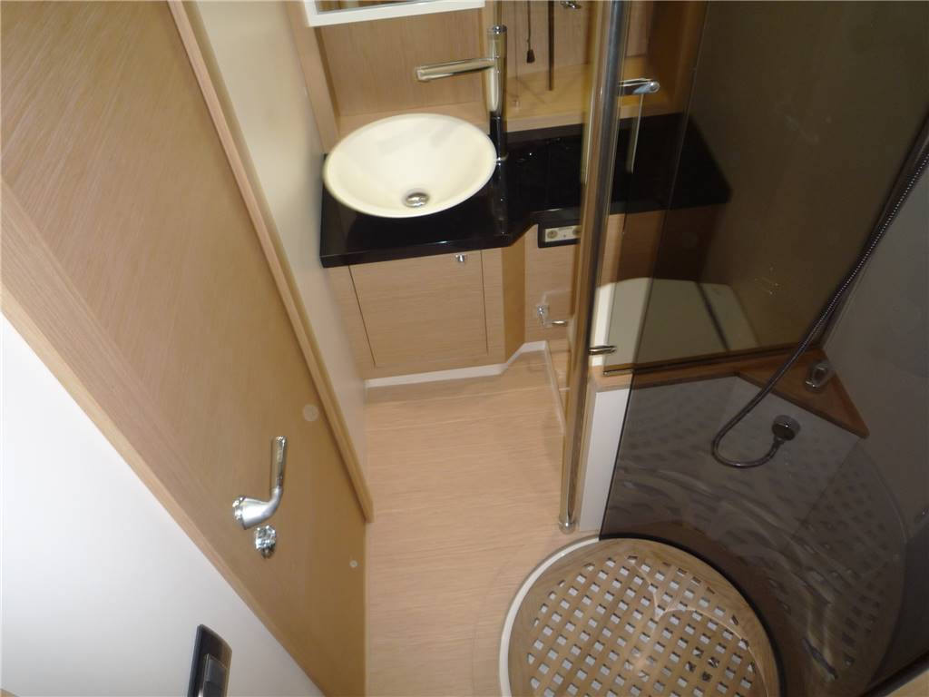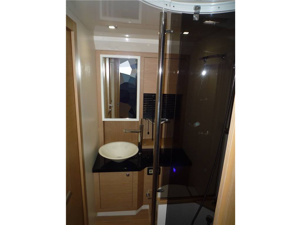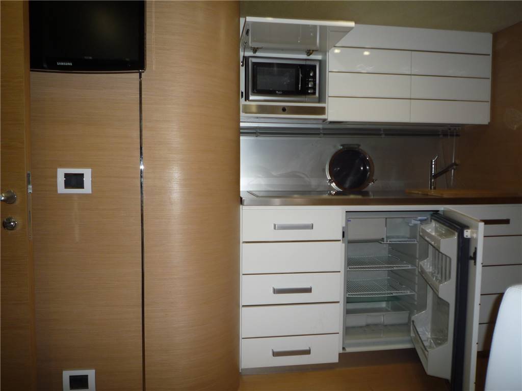 Notas internasPozzetto in teak con mobile bar completo di lavello , frigo, icemaker, fuochi in vetroceramica , grande tavolo in teak con divano ad U per 8 persone, tv Lcd da 20' con congegno motorizzato a scomparsa, ampio prendisole . Interni moderni in rovere chiaro e parquet chiaro. Cabina vip a prua con letto matrimoniale a isola sdoppiabile in 2 singoli e bagno privato con accesso anche esterno e con elegante box doccia rivestito con mosaico Bisazza - La grande dinette e' composta da un grande divano a C rivestito in stoffa chiara + 2 puff in ugual tessuto e con tavolo sdoppiabile e abbattibile trasformabile in doppio letto ,e con contrapposta con cucina completa con pensili, mobile dispensa doppio lavello, frigo, piano cottura con 3 fuochi in vetroceramica, Forno a Micro-onde e a parete un tv Lcd - A poppa la grande e spaziosa cabina armatoriale con letto a isola e bagno privato con box doccia -