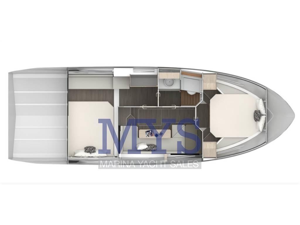 Notas internasCABINA POPPA: Letto matrimoniale con materasso e gavoni sottostanti per stivaggio bagagli - testata letto tappezzata con portaoggetti - cassapanca in noce - ampio armadio guardaroba in noce - pavimento in moquette - oblò in acciaio inox - tende in tessuto - luci di lettura - faretti alogeni - presa corrente. BAGNO: WC marino - doccia con carabottino in teak, saliscendi, miscelatore e diffusore - porta doccia in plexiglass trasparente - mobile lavello in noce con top laccato - lavello in ceramica con miscelatore - pensile con ante a specchio - tenda veneziana in legno - oblò in acciaio inox - doppio ingresso da cabina poppa e da dinette - presa corrente - faretti alogeni stagni - accessori bagno. Notas de la instrumentaciónVANO MOTORI: nr.2 Serbatoi carburante da 230 l cad. - sonda carburante dialogante con sistema EVC Volvo - valvole intercettazione carburante - filtri con separatore acqua/carburante - flaps idraulici - impianto antincendio: estintore ad attivazione manuale/automaticaIMPIANTO IDRAULICO: Serbatoio acqua da 286 l - autoclave con filtro - boiler da 20 l motori/elettrico 230 V - pompe di sentina elettrica ad azionamento manuale/ automatico in dinette e vano motori. IMPIANTO ACQUE NERE: Serbatoio da 110 l - pompa di scarico - possibilità di svuotamento del serbatoio tramite suzione da banchina - carico dei WC con acqua dolce . IMPIANTO ELETTRICO: Gruppo 3 batterie 100 Ah/12V (motori e servizi) - carica batterie automatico - presa banchina 230V - staccabatterie elettronici e manuali di emergenza - impianto di bordo 12 V. Notas de armamentoCOPERTA: Musone di prua - verricello salpancora elettrico - ancora 15 Kg e catena acciaio zincato calibro 8mm 50m - cavetto di sicurezza ancora - pulpito in acciaio inox con gradino in teak massello - presa per svuotamento serbatoio acque nere da banchina - bitte a prua, centro barca e poppa in acciaio inox - prendisole di prua con tientibene in acciaio inox - doppio tergicristallo elettrico con lavavetri.POZZETTO: Parabrezza frontale e laterale in cristallo - hard top con parte mobile in vetroresina e movimentazione elettrica - luci di via e di fonda - mobile pozzetto completo di top in cristallo, lavello in acciaio inox con miscelatore e ante in teak - luci di cortesia - vano stivaggio con chiusura a compressione e ispezione sala macchine - zona centrale con ampio divano - chaise longue - cuscineria completa, anti UV e resistente all’acqua - tavolo asportabile con top in teak - luci sala macchine - faretti alogeni stagni hard top - porta scorrevole ingresso dinette - casse stereo. PLANCETTA: rivestimento in teak - scaletta bagno in acciaio inox a scomparsa - luci di cortesia - doccia caldo/ freddo. CONSOLLE: Pannello cruscotto tridimensionale verniciato champagne - bussola - strumentazione motori completa di: contagiri analogico con display digitale, pressione olio, indicatori temperatura acqua, voltmetri, allarme acustico avaria per motori, indicatore livello carburante, indicatori trim piedi motori , pulsanti utenze elettriche di coperta con simbolo retroilluminato - comando motori elettronici Volvo Penta - volante coordinato con la cuscineria e regolabile in altezza - sedile guida avvolgente con ribaltina- comando flaps elettroidraulici - comando regolazione trim piede motore - comando manuale impianto antincendio con tirettti intercettazione carburante- presa 12 V. |