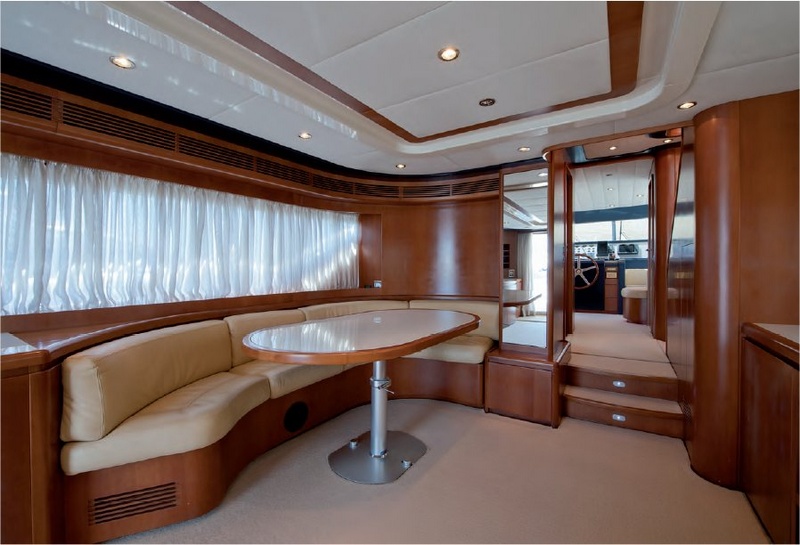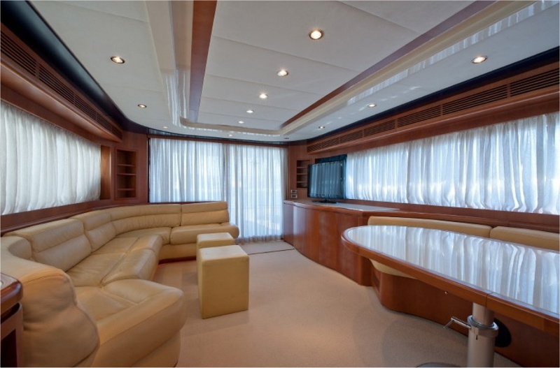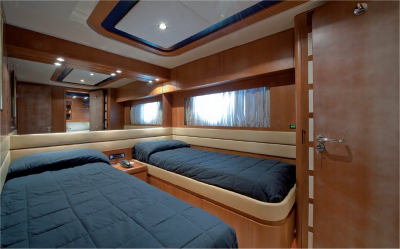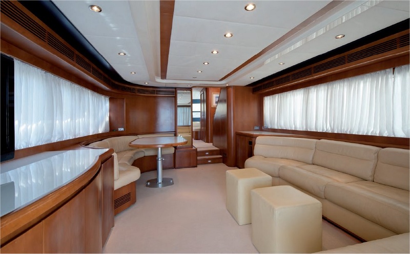 Notas internasPuente de cubierta:-sofá y almacenamiento de unidades de estar-comedor con mesa, sofá y puf-pasillo con escalera subir y salir en puerto lateral paseo DS-local cocina vitrocerámica, nevera/congelador, lavavajillas, horno y salida Puerto de pasillo lateral SN-baño-dirección zona con sofás y escaleras hasta las cabañas de la cubierta. CUBIERTA inferior: - cabina de armador en el centro de la embarcación con baño y walk in closet-VIP cabina en proa, baño completo y vestidor - dos camarotes dobles con camas planas, cada una con privados baño Interior nogal satinado, sofás de cuero. -Cabina de tripulación en el arco con dos literas y baño.