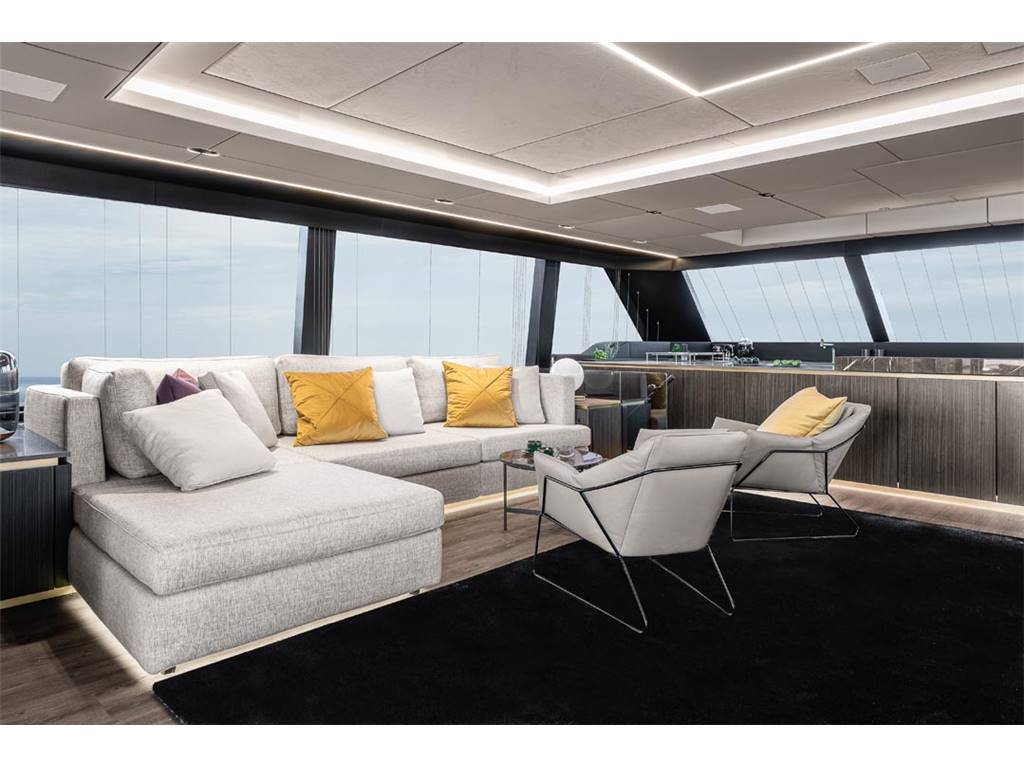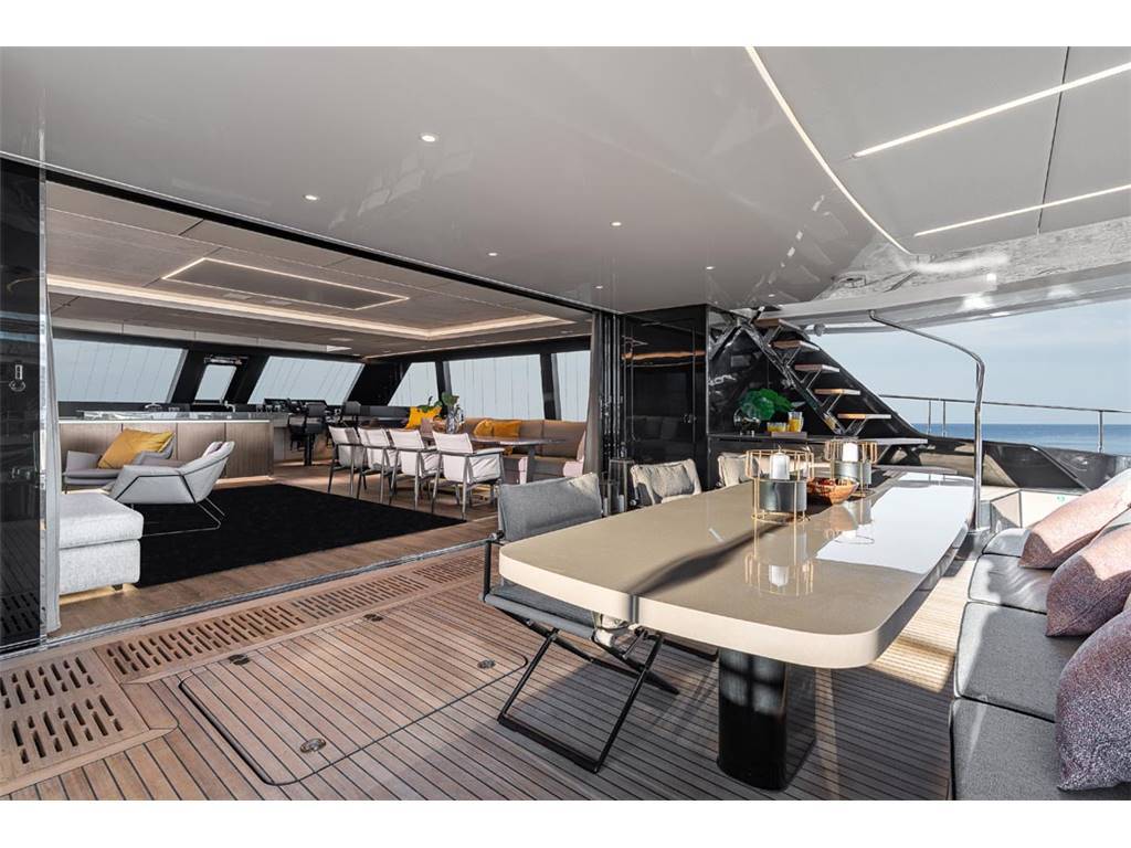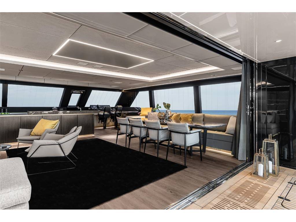 Notas internasIl catamarano a motore di lusso Sunreef 60 presenta un vasto salone che si fonde perfettamente con un ampio pozzetto di poppa e si apre su una comoda terrazza anteriore, offrendo molto spazio per pranzare e rilassarsi. Il design unico degli interni dello yacht è un mix di materiali naturali e un'elegante tavolozza di colori antracite, grigio e terra. Con le sue 3 eleganti cabine doppie, ognuna con bagno privato splendidamente arredate, e offre sistemazioni confortevoli per sei ospiti e 3 persone di equipaggio