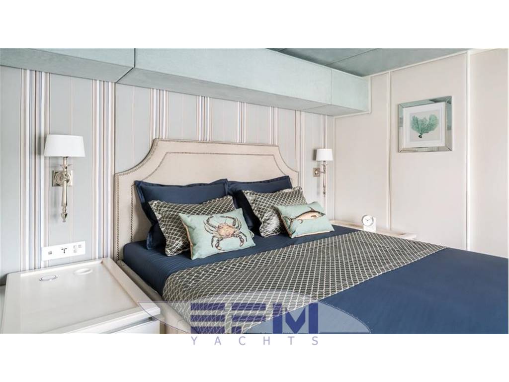 Notas internasThe custom interior accommodation areas are finished in “Hampton style”, to create a luxurious but homely feel and is very light and bright. The main saloon has high ceilings and is totally open with full-height surround windows, and all cabins have large living spaces, high end finishes and large in-hull windows. Main Saloon: Large, deep sofas line both sides of the main saloon with dinning for 10 to port, and casual seating to starboard. The finishing’s throughout offer a luxurious Hamptons feel, whilst providing casual comfort for on-board living. The large, tinted surrounding windows have electrically controlled blinds and the entire area in Air Conditioned. Forward in the saloon, is the galley and bar. These large spaces provide good food preparation and service areas, tea/ coffee service as well as socialising whilst looking forward out towards the on-coming view! Forward of the saloon is also a navigation station to Starboard, providing system control area, suitable navigation vision etc. This area has a custom navigation seat for proper watch keeping at sea. The four corners of the main deck provide access via stairs to the accommodation areas in the hulls. Large glass and stainless-steel sliding doors open the width of the saloon to connect the aft cockpit to the interior, creating one large entertaining space. Cabin Layout: 2 x VIP Mid-ships double cabins with ensuite and enclosed showers plus walk-in robes 2 x Forward double cabins with ensuite and enclosed showers 1 x Twin bed cabin (Starboard aft) with ensuite and enclosed shower 1 x triple crew cabin (Port aft) with ensuite and shower. All the guest cabins share the same Hampton’s detailing and finishing.The spaciousness of the cabins and bathrooms allow more comfort for longer stays- hence further enjoyment. Cabin features include leather top bed side tables with 230V international power sockets, USB charging sockets, carpets, retractable blinds for hull windows and carpet throughout. Ensuites: The 5 guest cabins all have ensuite bathrooms. The ensuites are all-white throughout and feature pearl white mosaic tiles and large Hamptons mirrors. The enclosed shower dividers are toughened glass and all tap ware, towel rails etc are bright chrome and the showers are adjustable on vertical rails. Tecma fresh water flush heads installed throughout Air Conditioning: Frigomar 186,000 BTU AC System with 3 inverter chiller units and 10 air handlers with digital control in each area of the vessel. The system can run to cool/ heat the air in the vessel Entertainment: Throughout the main saloon, cockpit and flybridge there are speakers fitted to Sonos Surround 5.1 sound system. The main saloon has a LED 55” TV on lift, located in the bar with Glomex Omni-directional aerial Galley: The galley features all modern conveniences including Miele appliances, ample storage and easy clean marble benchtops. Galley features and equipment as follows: Michaelangelo Marble throughout Miele G 6620 Dishwasher Miele KM 6324-1 Electric Stove cook top and H 2661-1BP Electric oven Miele M 6262 TC Microwave oven Liebherr UIK 1424 Refrigerator/ Freezer Cooking equipment, Pantry storage equipment Serving platters and servicing equipment and All cutlery and crockery onboard included The “butler’s pantry”- storage room complements the galley with additional storage and refrigeration. (aft port hull, access from main saloon) See below: 3 x Liebherr IK 3520 Fridges and 2 x Liebherr SIGN 3524 Large door freezers Miele WCI330 P-wash XL Washing machine and Miele TKG850 WP Drier BOSCH Vacuum cleaner Water Capacity: 2 x 800 L with level indicators Water maker: 2 x 280 L/H Sea Recovery units positioned in each hull (Serviced Oct 2019) and runs on inverter 230V power if required Hot Water Heater: 2 x Quick 1200W/ 230V 80L boilers Fresh Water Pumps: 2 x Gianneschi Ecoinox 24V 70/ minute pumps Notas de la instrumentaciónElectrical SystemElectrical System is made up of an AC and DC system to run all equipment onboard. AC System - 230V, 50hz, single phase. Genset, inverter and shore power for AC power with AC switch board Chargers-Victron Energy 3 x 24v/ 100 amp Inverters- Victron Energy Phoenix 3 x 220v/ 50hz/ 5000w Shore Power Connection- 2 x 2 outlet (one in each hull) 63amp with suitable cables Universal power sockets throughout vessel DC System- 24V system with switch board Batteries- 12 x Victron Energy Lithium-Ion 24V/180Ah Engine Start Batteries: 2 x Odyssey Start Battery chargers- 1 x each bank- Victron Blue Smart IP67 Charger Thruster Batteries- 4 x 24V/200Ah Alternators- Each engine has a 24V/ 150amp Monitoring/ Automation System- Wago System for monitoring of tanks with alarm, black water valve discharge control, battery monitoring and low-level alarm and engine room temperature The Wago BCS (Boat Control System) is operated by 2 x Samsung Wifi connected tablets that will also control interior and exterior lighting and dimmers. Electronics B&G Triton Navigation electronics package. The system comprises of the following equipment: B&G Zeus 16” Glass Helm Multifunction display on Starboard helm B&G Zeus 16” Glass Helm Multifunction display in saloon navigation area B&G Triton processor and all sensors (MH wind gear, speed/ depth sensors) B&G Triton 2 display on port helm B&G Triton autopilot with control on starboard helm and saloon/ navigation area plus remote 2 x Plastimo helm compasses mounted on each flybridge helm station Library of cruising books for Mediterranean, Croatia, Greece, Caribbean and curtesy flags to suit. 2 x external cameras with night vision capability Communications: Communications onboard are as follows: B&G H90 VHF handset on Starboard helm and in saloon helm stations and 2 x HH VHF radios Iridium Go satellite communication Ships laptop computer and printer and 4G/LTE wifi and aerial Mechanical Engine Make: 2 x John Deere Engine description: 4045AFM85 260hp diesel engines Engine hours: 1000 hrs Fuel Capacit