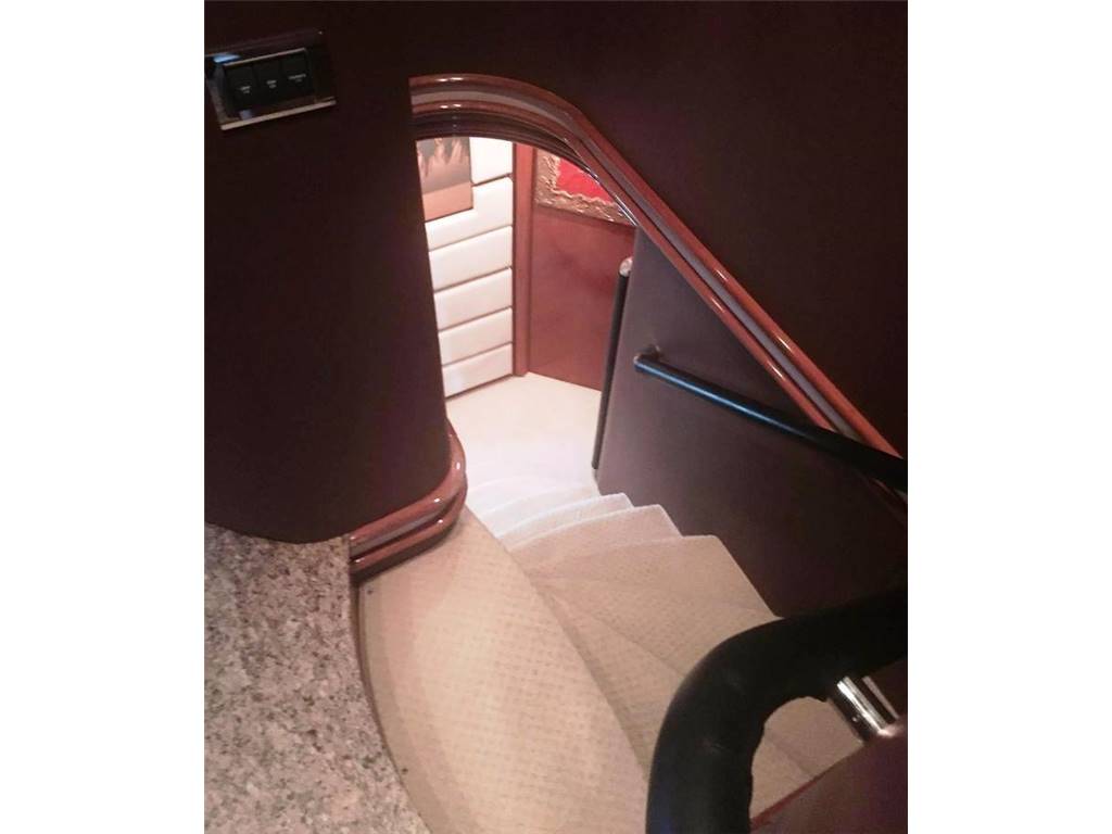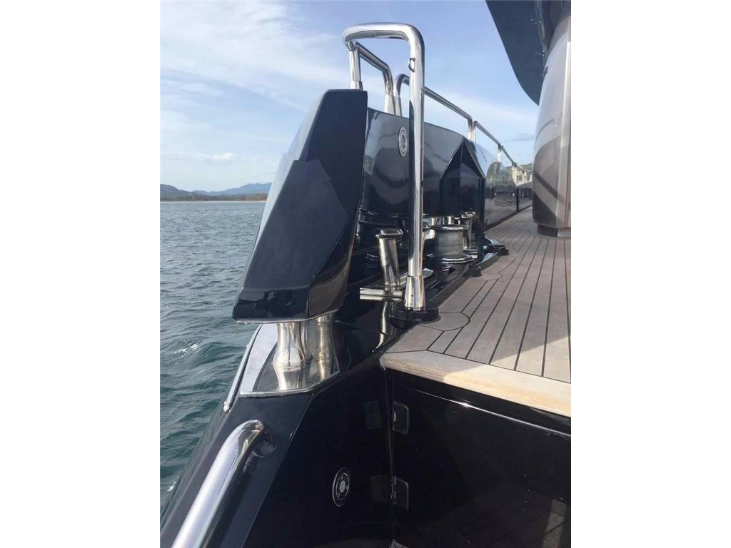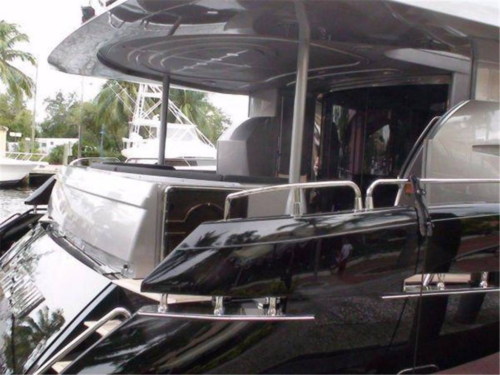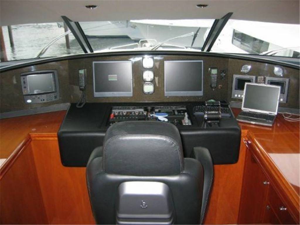 Notas internasNumber of cabins: 4 Master Suite: ? On Deck-forward-full beam ? King berth w/storage below ? Settee ? 42" Plasma TV ? Hi-fi surround sound system w/CD/DVD/radio ? Walk-in closet ? Safe ? Ample drawer storage and cabinets ? Lower level dressing room ? En suite head w/shower-lower level VIP Stateroom: ? Lower deck-amidship-full beam ? Centerline king berth w/storage below ? Settee ? 42" Plasma TV ? Hi-fi surround sound system w/CD/DVD/Radio ? Walk-in closet ? Ample drawer storage and cabinets ? En suite head w/shower Guest Staterooms (P & S): ? Twin berths w/storage below ? Night stand between berths ? 15" LCD TV ? DVD/CD player ? Hanging locker ? En suite head w/shower ? Port cabin features additional pullman berth Crew Quarters-Aft: ? Accommodations for up to 4 w/port & starboard twin berth cabins each w/head and shower ? Crew lounge area 15" LCD TV, CD & DVD Notas de la instrumentaciónPilothouse Helm? Furuno NavNet radar/chartplotter GPS with color displays ? Autopilot ? Dual station VHF ? Multiview speed & depth displays ? Electronic compass ? MTU blue line engine displays ? Rudder angle indicator ? Portable remote control for engines & thrusters ? Hydraulic power steering ? Emergency steering Deck Equipment ? 2 x Muir 4500 hydraulic anchor windlasses ? 2 x Stokes HHR 113 kg galvanized anchors w/85m & 95m chain ? Automatic anchor & chain salt water wash down ? 2 x Hawses w/roller, chain stoppers and devil's claw ? 2 x Muir hydraulic capstans (aft) ? Fore deck sun pad and seating ? Hydraulic passerelle ? Hydraulic swim platform-Major hydraulic overhaul, 2015 ? Hot & cold hand held swim platform shower ? Swim ladder ? Stern garage w/power operated door for tender storage ? Stern dive locker with power operated door ? Stainless steel caprails added throughout ? Misting system on fly bridge ? Wash down system, fore, aft and fly bridge decks ? Third dome added for extra AV equipment including Playstation3/Wii games throughout ? Nautica International 16 Jet RIB-160 hp ? Seadoo GTI jet ski ? Life rafts ? Teak cockpit, side decks, stairs, wheelhouse, fly bridge & swim platform Mechanical ? Twin MTU V16's @2000 hp each ? Triplex fuel filters to main engines ? Fuel filters to generators ? Manual fuel shut-off valves ? Engine stop warning ? Engine room sound insulation ? Fuel tank level indicator ? Hydraulic Trim Tabs ? Hydraulic power steering ? Emergency steering ? Wesmar hydraulic bow and stern thrusters @50 hp each ? Wesmar stabilizers ? Oil change system ? Fire alarm system ? FM200 & CO2 Fire extinguishing systems ? 14 x Hand held fire extinguishing-(up to date) ? Air Conditioning ? Automatic bilge pumps ? Smoke alarm system with central alarm and sensors through out the yacht ? Antifouling on bottom - regularly maintained ? All systems inspected and up to date Electrical ? US Spec electrical ? 2 x 40kW 60 hz Kohler gensets ? Atlas Shore Power conversion system ? 80 AMP battery charger ? 2 x 24V, 95 AMP battery chargers ? Emergency battery cross connection system ? 24V Start-up batteries ? Side deck lighting Notas de armamentoUpgrades? Antifouling on bottom - regularly maintained ? Cruisair chilled water air conditioning upgraded throughout to handle dark hull color. Extra A/C chiller added to engine room ? Stainless steel caprails added throughout ? Contemporary style exterior cushions ? All soft goods replaced including new leather handrails inside ? Misting system added to flybridge ? Fresh water washdown system added to flybridge Salon ? Cherry interior ? Cream carpeting and cream settees ? Wet bar ? Hi/lo 50" TV w/Hi-fi surround sound, CD/DVD/radio ? Formal dining area forward w/seating for 8 ? Day Head Galley ? On deck galley ? Ice maker ? 2 x Refrigerators ? 3 x Freezers ? Gaggenau Microwave ? Gaggenau Electric cooktop and oven ? Exhaust fan ? Garbage disposal ? 2 x Miele dishwasher ? Miele washer & dryer ? Platinum table service for 12 Fly Bridge ? Acessed via teak-laid stairway from aft deck ? Fly Bridge misting system in radar arch ? Large sunpad/lounge (P) ? C-settee w/table (S) ? Wet bar w/electric ceramic grill, refrigerator and ice maker ? Teak decking ? Fresh water deck wash outlet ? Helm station w/dual helm chairs (S) and bench seating (P) ? Radio/CD player with remote keypad at flybridge helm & 2 speakers in wheelhouse |