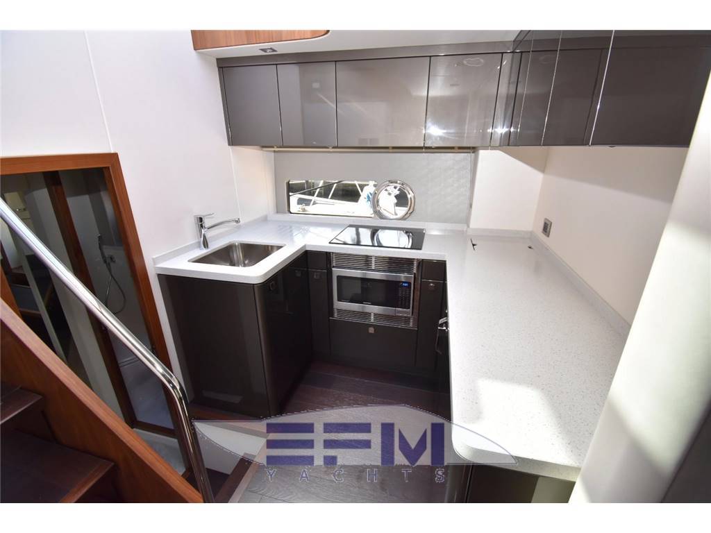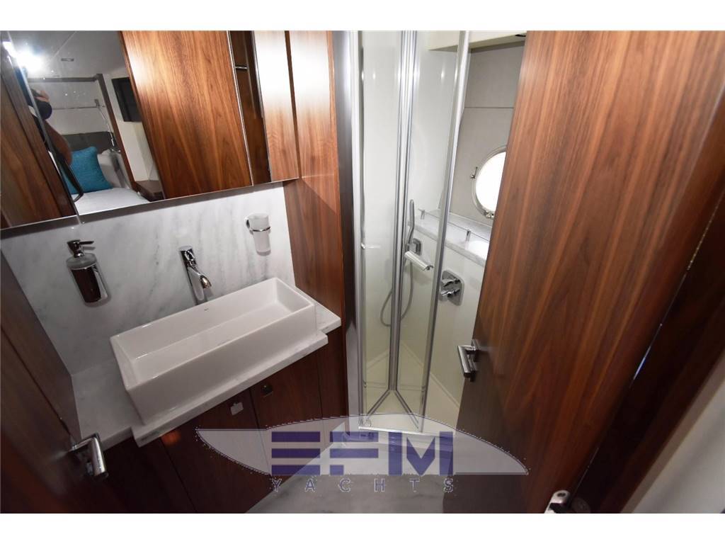 Notas internasNumber of cabins: 3 Number of heads: 2 Master Aft Cabin • Queen centerline berth w/storage below • Outboard cabinets • Night stands • Bedside wall lamps • Settee with table • Hanging locker w/mirrored door • Panoramic windows with opening portholes • Samsung 40" TV w/Fusion Blu-Ray CD/DVD/radio • En suite head w/shower Starboard Guest Cabin • Twin over/under berths w/storage below • 24v Reading lights • Hanging locker with mirrored door • Opening porthole w/screen and curtain • 24” TV w/Fusion DVD/CD/radio Forward VIP Guest Cabin • Centerline double berth w/storage below • 2 x 24v reading lights • Outboard cabinets • Hanging locker w/mirrored door • 24v Overhead lighting • Opening portholes and curtains • Deck hatch • Double AC socket • 24” TV w/Fusion DVD/CD/radio • En suite head w/shower shared w/starboard guest cabin Crew Quarters aft • Twin berth • Head and shower Notas de la instrumentaciónHelm• Upholstered helm seats • Volvo Penta Joystick steering • Sports steering wheel • Simrad Radar/Plotter • Simrad Autopilot • Simrad VHF radio • Simrad • Volvo Penta color display for engines • Volvo Penta IPS low speed option • Simrad Speed/Depth • Jabsco searchlight • Compass • Horn • Trim tab controls Mechanical • Twin Volvo Penta IPS950 @725 hp each • Sleipner Bow Thruster • Aluminium fuel tanks with electric sender units • Fuel filters/water separators to engines • Fuel filters/water separators to generators • Automatic bilge and flood pumps with high-level alarms • Power steering – hydraulic control steering • Engine room fire extinguishing system (FM200) • Air-Conditioning Electrical • 11.5kW Onan generator • AC dockside connection • Main DC and AC electrical circuits protected by re-settable circuit breakers • Systems monitoring panel • Galvanic isolator • 6 x 24v batteries for engine start-up • 4 x 24v batteries for domestic power • 2 x 12v batteries for generator • Alternator split-charging system • 24v Battery charger • 12v Battery charger • Water heater Notas de armamentoDeck salon• U-Settee w/storage below • Dining table • Samsung 40" TV, Radio/CD/DVD/w/Bluetooth • 24v Overhead lighting • Stainless steel sliding cockpit door to aft cockpit w/drop down to create a completely open platform • Teak deck Aft Cockpit • Docking station w/2nd Joystick, multi panel and • Large sunpad • Tender garage • Wetbar w/ Waeco refrigerator, Vitrifrigo Icemaker, Kenyon BBQ grill • Upholstered U-settee with storage below • Teak cockpit table on stainless steel leg • Stern safety gate • Engine room access hatch • 24v Overhead lighting • 24v Low-level lighting • Teak-laid cockpit and steps • Cockpit Sunbrella enclosure w/windows • Electric retractable canopy Galley • Galley down-(P) • Satin finish American black walnut joinery and satin wenge sole • Waeco refrigerator/freezer • Plastimo 4 burner touch control cooktop • Bosch exhaust fan • Sharp microwave oven • 6 place setting-china and flatware • Cabinet and drawer storage • Opening porthole w/screen • Dinette w/settee (S) • 24" TV/DVD/CD/radio Deck • Lewmar 25kg Delta anchor and 60m chain (galvanized) • Lewmar winch and capstan w/deck and helm controls • Stemhead roller and anchor stop • Fresh water wash down system (fore & aft deck) • Fore deck Sunpad w/folding back rest • 16 x Low level LED side deck lights (8 per side) • Hydraulic lifting platform • SS swim ladder • Tender recovery roller system • Hand held swim shower |