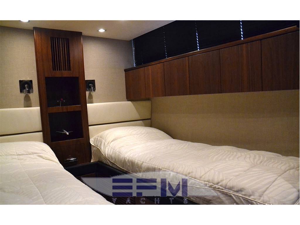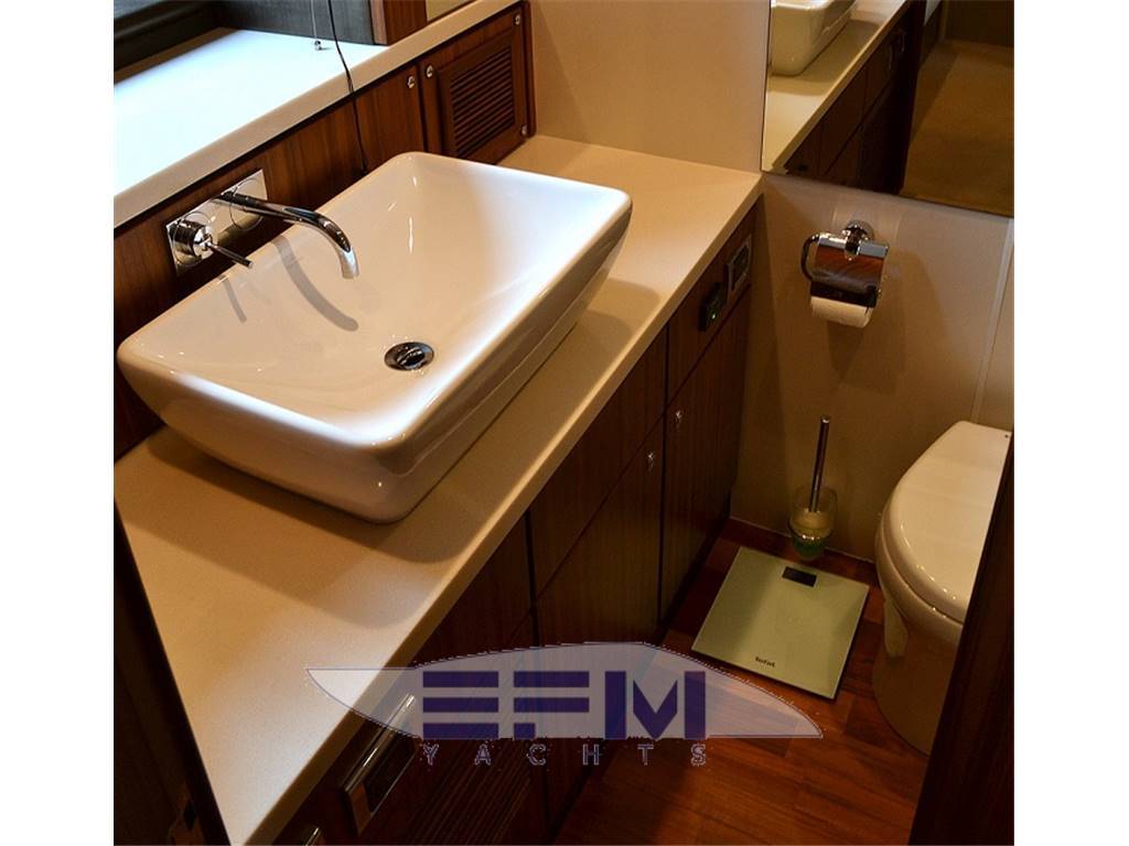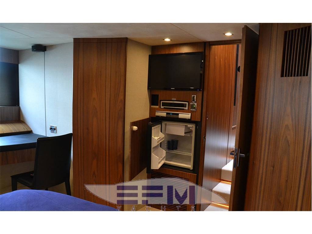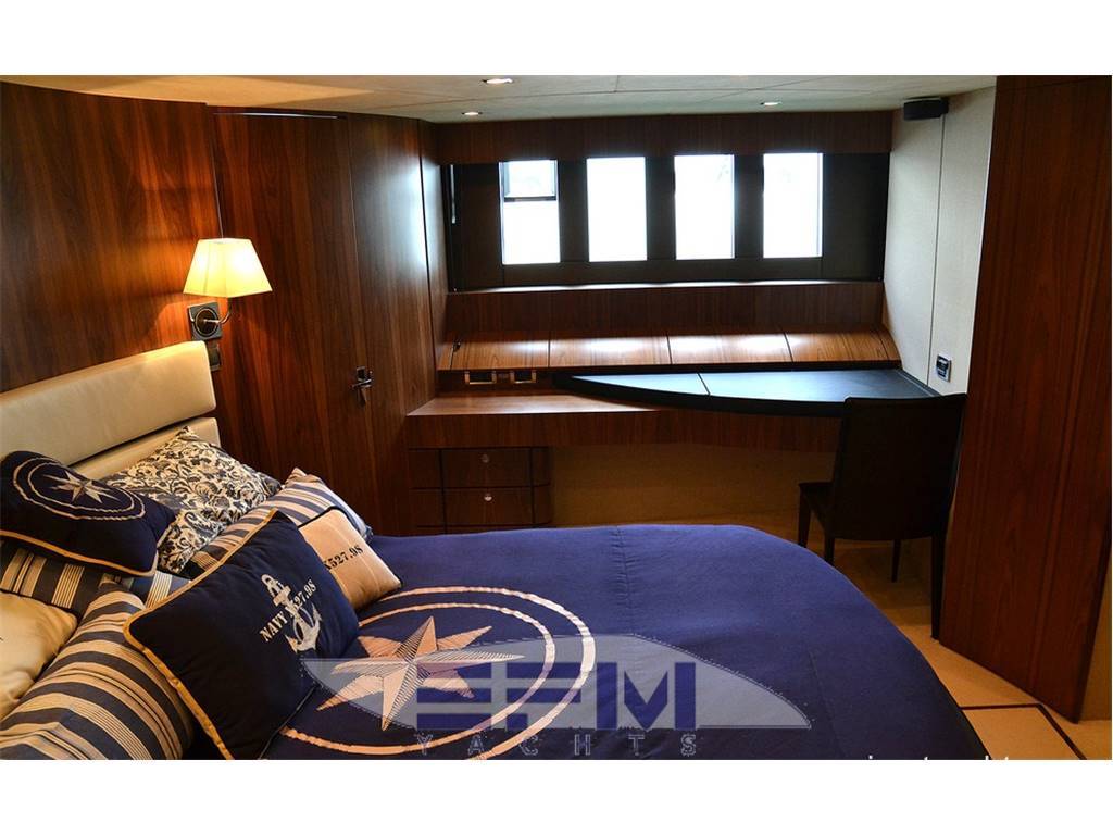 Notas internasCrew cabins 1 Guest Berths 8 Crew Berths 2 Guest Head 3 Crew Head 1 Notas de la instrumentación• Full Electronic instruments: GPS / Radar / Chartplotter connected to autopilot• Repeater of equipment, controls and engine electronics on flybridge • Satellite TV (KVH M7) with decoders in salon and master cabin • Waxwork TV antenna on roll bar • Home entertainment Bang & Olufsen • LEd TV in salon 40” TV Cinema System • LCD TV in salon and all cabins (15” LCD ? DVD / CD / radio in crew cabin, bow VIP cabin, cabins stardoard and port sides) • 37” LCD ?? Notas de armamentoAdditional options• Seakeeper Zero-Speed • Bow thruster 20 mhp • 2 x generator Onan 22.5Kw • Tropic air conditioner (reversible) • Underwater lights • Telescopic electrohydraulic gangway with remote control, • Crane on flybridge • Tender Williams 325 Jet Rib on swimming platform • Jetski Sea-Doo GTI 4-TEC on fly • Interior with matt nut • Tent in aft cockpit • Sofa upholstered with leather (Venezia White) • Cushions on fly (colour - "wet sand") • Bimini tent on fly, electrically operated • Third control panel (remote), for engines • Monitor Garmin in crew cabin • 2 ? video cameras (in engine room, cockpit) • Wine cooler in galley • L-shaped sofa in salon • Ewresh water maker • Second refrigerator on fly • Cooler box in master cabin |