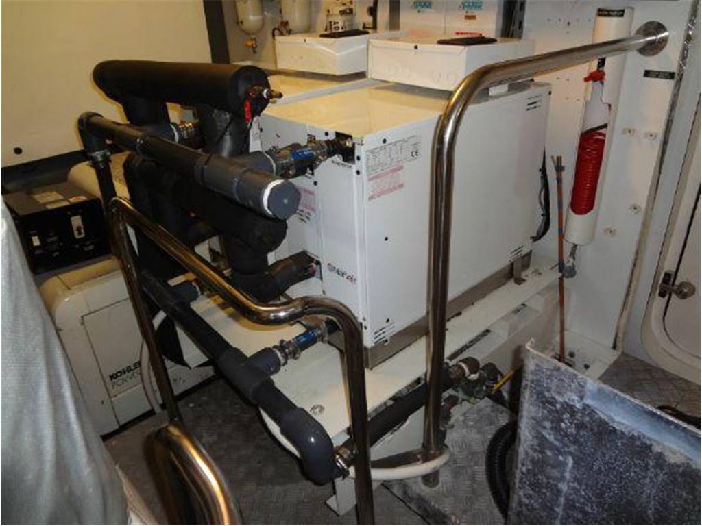 Construction ? Vinylester skin coat w/powder bound mat ? Stitched multi-axial single skin hull bottom ? Balsa/PVC foam cored topsides, skinned w/stitched multi-axials ? Longtitudinally stiffened w/foam formers, over laminated w/stitched multi-axials ? Transversely stiffened w/GRP ringframes, marine ply and sandwich bulkheads ? Gel Coat ? Direc V driv through tunnels ? Bronze props ? 2 x SS ternet prop shafts ? Dripless shaft logs ? Hi-performance bronze rudders & struts ? 30hp Hydraulic Bow & Stern Thrusters ? Sea strainers-2 for mains; 2 for gens ? Seacocks on all underwater fittings ? Full cathodic bonding system w/zinc anodes ? Heavy duty, cast alloy hydraulic trim tabs ? Rudders w/emergency lock ? White antifouling bottom paint |