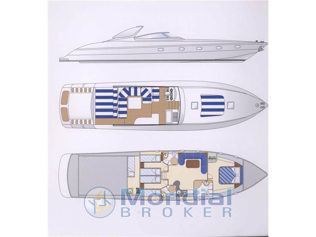 Notas internas1 Matrimoniale italiana, 1 Matrimoniale francese, 1 Doppia in piano, 1 Cabina equipaggio, 2 Toilette, 1 Cucina, 1 Salone, 1 Toilette Equipaggio