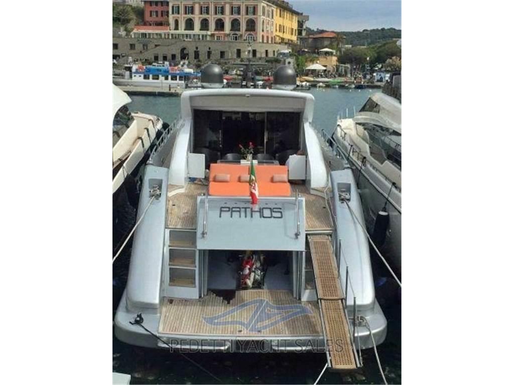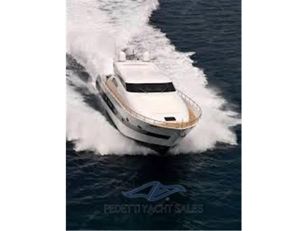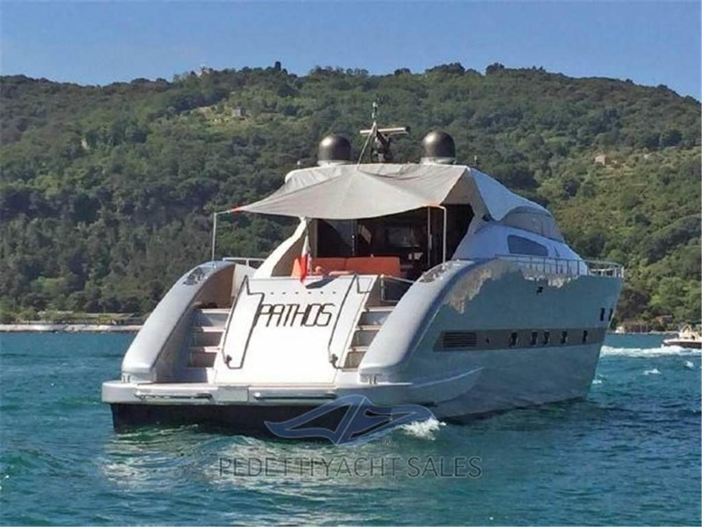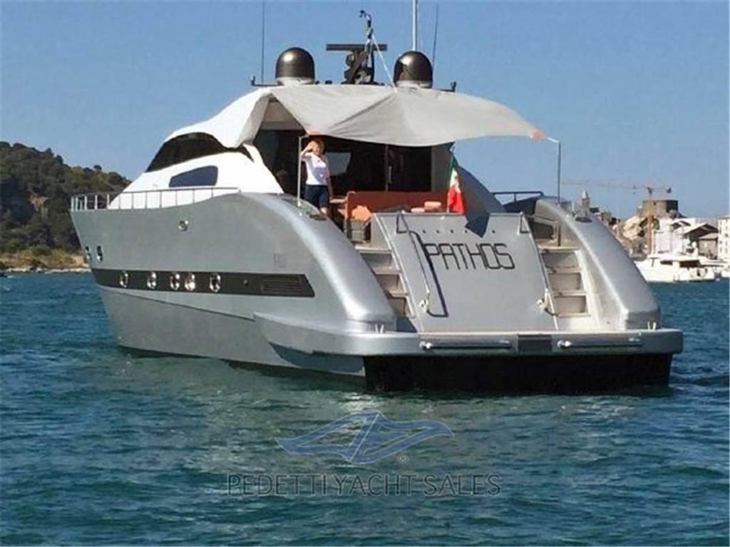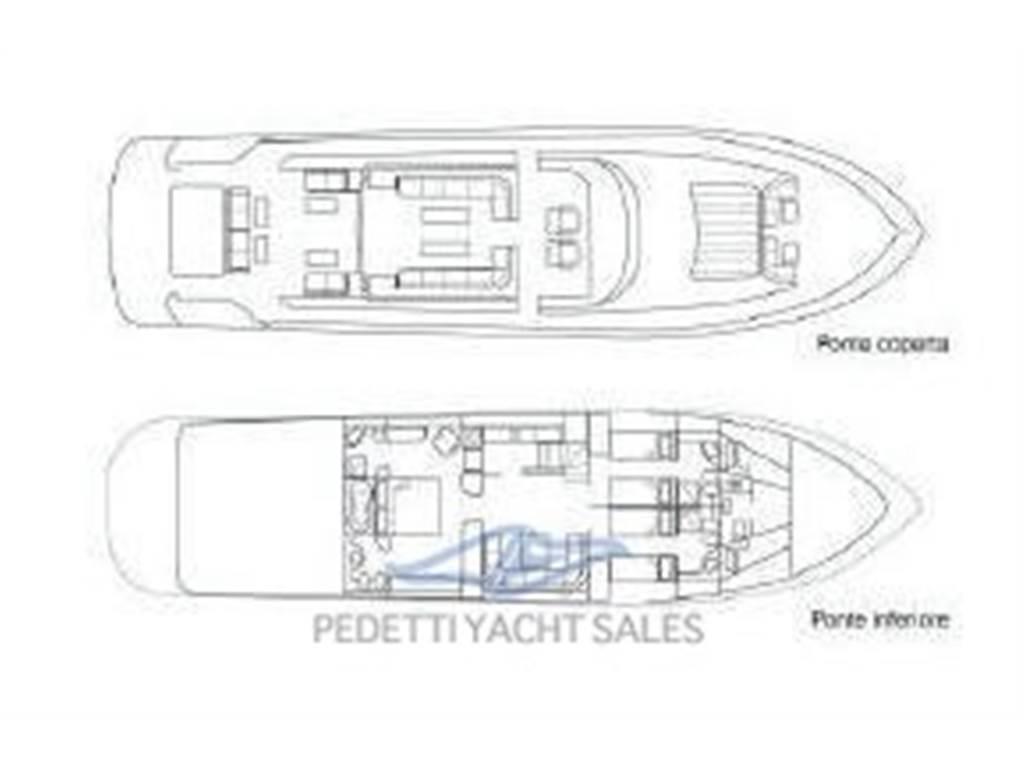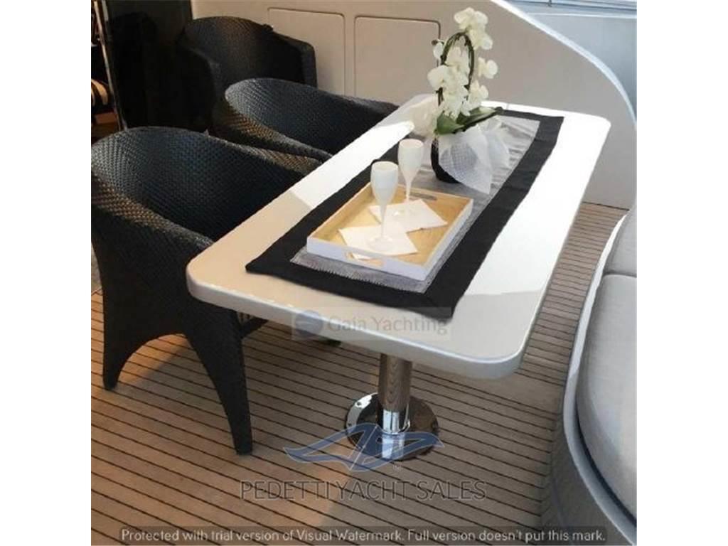 Notas internasA poppa è presente un ampio tender garage con prendisole al di sopra, mentre a prua alla zona equipaggio è riservata una cabina con tre letti. Sulla tuga è presente altresì una vasta area prendisole. La coperta è rivestita in teak mentre la verniciatura color grigio metallico dello scafo, conferisce un look estremamente moderno ed aggressivo. All'interno, il Lounge molto spazioso si trova sul piano di coperta, dotato enormi sofa e di zona entertainment, mentre sotto coperta abbiamo, a prua, abbiamo una comoda zona pranzo separata in totale privacy ed una cucina molto grande, degna di scafi di misure più importanti. Il layout prevede tre cabine doppie con letti matrimoniali, sottocoperta, l'armatoriale a centro barca (dotata anche di cabina armadi e zona vanity) e due VIP gemelle con bagni anch'essi ensuite (tutti) decorati con mosaico e dotati di bidet. A prua, sotto la zona cucina/pranzo, vi è un enorme locale cambusa. Il decor è fresco e moderno, con mobilio realizzato in rovere sbiancato e wengé e pavimentazione tutta in parquet.