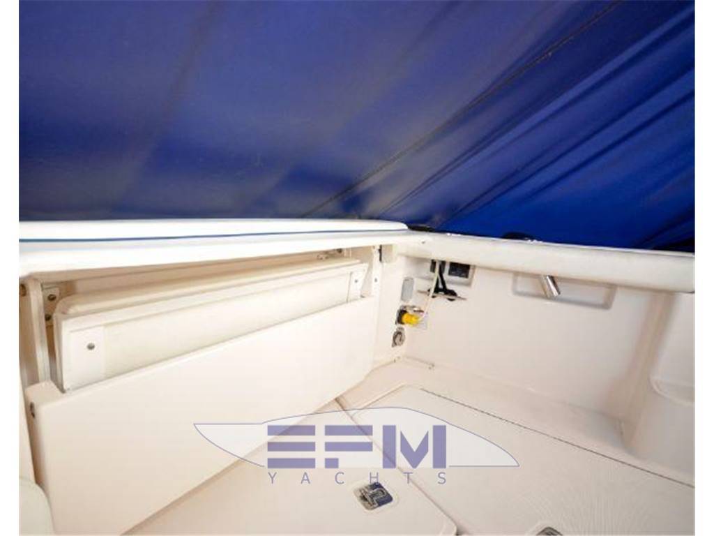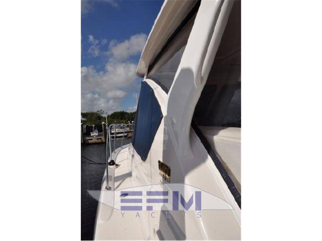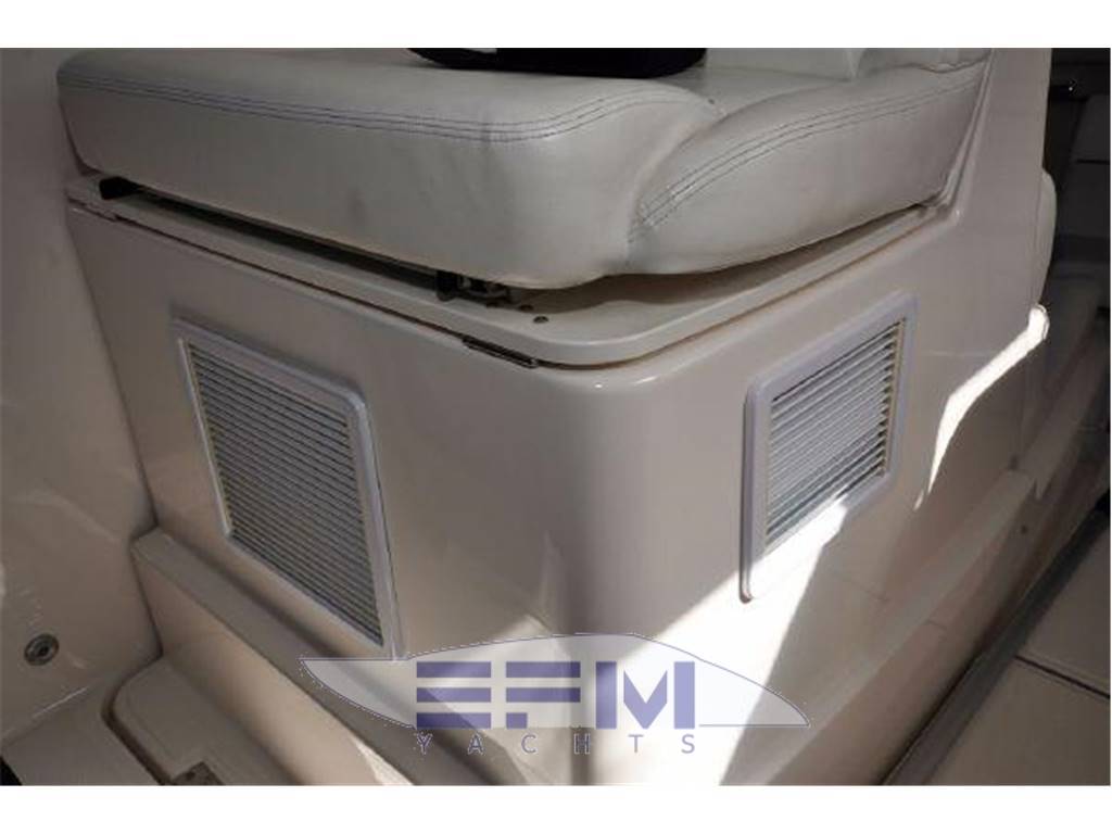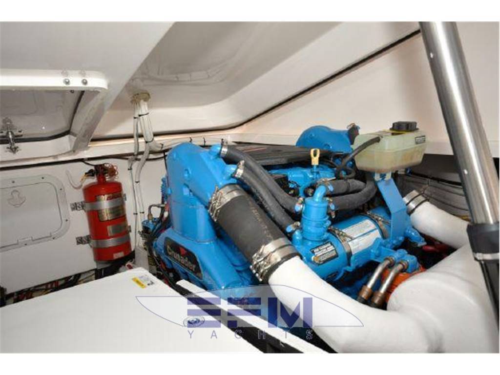 Notas internasInterior Group ? Mold and mildew resistant vinyl hull and headliner treatment ? Teak and Holly Flooring ? Cable TV jack ? 120V outlets throughout ? 12V LED lighting ? 5'8" headroom ? Companionway steps with teak treads and courtesy lights ? S.S. companionway handrail (port) ? Fusion® UD750 multi-zone stereo with cockpit remote, JL Audio® M700 digital amplifier, two (2) JL Audio® 6.5" interior speakers, four (4) JL Audio® 6.5" exterior component speakers. one ? Polk Audio® 8" subwoofer speaker, and USB combo port ? Salon air conditioning, 8,000 BTU's ? Cedar-backed port locker with hanging rod Galley ? Corian® countertop with stainless steel sink ? Utensil drawer ? Microwave oven ? Galley refrigerator, 2.3 cu. ft./65 liter DC with bins & bottle storage boxes Head ? Full fiberglass head with shower sump pump and shower curtain ? Vanity with Corian® countertop, stainless steel sink and storage below ? Mirror ? Vacuflush® toilet ? Exhaust blower and A/C vent Notas de la instrumentaciónEngine controls? Crusader® engines: Teleflex® twin mechanical engine controls ? Teleflex® hydraulic steering system ? Bronze axe head rudders and struts ? Aquamet® S.S. prop shafts, 1 3/8" ? Water cooled shaft logs with PSS® dripless shaft seal ? Two (2) Nibral® propellers: ? Engine instrumentation ? Crusader® engines: Tachometers w/hour meters, voltage gauges, fuel gauge,temperature gauges, and engine oil pressure gauges ? High output alternators: ? Crusader® engines: 70 amps ? Engine room acoustical insulation ? Engine hatch actuators ? 12V engine room lights ? Two (2) fuel filters/water separators ? Two (2) raw water intake strainers ? Vibration isolating engine mounts ? Plate mounted, thru-bolted engine system ? Two (2) bilge blowers, 250 CFM each ? Three (3) bilge pumps with monitors at helm: One (1) 500 GPH automatic forward Instrumentation, Equipment ? Garmin 7212 ? Icom VHF ? ACR spotlight ? Tiara 12V and 120V distribution panels. The 120V panel is located under the companionway steps and the 12V panel is split between the companion way steps and the port hanging locker. ? One (1) 120V 30 amp 65 ft. dockside power cord, inlet located starboard ? Cable TV inlet and cabin outlet ? Battery charger (1), 30 amp ? Two bank 12V battery system with batteries and battery switches (two (2) engine batteries and two (2) house batteries) ? Reverse polarity indicators ? Amp meters, AC and DC ? Electrical bonding system ? Zincs - transom and shafts ? Pre-wiring for generator ? Ritchie® Helmsman HF-743 compass ? One (1) 2000 GPH automatic/manual mid, and one (1) 2000 GPH automatic/manual aft ? One (1) composite fuel tank, 210 gallons, with electric gauge and fuel shut-off valve on top of tank ? Dockside water inlet ? One (1) fresh water tank, 33 gallons, with monitor ? Fresh water pressure system ? One (1) holding tank, 20 gallons, with indicator light located in the head ? One (1) water heater with exchanger, six (6) gallons ? Air horn ? FE-241 agent automatic/manual fire extinguisher system in engine room ? (HFC-227ea for Europe) ? Two (2) handheld fire extinguishers ? One (1) carbon monoxide detector ? One (1) smoke detector ? Four (4) 5/8" x 25' black dock lines ? Four (4) Tiara life vests (domestic boats only) ? USCG safety and medical kit ? USCG/international navigation lighting ? NMMA certified using ABYC standards Notas de armamentoHull and Deck? Hull constructed with a gelcoat outer layer, balsa cored hullsides, and hand-laid fiberglass using premium resin ? Deck constructed with a gelcoat outer ? Layer, coring, and hand-laid fiberglass using a premium resin ? Tiara custom diamond pattern non-skid ? Deck and cockpit surfaces ? Stringers, encapsulated by hand-laid ? Fiberglass, are integrated to the hull ? Gelcoated bilge ? Bronze seacocks on all underwater thru-hull fittings ? Molded-in hullside engine room ventilation ? Lenco® electro-mechanical trim tabs with indicator lights at helm ? Four (4) S.S. opening port lights with screens and privacy inserts ? One (1) Bomar® low profile extruded aluminum forward deck hatch with ? Adjuster and built-in Ocean Air® screen ? And privacy cover ? One-piece welded 316L S.S. 1" bow rail with staff and Tiara burgee ? Flush forward anchor rode locker with overboard drain ? Concealed Lewmar® V-700 automatic rope/chain anchor windlass with Lewmar® handheld remote control and switch at helm. Includes one (1) 8" S.S. foredeck cleat, 30' chain rode, 200' rope rode, and Delta® 22 lb. stainless steel anchor. ? White rubrail with 316L S.S. cap ? Four (4) 10" S.S. cleats forward/midship and two (2) 10" pop-up cleats aft Command Bridge ? Helm AC ? Hardtop side enclosures ? White painted handrails on hardtop ? Tiara custom composite windshield frame with tempered safety glass and a windshield wiper system with two (2) washer/wipers ? Centerline entry to salon with acrylic sliding companionway door, screen, lock, and privacy cover ? Tiara hinged helm console with full flush mount electronics capability, one (1) drink holder, 12V outlet, teak visor, and 17.5" teak steering wheel ? Helm seat with manual adjustment and storage locker below ? Entertainment center with TV jack, sink, refrigerator (wired DC) ? 120V GFI outlet ? Curved companion lounge with storage below, teak step treads, and teak table ? Drop-down engine room access hatch from the command bridge ? Weather covers for helm console and cockpit seating Aft Cockpit & Transom ? Molded-in steps to deck walkways, port and starboard ? Cockpit LED courtesy lighting ? Cockpit shower, hot and cold water ? Port and starboard aft L-lounges with storage below aft facing seats to sun pad with filler cushion ? Teak drink holders ? Molded-in centerline transom door ? 40" swim platform with built-in ladder |