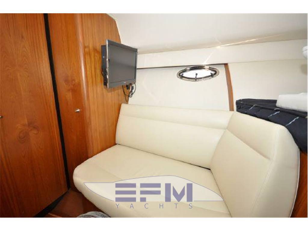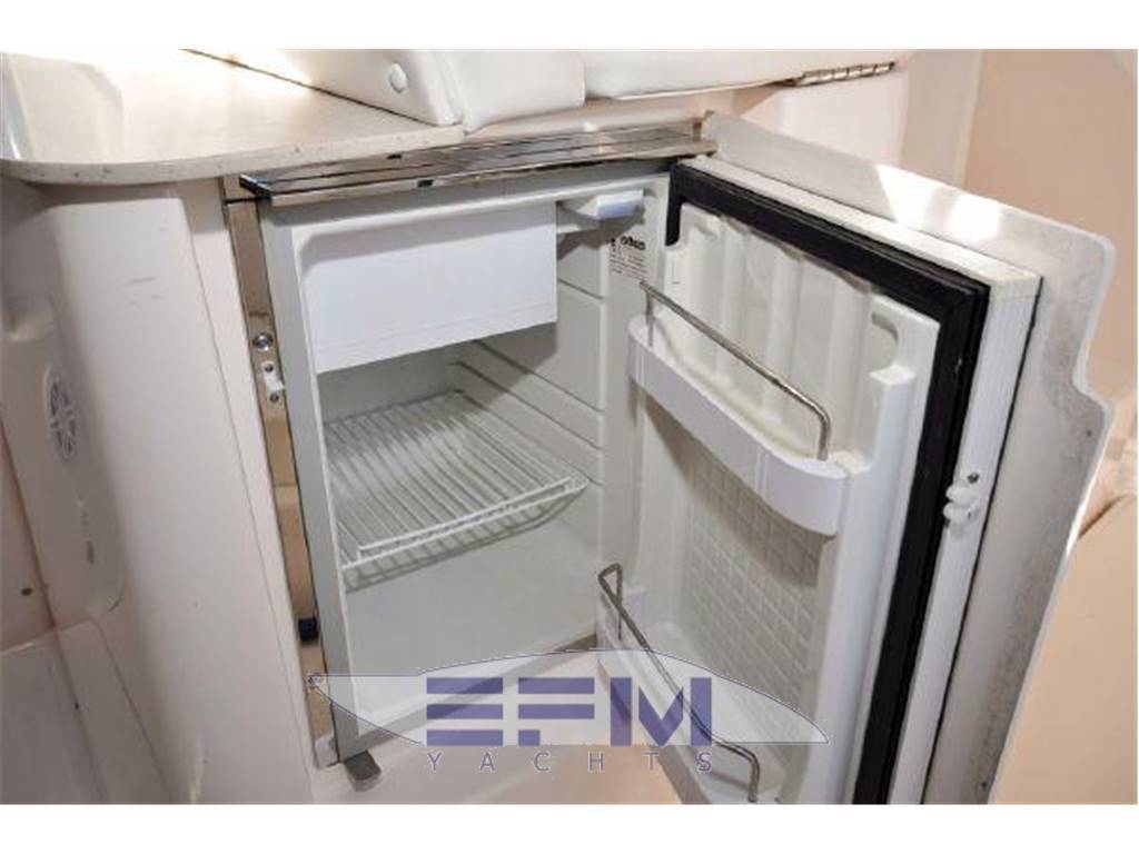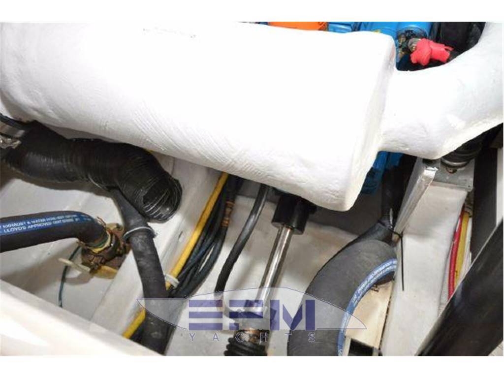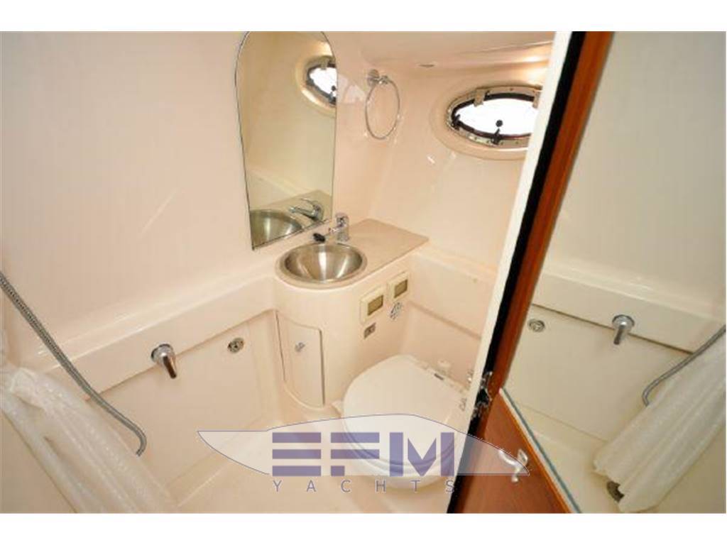 Notas internasInterior Group ? Mold and mildew resistant vinyl hull and headliner treatment ? Teak and Holly Flooring ? Cable TV jack ? 120V outlets throughout ? 12V LED lighting ? 5'8" headroom ? Companionway steps with teak treads and courtesy lights ? S.S. companionway handrail (port) ? Fusion® UD750 multi-zone stereo with cockpit remote, JL Audio® M700 digital amplifier, two (2) JL Audio® 6.5" interior speakers, four (4) JL Audio® 6.5" exterior component speakers. one ? Polk Audio® 8" subwoofer speaker, and USB combo port ? Salon air conditioning, 8,000 BTU's ? Cedar-backed port locker with hanging rod Galley ? Corian® countertop with stainless steel sink ? Utensil drawer ? Microwave oven ? Galley refrigerator, 2.3 cu. ft./65 liter DC with bins & bottle storage boxes Head ? Full fiberglass head with shower sump pump and shower curtain ? Vanity with Corian® countertop, stainless steel sink and storage below ? Mirror ? Vacuflush® toilet ? Exhaust blower and A/C vent Notas de la instrumentaciónEngine controls? Crusader® engines: Teleflex® twin mechanical engine controls ? Teleflex® hydraulic steering system ? Bronze axe head rudders and struts ? Aquamet® S.S. prop shafts, 1 3/8" ? Water cooled shaft logs with PSS® dripless shaft seal ? Two (2) Nibral® propellers: ? Engine instrumentation ? Crusader® engines: Tachometers w/hour meters, voltage gauges, fuel gauge,temperature gauges, and engine oil pressure gauges ? High output alternators: ? Crusader® engines: 70 amps ? Engine room acoustical insulation ? Engine hatch actuators ? 12V engine room lights ? Two (2) fuel filters/water separators ? Two (2) raw water intake strainers ? Vibration isolating engine mounts ? Plate mounted, thru-bolted engine system ? Two (2) bilge blowers, 250 CFM each ? Three (3) bilge pumps with monitors at helm: One (1) 500 GPH automatic forward Instrumentation, Equipment ? Garmin 7212 ? Icom VHF ? ACR spotlight ? Tiara 12V and 120V distribution panels. The 120V panel is located under the companionway steps and the 12V panel is split between the companion way steps and the port hanging locker. ? One (1) 120V 30 amp 65 ft. dockside power cord, inlet located starboard ? Cable TV inlet and cabin outlet ? Battery charger (1), 30 amp ? Two bank 12V battery system with batteries and battery switches (two (2) engine batteries and two (2) house batteries) ? Reverse polarity indicators ? Amp meters, AC and DC ? Electrical bonding system ? Zincs - transom and shafts ? Pre-wiring for generator ? Ritchie® Helmsman HF-743 compass ? One (1) 2000 GPH automatic/manual mid, and one (1) 2000 GPH automatic/manual aft ? One (1) composite fuel tank, 210 gallons, with electric gauge and fuel shut-off valve on top of tank ? Dockside water inlet ? One (1) fresh water tank, 33 gallons, with monitor ? Fresh water pressure system ? One (1) holding tank, 20 gallons, with indicator light located in the head ? One (1) water heater with exchanger, six (6) gallons ? Air horn ? FE-241 agent automatic/manual fire extinguisher system in engine room ? (HFC-227ea for Europe) ? Two (2) handheld fire extinguishers ? One (1) carbon monoxide detector ? One (1) smoke detector ? Four (4) 5/8" x 25' black dock lines ? Four (4) Tiara life vests (domestic boats only) ? USCG safety and medical kit ? USCG/international navigation lighting ? NMMA certified using ABYC standards Notas de armamentoHull and Deck? Hull constructed with a gelcoat outer layer, balsa cored hullsides, and hand-laid fiberglass using premium resin ? Deck constructed with a gelcoat outer ? Layer, coring, and hand-laid fiberglass using a premium resin ? Tiara custom diamond pattern non-skid ? Deck and cockpit surfaces ? Stringers, encapsulated by hand-laid ? Fiberglass, are integrated to the hull ? Gelcoated bilge ? Bronze seacocks on all underwater thru-hull fittings ? Molded-in hullside engine room ventilation ? Lenco® electro-mechanical trim tabs with indicator lights at helm ? Four (4) S.S. opening port lights with screens and privacy inserts ? One (1) Bomar® low profile extruded aluminum forward deck hatch with ? Adjuster and built-in Ocean Air® screen ? And privacy cover ? One-piece welded 316L S.S. 1" bow rail with staff and Tiara burgee ? Flush forward anchor rode locker with overboard drain ? Concealed Lewmar® V-700 automatic rope/chain anchor windlass with Lewmar® handheld remote control and switch at helm. Includes one (1) 8" S.S. foredeck cleat, 30' chain rode, 200' rope rode, and Delta® 22 lb. stainless steel anchor. ? White rubrail with 316L S.S. cap ? Four (4) 10" S.S. cleats forward/midship and two (2) 10" pop-up cleats aft Command Bridge ? Helm AC ? Hardtop side enclosures ? White painted handrails on hardtop ? Tiara custom composite windshield frame with tempered safety glass and a windshield wiper system with two (2) washer/wipers ? Centerline entry to salon with acrylic sliding companionway door, screen, lock, and privacy cover ? Tiara hinged helm console with full flush mount electronics capability, one (1) drink holder, 12V outlet, teak visor, and 17.5" teak steering wheel ? Helm seat with manual adjustment and storage locker below ? Entertainment center with TV jack, sink, refrigerator (wired DC) ? 120V GFI outlet ? Curved companion lounge with storage below, teak step treads, and teak table ? Drop-down engine room access hatch from the command bridge ? Weather covers for helm console and cockpit seating Aft Cockpit & Transom ? Molded-in steps to deck walkways, port and starboard ? Cockpit LED courtesy lighting ? Cockpit shower, hot and cold water ? Port and starboard aft L-lounges with storage below aft facing seats to sun pad with filler cushion ? Teak drink holders ? Molded-in centerline transom door ? 40" swim platform with built-in ladder |