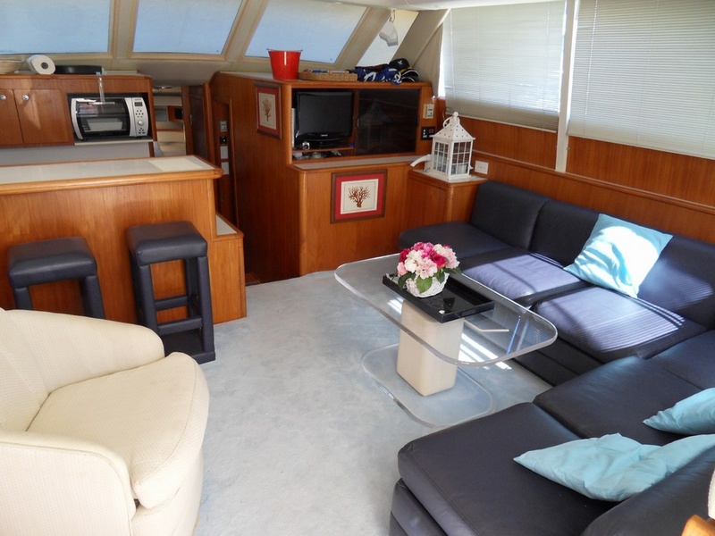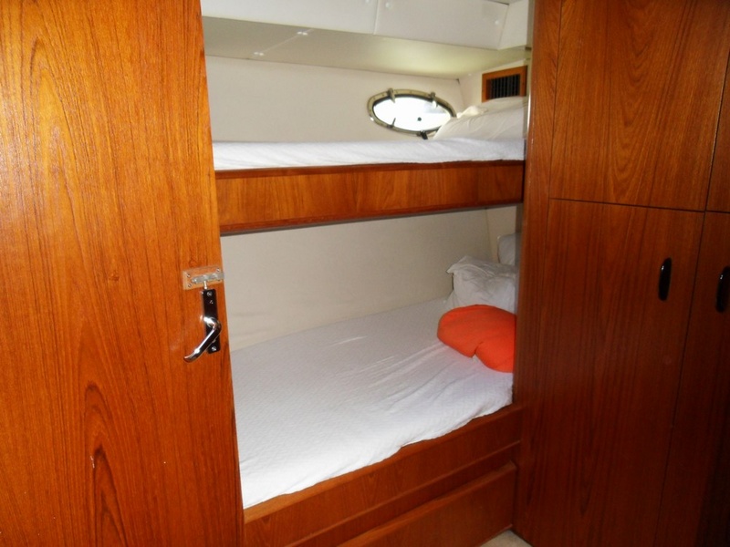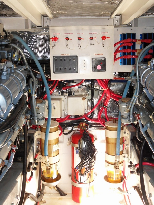Notas internas-Interiores teca. Notas de la instrumentación-Monitor multifunción: Radar Furuno GPS/plotter-profundidad sonda (2007)-GPS/plotter Navionics-piloto automático Robertson (2009)-VHF Shipmate-TV antena satelital.Notas de armamento-Onan generador-caliente y frÃo aire acondicionado-t. alta fibra de vidrio transparente cierres (2011)-Stern plataforma junto con sistema de cierre electrohidráulica para acarreo/lanzamiento de oferta-oferta con Suzuki 15 HP motor (nuevo 2009) - Flaps hidráulicos con cabina de indicadores-N ° 2 cargadores-inversores-aguas residuales planta-Mobile con fregadero y congelador - un eje y dos propulsores. |
