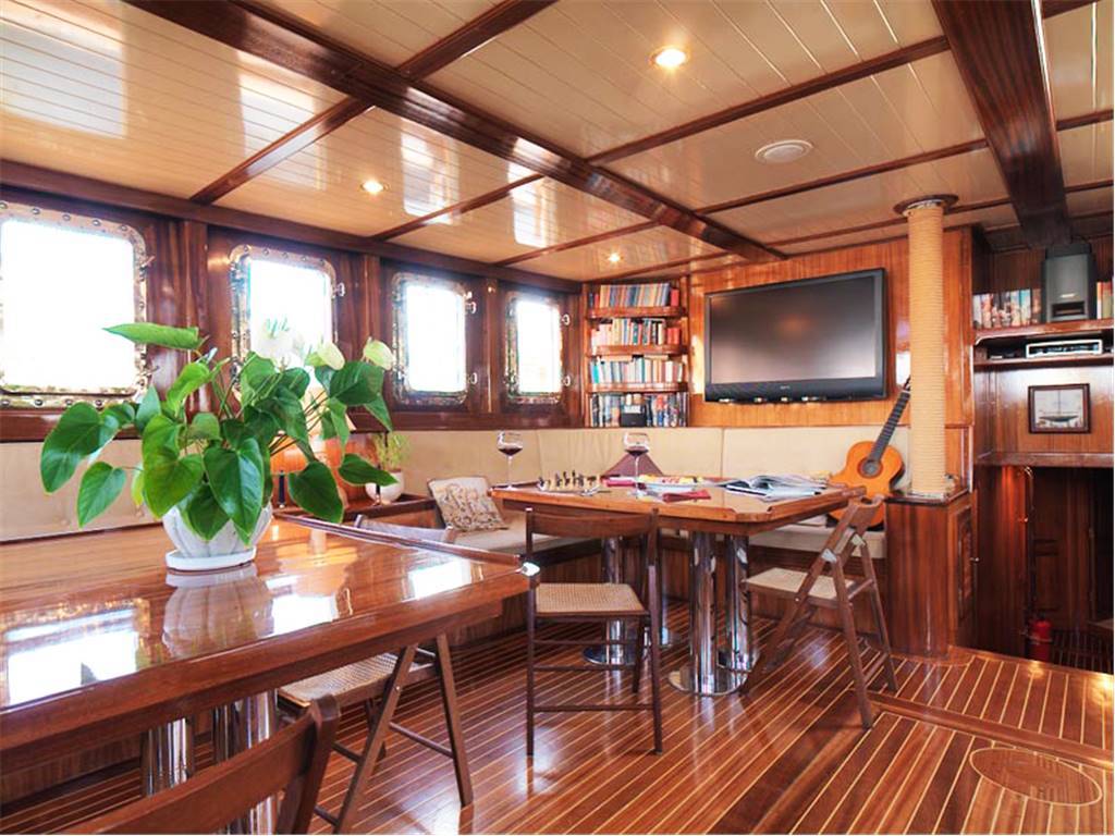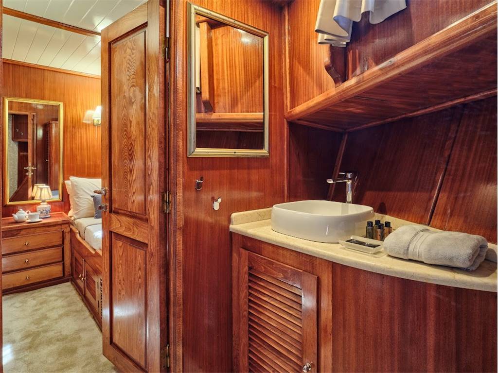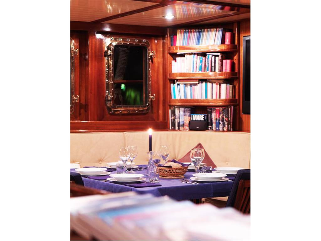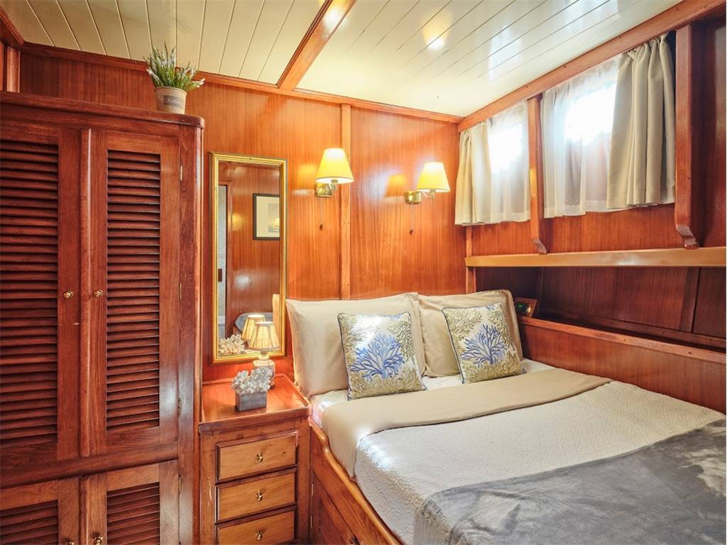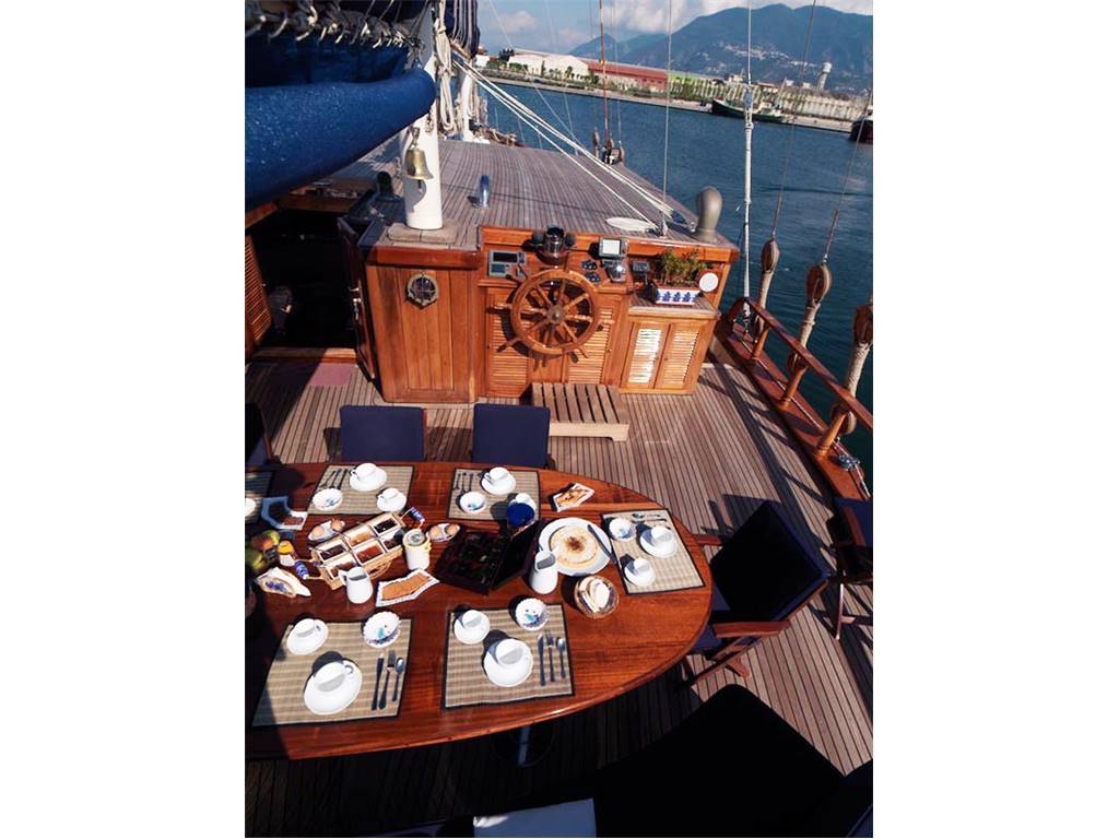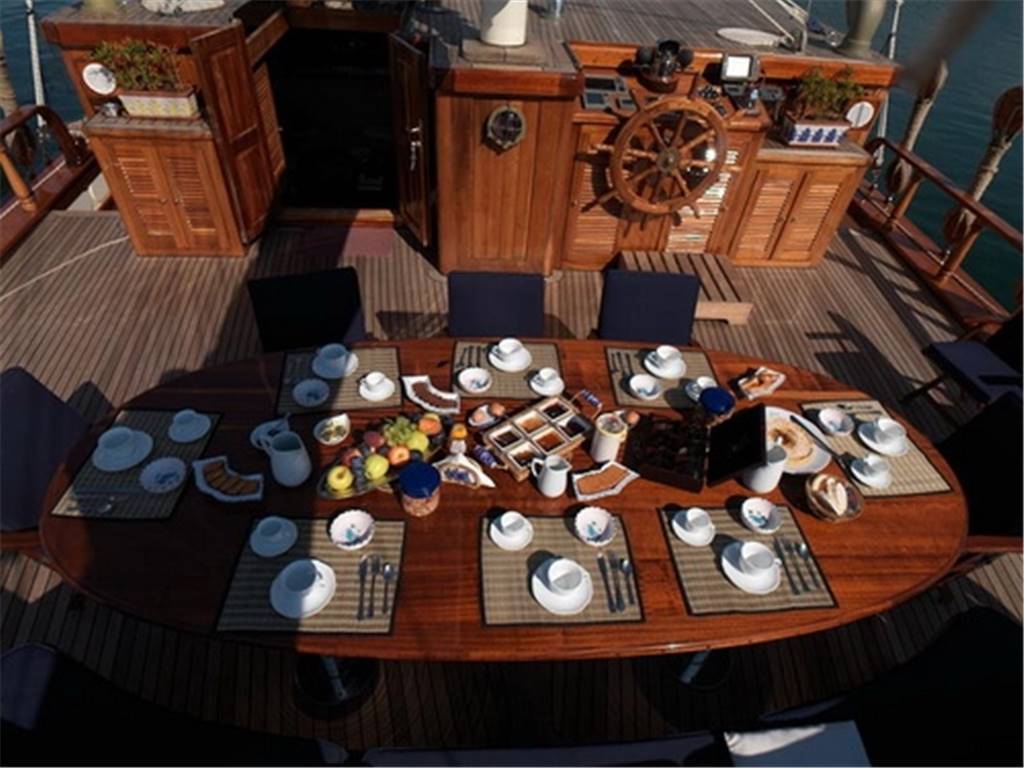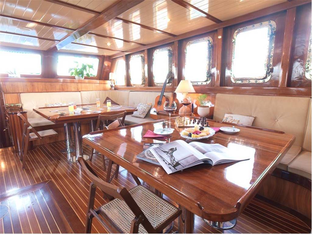 Notas internas6 Bagni Il caicco di lusso MYRA ha uno scafo esterno in acciaio è dipinto di nero intenso, le sue murate sono verniciate ad alta lucentezza e le piattaforme sono in classico teak. L'interno è spazioso e accogliente, con pannelli in legno pregiato e pavimenti in teak e agrifoglio. A bordo del caicco MYRA, il salone è nella tuga rialzata, le ampie finestrature consentono un'ampia luce naturale e un'ottima visuale. Sul lato sinistro, 2 tavoli da pranzo formali possono ospitare tutti e 12 gli ospiti, sul lato di dritta un salotto integrato e un tavolino da caffè invitano gli ospiti a rilassarsi in tutta comodità. Una TV a schermo piatto e un sistema audio sono disponibili per l'intrattenimento. Quattro cabine ospiti doppie sono disposte a prua del salone, mentre 2 cabine ospiti gemelle sono a poppa del salone. Notas de la instrumentaciónGPS, Autopilota, Radar, VHF, Lettore CD/DVD, Impianto Hi Fi interno ed esterno, TV, TV Satellitare, Flat TV, Wi-FI, Dolby surroundNotas de armamentoAria condizionata, Dissalatore, Generatore, Elica di prua, Inverter, Lavastoviglie, Lavatrice |