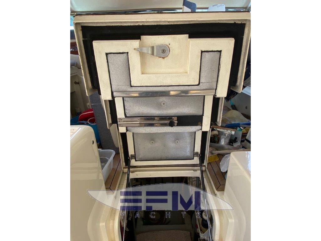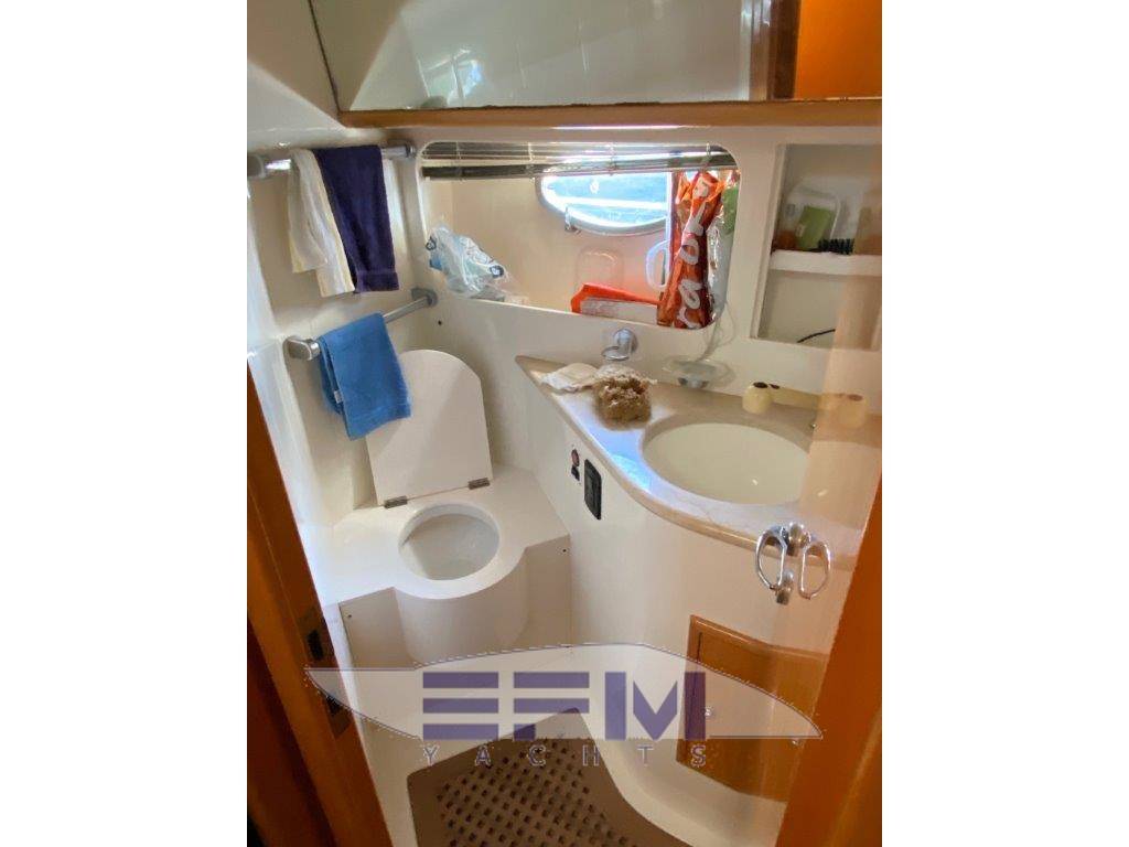 CARATTERISTICHE COSTRUTTIVE Carena: V profondo Materiale di costruzione: vetroresina Materiali e caratteristiche di coperta: vetroresina con sandwich di balsa Zona di prua: delfiniera con verricello salpa ancora e gavone ancora, pulpito, passo uomo, cuscineria prendisole, gallocce e passacavi Organizzazione e attrezzature del pozzetto: pontatura in teak, divaneria a U trasformabile, plancia di governo, mobile di servizio fronte divaneria e a poppavia con un lavello ognuno, gavone centrale, gavoni e stipi laterali, doccetta, cappottina, frigorifero, passaggio per piattaforma poppiera Plancetta poppiera: con scaletta bagno a scomparsa Materiali sovrastrutture e vetrate: attrezzature di coperta in acciaio inox, vetrate in cristallo temperato. |