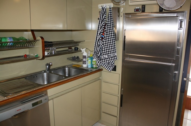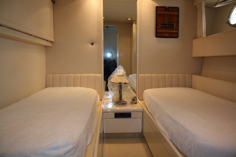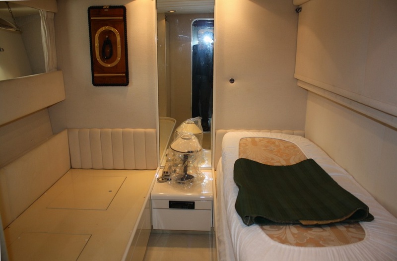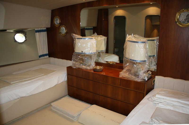 Notas internasPuente de cubierta: - L - en forma de sofá y mesa, muebles Mudroom con puerto de salida de contenedores en el pasillo de la derecha y escalera para volar en sala-cocina independiente con vitrocerámica, horno, nevera, lavaplatos y columna salida puerto en el pasillo lateral dx-comedor con una "U" en forma de sofá, mesa de comedor y sillas-caseta del timón. PISO inferior:-cabina de armador recámaras con cama matrimonial, baño y Walk-in cabina vip de armario en la proa con dos camas planas y cabinas de invitado en suite con dos camas, cada uno con tercer cama y baño. Tripulación:-una cabaña con tres camas y baño. -Interior cerezo.