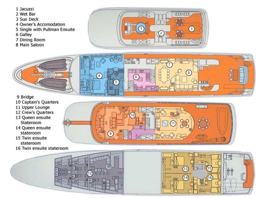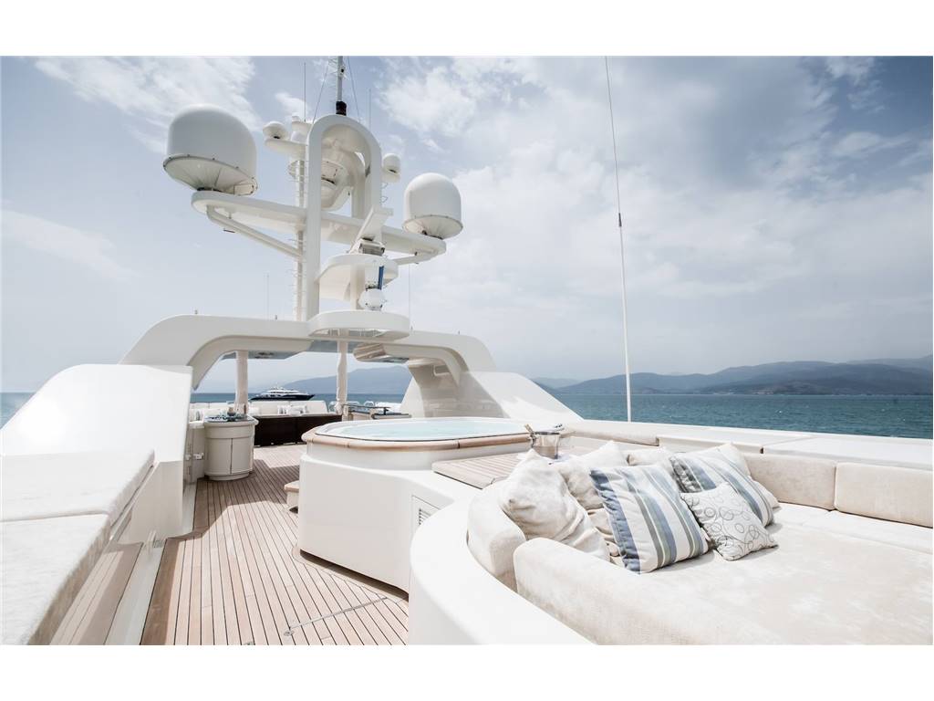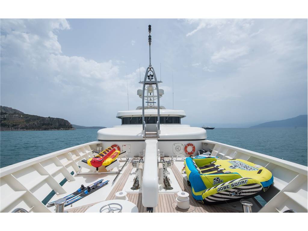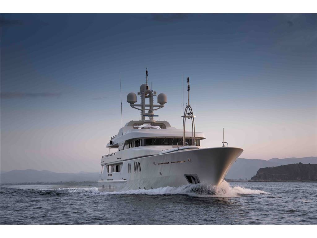 Notas internasNumber of Cabins : 5 Sleeps : 12 Crew : 12 Crew Cabins : 6 Bed Arrangement : 1 Master 2 Double 2 Twin 2 Pullman Notas de la instrumentaciónEngines & MachineryEngine(s) : 2 x Cummins 1200hp Air compressor : Heinman/Hopman 3 zones +chiller plant Generator(s) : 2 x 170 Kw Cummins + 1 x 33Kw Cummins) Fresh water maker : 2 x Idromar reverse osmosis Sea water pump : 2 x Johnson pumps Gearboxes : 2 x Reintjes WAF 541 Steering : STAZO Bow thruster : 1 x HRP 200-60 Electric @ 140hp Rudder Angle Indicator Uistein Tenfjord Fuel Filters Fuel Separator Alfa Laval MAB 103 B-24 Oil/Water Separator Facet International Fire/Bilge Pump FRE 50-205 RNB-H Boilers 2 x ACV ET-ETS Sewage treatment Hamann Wassertechnik HL- CONT Electronics & Equipment Compass : 1 x Cassens & Plath Compass : 1 x C Plath Mk1 Autopilot : 1 x C Plath Navi Pilot V hsc Echo sounder : 1 x Furuno FCV 582 L Radar : 1 x Decca Radar : 1 x Furuno RCV 013 Transponder : 1 x Furuno GPS : 2 x Litton Marine Navtex : 1 x ICS nav 5 GPS : 1 x Saab Wind Instruments: 1 x walker P310 WI-FI : Available TV : 1 x Samsung smart 40” LED TV TV : 1 x surround sound plasma TV TV : 1 x Samsung smart 42”LED TV TV : 4 X 23’’HD TV : 1 x 27” Plasma TVs TV : 6 x 20” Plasma TVs DVD Players : DVD Players Available CD Players : Available Music system : 1 x Crestron Multi Media System Games : 1 x X-box Sound system : 1 x LINN Audi throughout yacht Music system : IPod docking stations throughout the yacht Notas de armamentoDomestic AppliancesOven : 1 x Lohberger Oven Grill : 1 x Lohberger grill 1 x Lohberger deep fryer 1 x Lohberger stove (4 x induction) Refrigerator : 1 x foster Refrigerator Deep freezer : 1 x foster freezer 1 x Scotsman AC 45 Icemaker Grill : 1 x Lohberger Grill Microwave oven : 1 x miele microwave - oven Dishwasher : 1 x GEC Domestic Dishwasher Dishwasher : 1 x Metro Dishwasher Deck Equipment Swimming ladder Fenders Chains and Anchors : 2 x Anchors 19-2-50 Windlasses : 1 x Anchor Windless System Steen Capstans : 2 x Aft Capstans Water Sports Equipment Tender(s) : 1 x Custom 12th Sense 22ft. Tender with FNM HTLP 250 hp Inboard Tender(s) : 1 x Rescue tender Novourania wide body 18ft 115hp Yamaha Outboard Jet Ski(s) : 2 x SeaDoo Spark JetSki Jet Ski(s) : 1 x Kawasaki Super Jet stand up Jet Ski 700 2 x Stand up paddles 2 x Sea Bob Snorkel gear Available Fishing gear Available Water skis Available wakeboard Available Towable toys Safety & security equipment • 1 x Panasonic closed circuit television (CCTV) system with • 4 x Cameras and motion detectors (main deck) + 4 cameras in the engine room • 3 x CCTV Monitor screens in wheelhouse , crew mess room and engine room • 4 x Door alarms: stern /aft escape, engine room escape, fire escape. • 44 x Fire / heat / smoke detectors throughout yacht • 2 x Fixed C) 2 Systems locates in Engine room and Galley • 28 x Fire extinguishers in all places necessary |