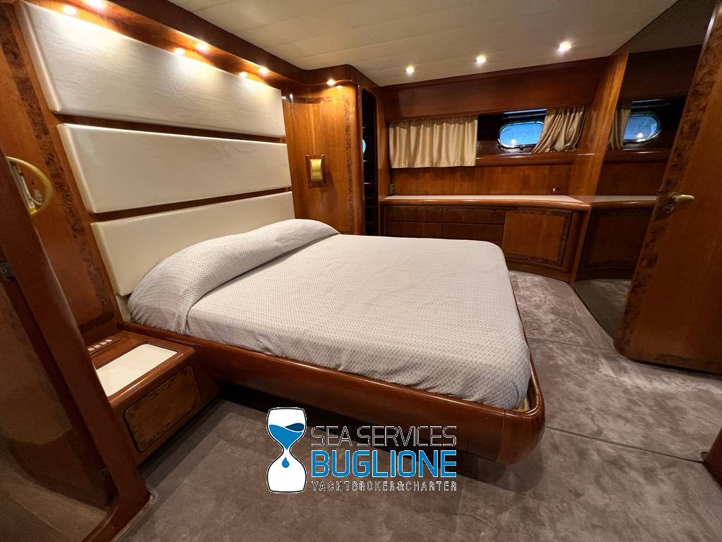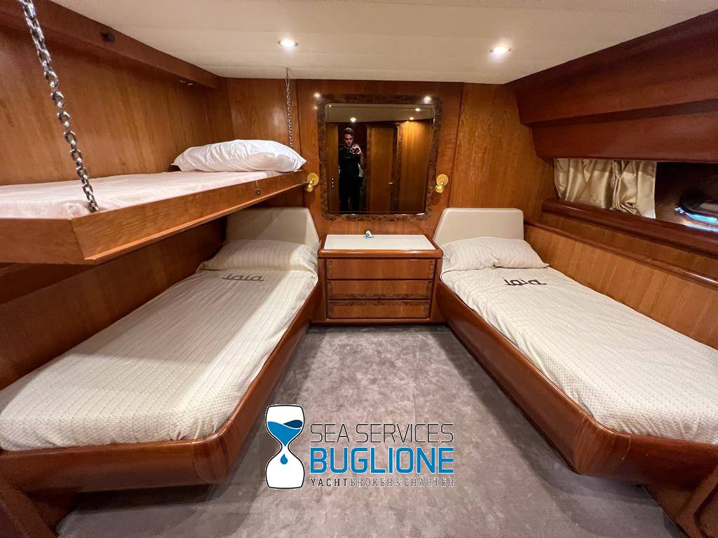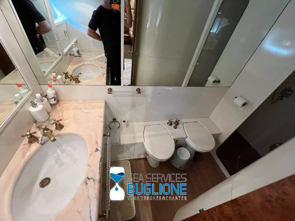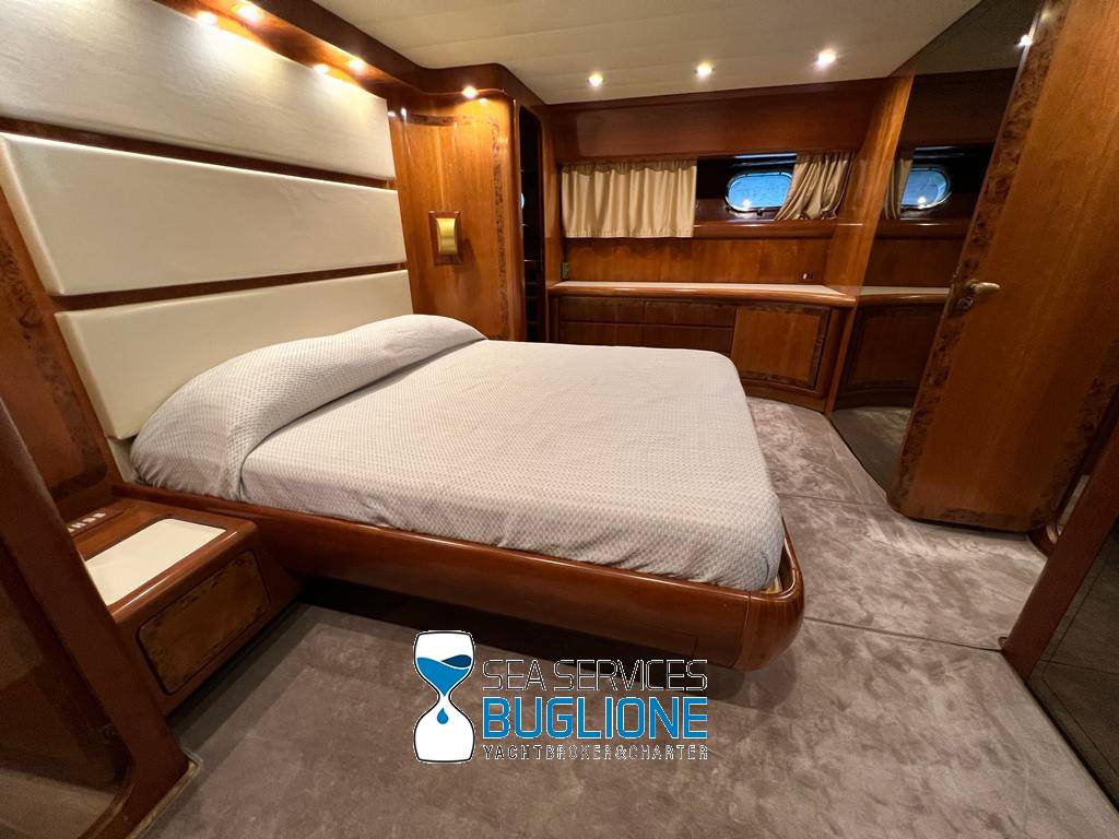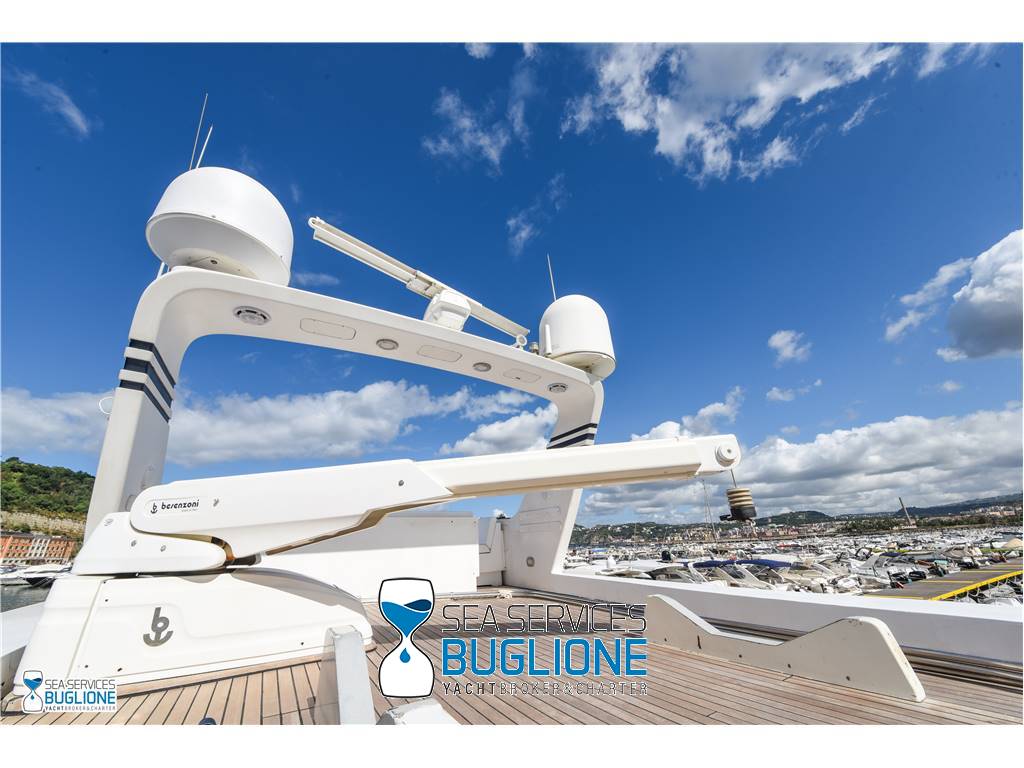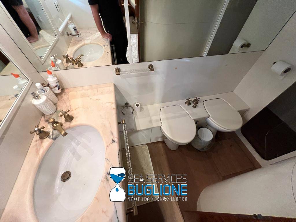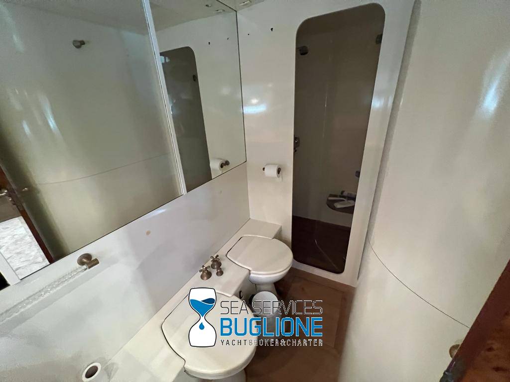 Notas internasDinette imponente caratterizzata per la prima parte dalla zona relax divano, tavolo da caffè, tv lcd. Le imponenti finestre trasferiscono agli ospiti il contatto con il mare anche all'interno. La cucina a dritta nave è dotata di tutti gli elettrodomestici frigo freezer grill. 4 Cabine e 4 Bagni calpestio in moquette chiara e mobili in ciliegio finemente lavorati. Cabina armatoriale a poppa nave caratterizzata dalla presenza di n°4 oblò letto matrimoniale king size, tv lcd, cabina armadio privata con cassaforte. Bagno armatoriale calpestio in legno lavabo wc e bidet, imponente cabina doccia. Cabina a prua nave, ospita n°2 letti singoli a V ed n°1 letto a Pullman , bagno privato dotato di wc bidet lavabo e cabina doccia. Cabina a sinistra nave, ospita n°2 letti singoli, bagno privato dotato di wc bidet lavabo e cabina doccia. Cabina a dritta nave ospita n°2 letti singoli, bagno privato dotato di wc bidet lavabo e cabina doccia. Notas de la instrumentaciónStrumentazione 2022 FuronoGps Ecoscandaglio Vhf Autopilota La Strumentazione necessaria a condurre l'imbarcazione è presente sia nella plancia nel main deck che sul fly. Notas de armamento2 Generatori da 21kw KholerAria Condizionata nelle 4 cabine ospiti più nei due ambienti riservati all'equipaggio Passerella Idraulica centrale Doppio Verricello a prua più verricello di poppa Tendalino sul Fly Tappezzeria per trasformazione tavolo fly in prendisole Gru sul fly moderna per varo e alaggio del tender |
