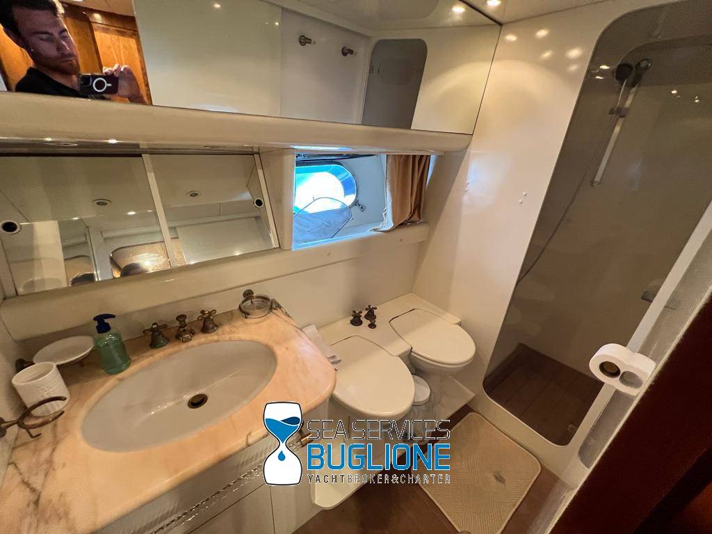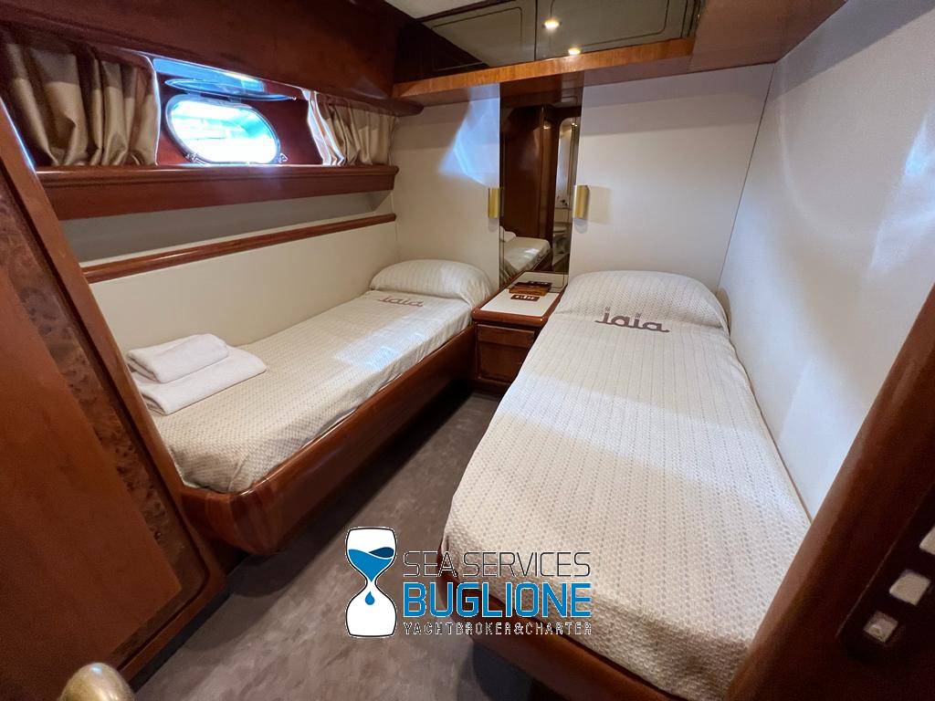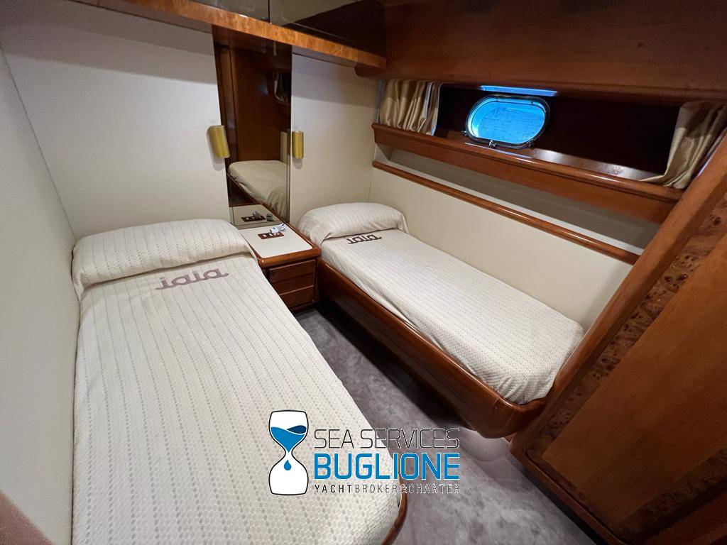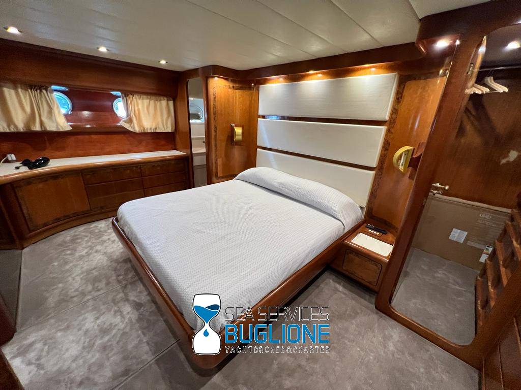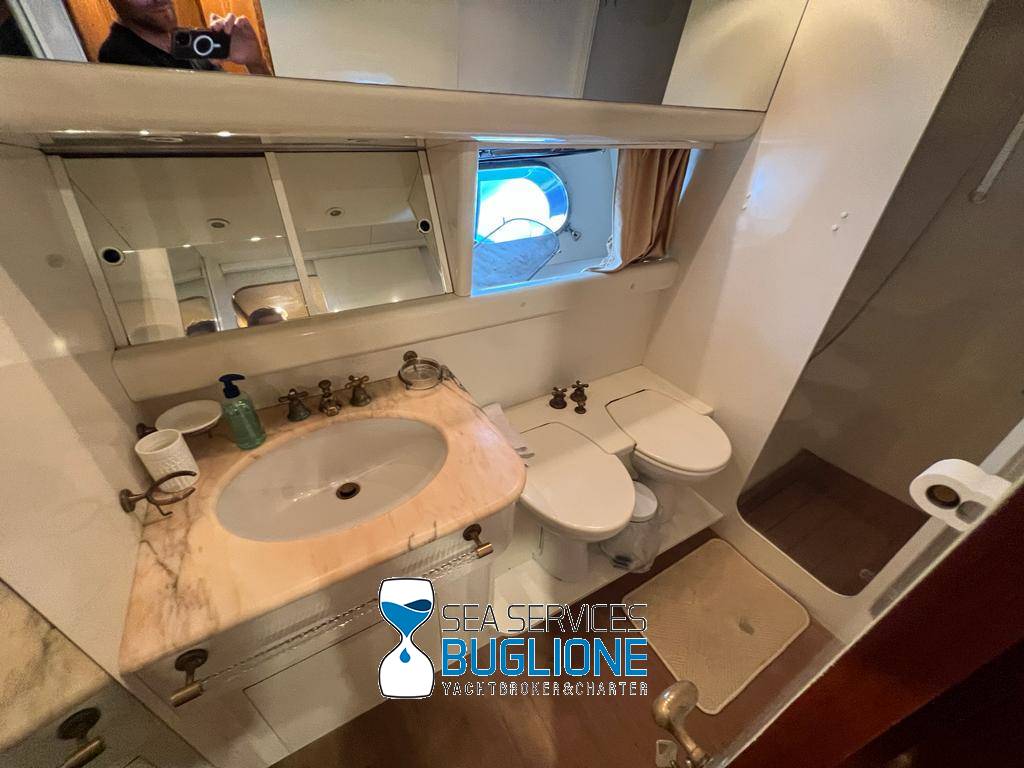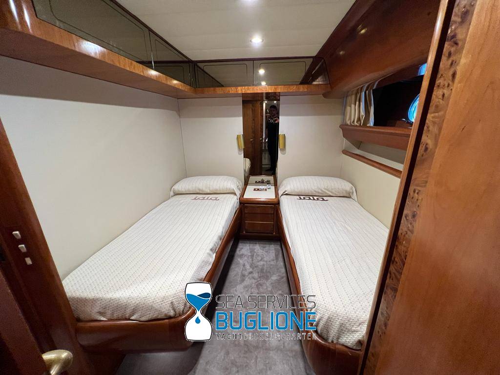 Notas internasDinette imponente caratterizzata per la prima parte dalla zona relax divano, tavolo da caffè, tv lcd. Le imponenti finestre trasferiscono agli ospiti il contatto con il mare anche all'interno. La cucina a dritta nave è dotata di tutti gli elettrodomestici frigo freezer grill. 4 Cabine e 4 Bagni calpestio in moquette chiara e mobili in ciliegio finemente lavorati. Cabina armatoriale a poppa nave caratterizzata dalla presenza di n°4 oblò letto matrimoniale king size, tv lcd, cabina armadio privata con cassaforte. Bagno armatoriale calpestio in legno lavabo wc e bidet, imponente cabina doccia. Cabina a prua nave, ospita n°2 letti singoli a V ed n°1 letto a Pullman , bagno privato dotato di wc bidet lavabo e cabina doccia. Cabina a sinistra nave, ospita n°2 letti singoli, bagno privato dotato di wc bidet lavabo e cabina doccia. Cabina a dritta nave ospita n°2 letti singoli, bagno privato dotato di wc bidet lavabo e cabina doccia. Notas de la instrumentaciónStrumentazione 2022 FuronoGps Ecoscandaglio Vhf Autopilota La Strumentazione necessaria a condurre l'imbarcazione è presente sia nella plancia nel main deck che sul fly. Notas de armamento2 Generatori da 21kw KholerAria Condizionata nelle 4 cabine ospiti più nei due ambienti riservati all'equipaggio Passerella Idraulica centrale Doppio Verricello a prua più verricello di poppa Tendalino sul Fly Tappezzeria per trasformazione tavolo fly in prendisole Gru sul fly moderna per varo e alaggio del tender |