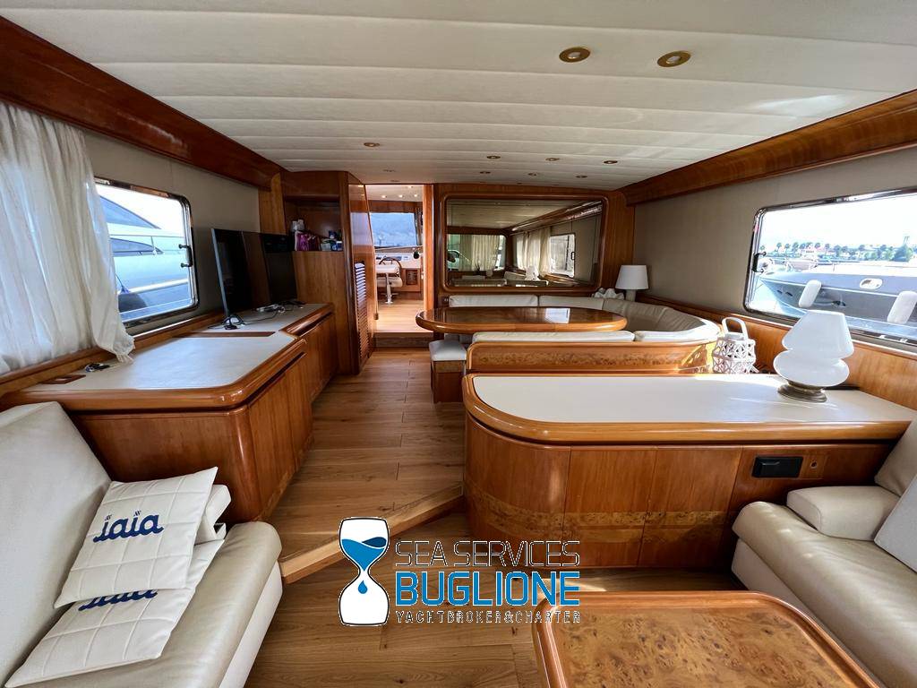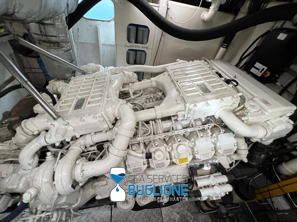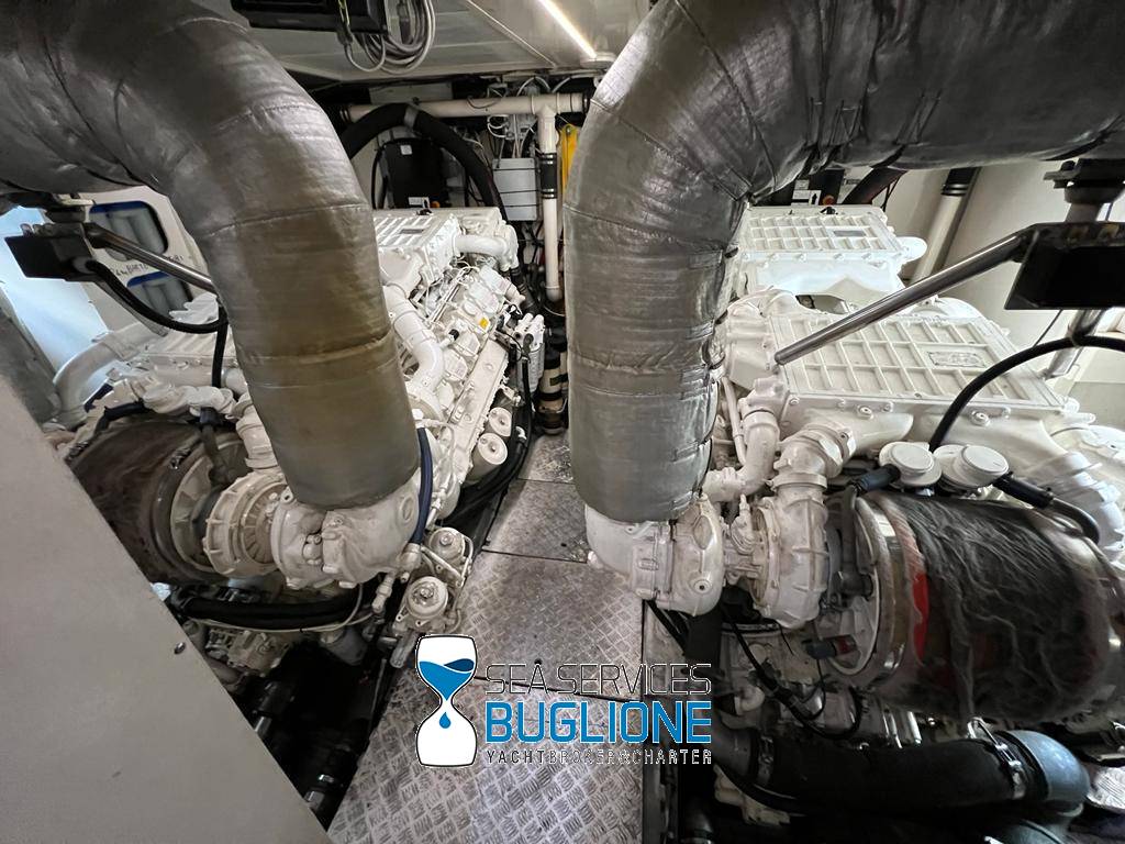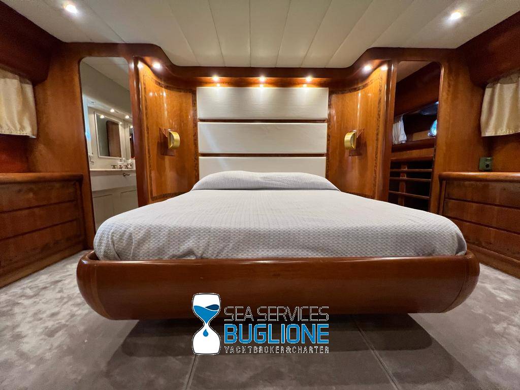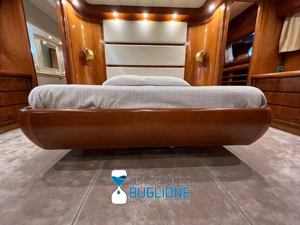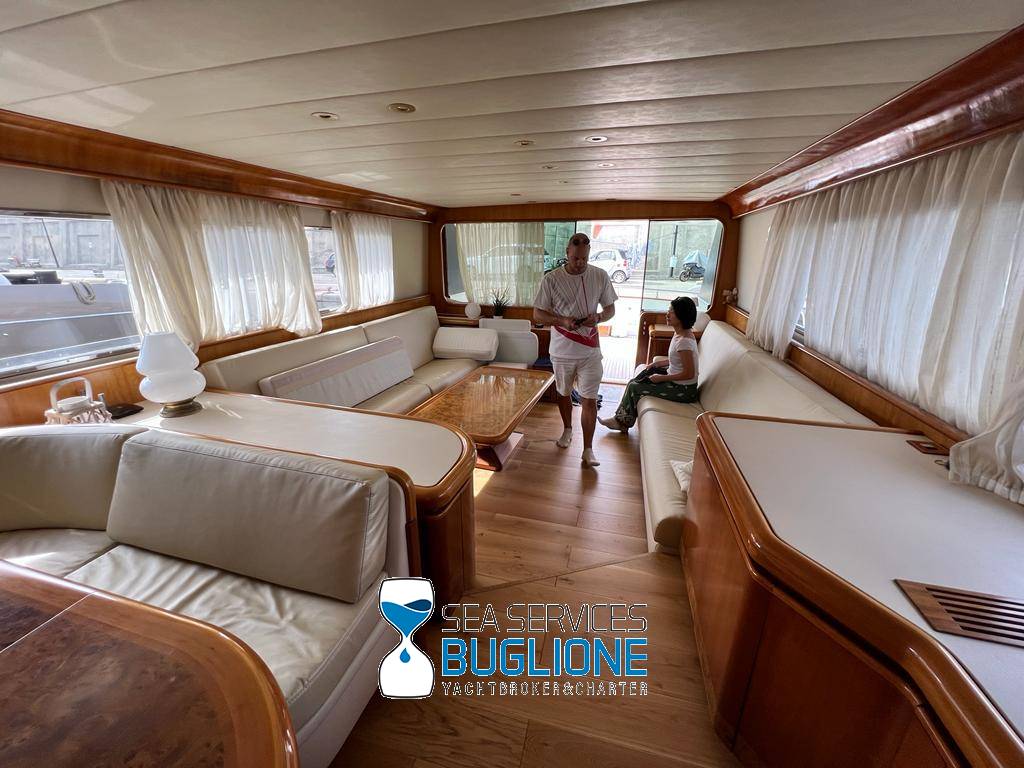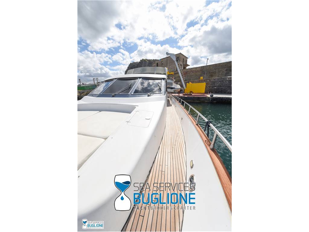 Notas internasDinette imponente caratterizzata per la prima parte dalla zona relax divano, tavolo da caffè, tv lcd. Le imponenti finestre trasferiscono agli ospiti il contatto con il mare anche all'interno. La cucina a dritta nave è dotata di tutti gli elettrodomestici frigo freezer grill. 4 Cabine e 4 Bagni calpestio in moquette chiara e mobili in ciliegio finemente lavorati. Cabina armatoriale a poppa nave caratterizzata dalla presenza di n°4 oblò letto matrimoniale king size, tv lcd, cabina armadio privata con cassaforte. Bagno armatoriale calpestio in legno lavabo wc e bidet, imponente cabina doccia. Cabina a prua nave, ospita n°2 letti singoli a V ed n°1 letto a Pullman , bagno privato dotato di wc bidet lavabo e cabina doccia. Cabina a sinistra nave, ospita n°2 letti singoli, bagno privato dotato di wc bidet lavabo e cabina doccia. Cabina a dritta nave ospita n°2 letti singoli, bagno privato dotato di wc bidet lavabo e cabina doccia. Notas de la instrumentaciónStrumentazione 2022 FuronoGps Ecoscandaglio Vhf Autopilota La Strumentazione necessaria a condurre l'imbarcazione è presente sia nella plancia nel main deck che sul fly. Notas de armamento2 Generatori da 21kw KholerAria Condizionata nelle 4 cabine ospiti più nei due ambienti riservati all'equipaggio Passerella Idraulica centrale Doppio Verricello a prua più verricello di poppa Tendalino sul Fly Tappezzeria per trasformazione tavolo fly in prendisole Gru sul fly moderna per varo e alaggio del tender |