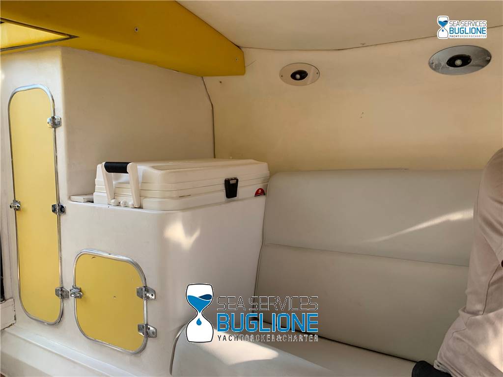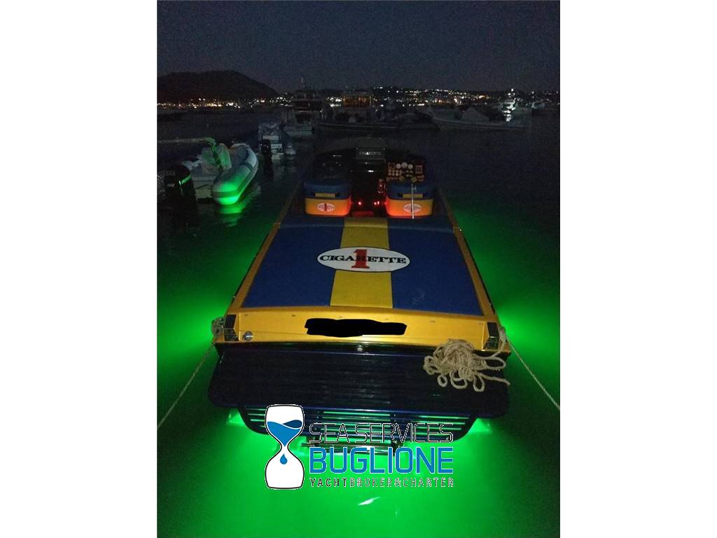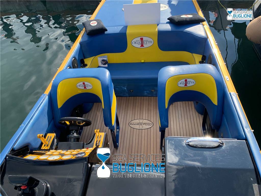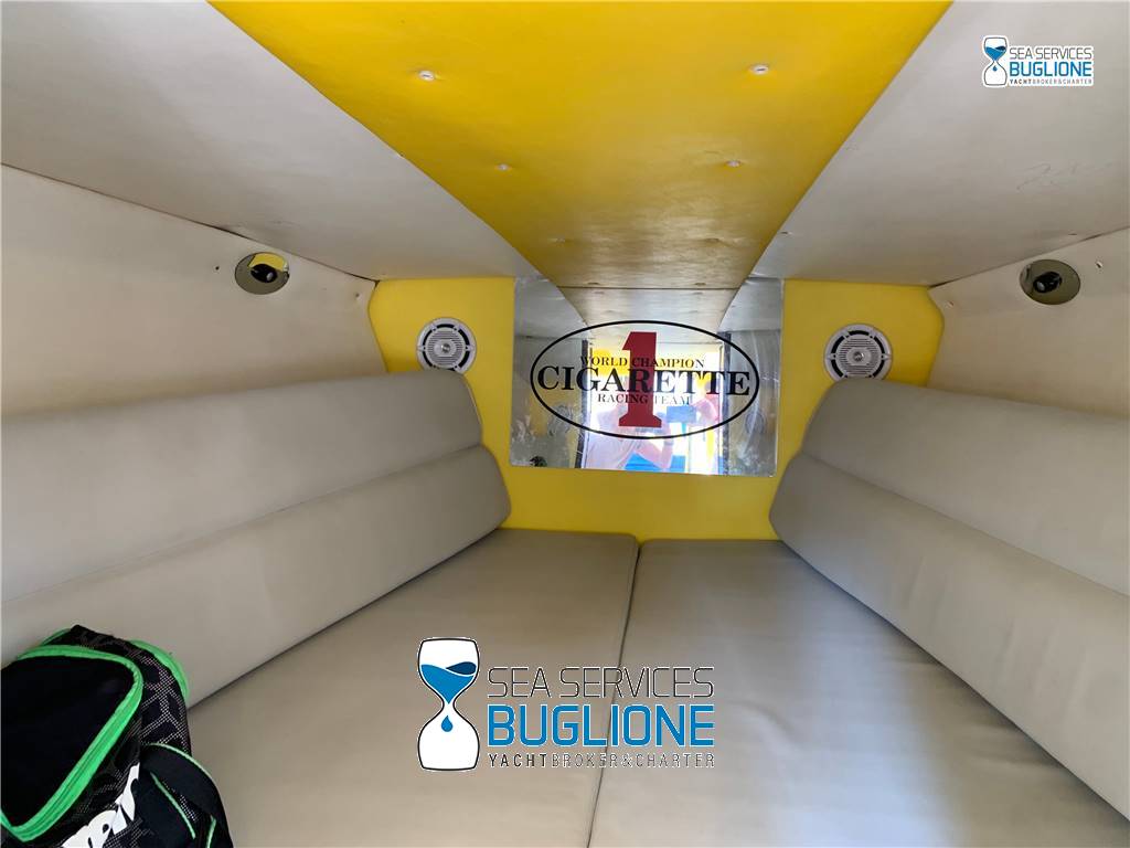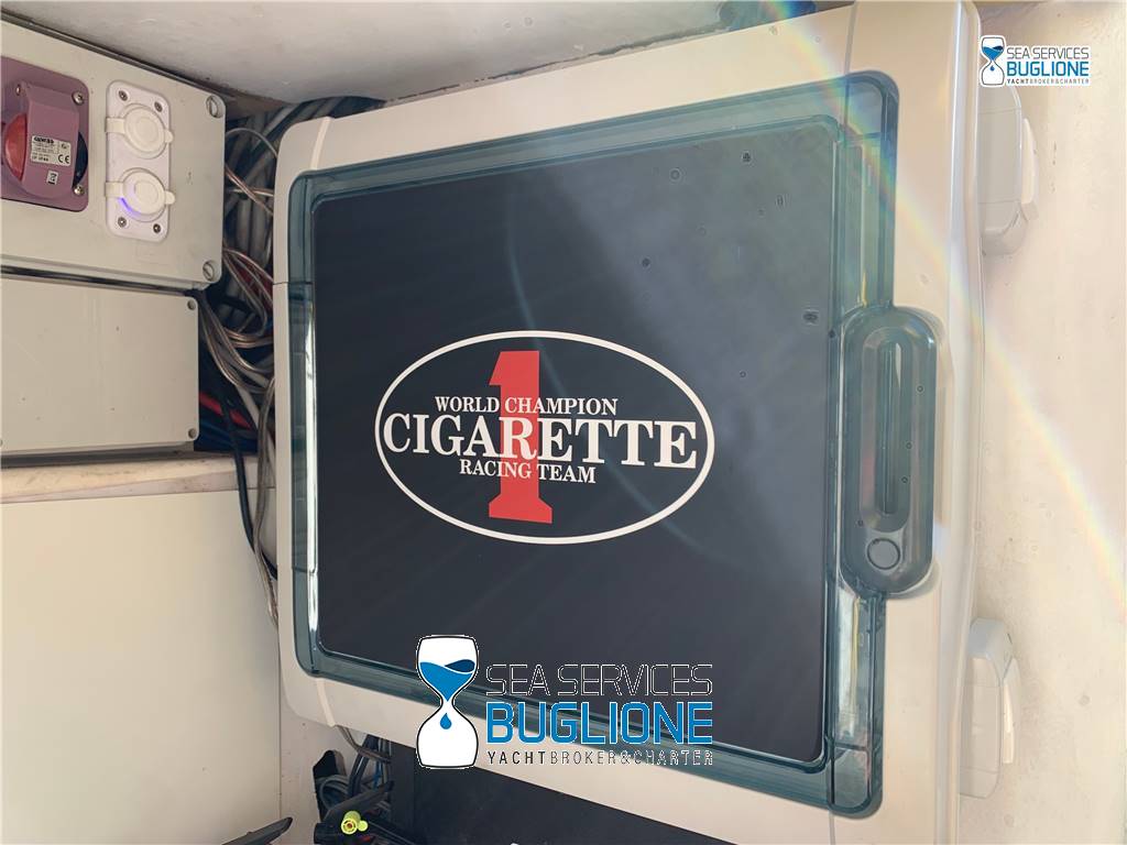 Notas internasaccesso al quadro generale dei magnetotermici con legenda (cablaggi pulsanti e cassetta nuova) wc elettrico a scomparsa. Letto matrimoniale a prua trasformabile grazie alle due tappezzerie laterali che possono facilmente essere spostate per garantire maggiore larghezza agli ospiti che desiderano riposare a bordo , testiera letto con logo cigarette. L'ambiente interno è stato refittato, i celini e le paratie in sky bianco garantiscono un ambiente fresco e luminoso. Il rifacimento dell'impianto elettrico dalla a alla z oltre l'aspetto fondamentale della sicurezza ha permesso anche di migliorare il comfort in cabina grazie ai nuovi punti luce a led che non emanano calore ed alla posa in opera di ventilatori a 12v ,e presa caricabatterie a 12v per tutto l'ambiente. Notas de la instrumentaciónGps Raymarine ultima generazioneEcoscandaglio integrato in unico monitor Luci di navigazione a Led ultima generazione Notas de armamentoLuci subacquee=Installazione led subacquei su poppa,murate e opera viva collegati a 12 led rgb su pozzetto, dinette e sala macchine comandati da app con telefoninoImpianto stereo interno ed esterno bluethoot Verricello elettrico 1500 watt catena calibrata da 8' ancora inox 15 kg Pedana di poppa blu con scaletta al centro molto comoda |