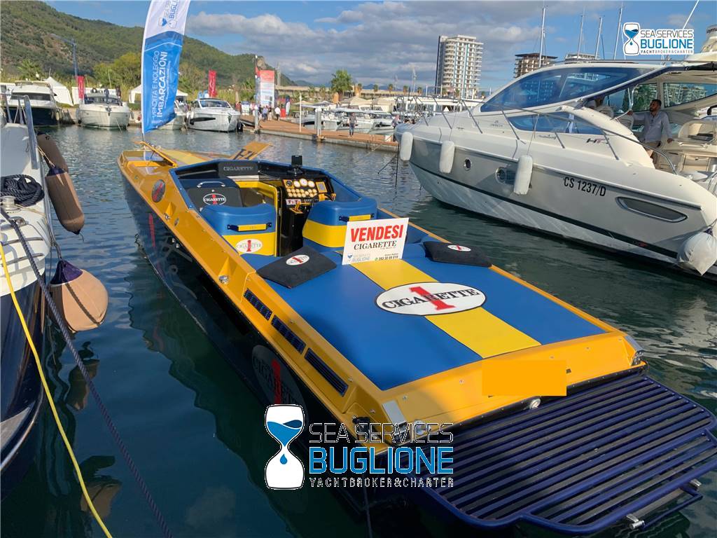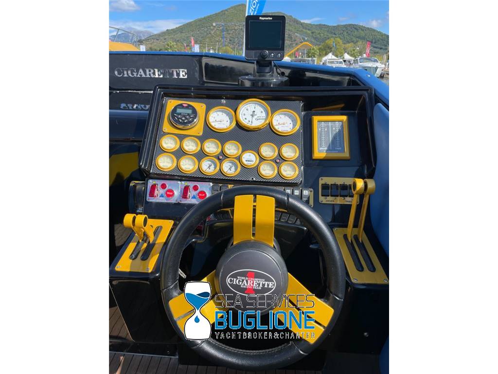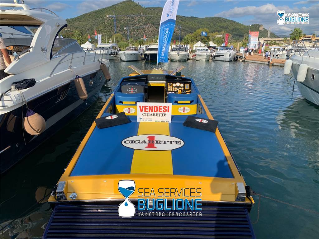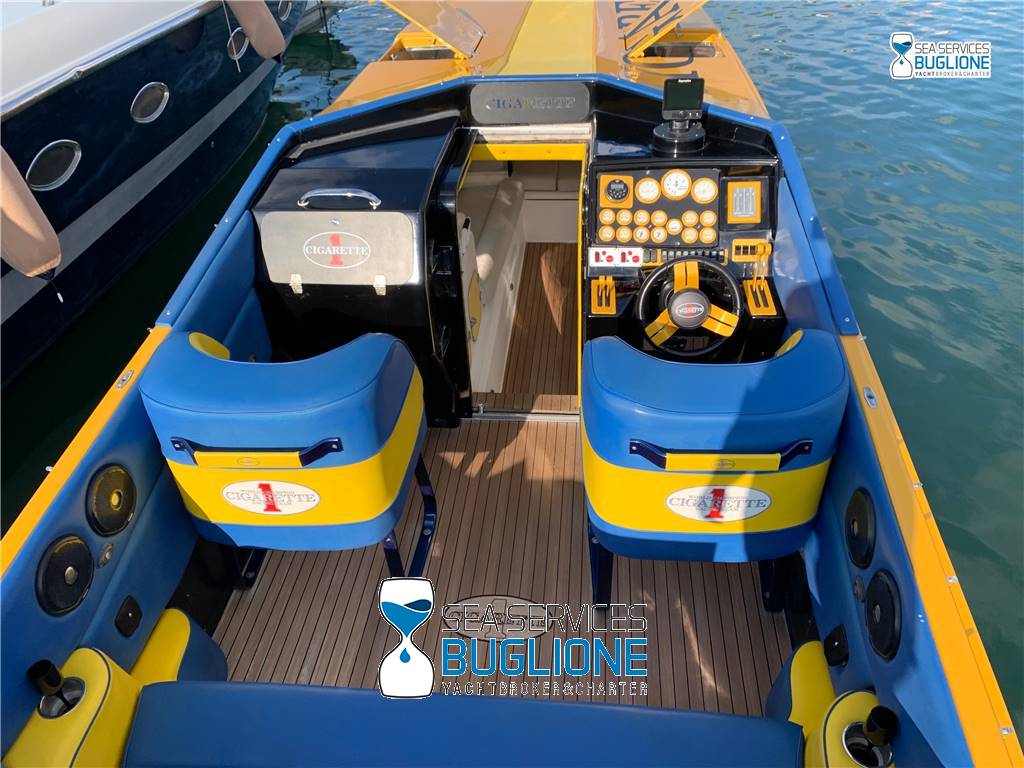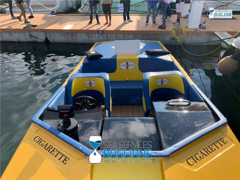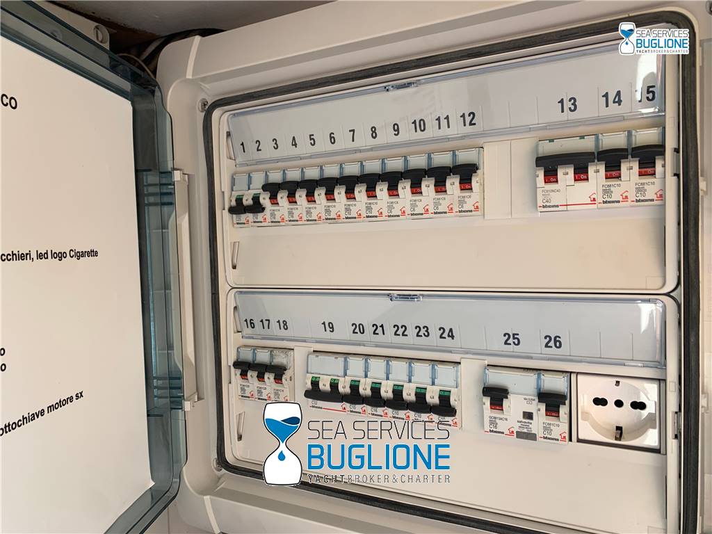 Notas internasaccesso al quadro generale dei magnetotermici con legenda (cablaggi pulsanti e cassetta nuova) wc elettrico a scomparsa. Letto matrimoniale a prua trasformabile grazie alle due tappezzerie laterali che possono facilmente essere spostate per garantire maggiore larghezza agli ospiti che desiderano riposare a bordo , testiera letto con logo cigarette. L'ambiente interno è stato refittato, i celini e le paratie in sky bianco garantiscono un ambiente fresco e luminoso. Il rifacimento dell'impianto elettrico dalla a alla z oltre l'aspetto fondamentale della sicurezza ha permesso anche di migliorare il comfort in cabina grazie ai nuovi punti luce a led che non emanano calore ed alla posa in opera di ventilatori a 12v ,e presa caricabatterie a 12v per tutto l'ambiente. Notas de la instrumentaciónGps Raymarine ultima generazioneEcoscandaglio integrato in unico monitor Luci di navigazione a Led ultima generazione Notas de armamentoLuci subacquee=Installazione led subacquei su poppa,murate e opera viva collegati a 12 led rgb su pozzetto, dinette e sala macchine comandati da app con telefoninoImpianto stereo interno ed esterno bluethoot Verricello elettrico 1500 watt catena calibrata da 8' ancora inox 15 kg Pedana di poppa blu con scaletta al centro molto comoda |