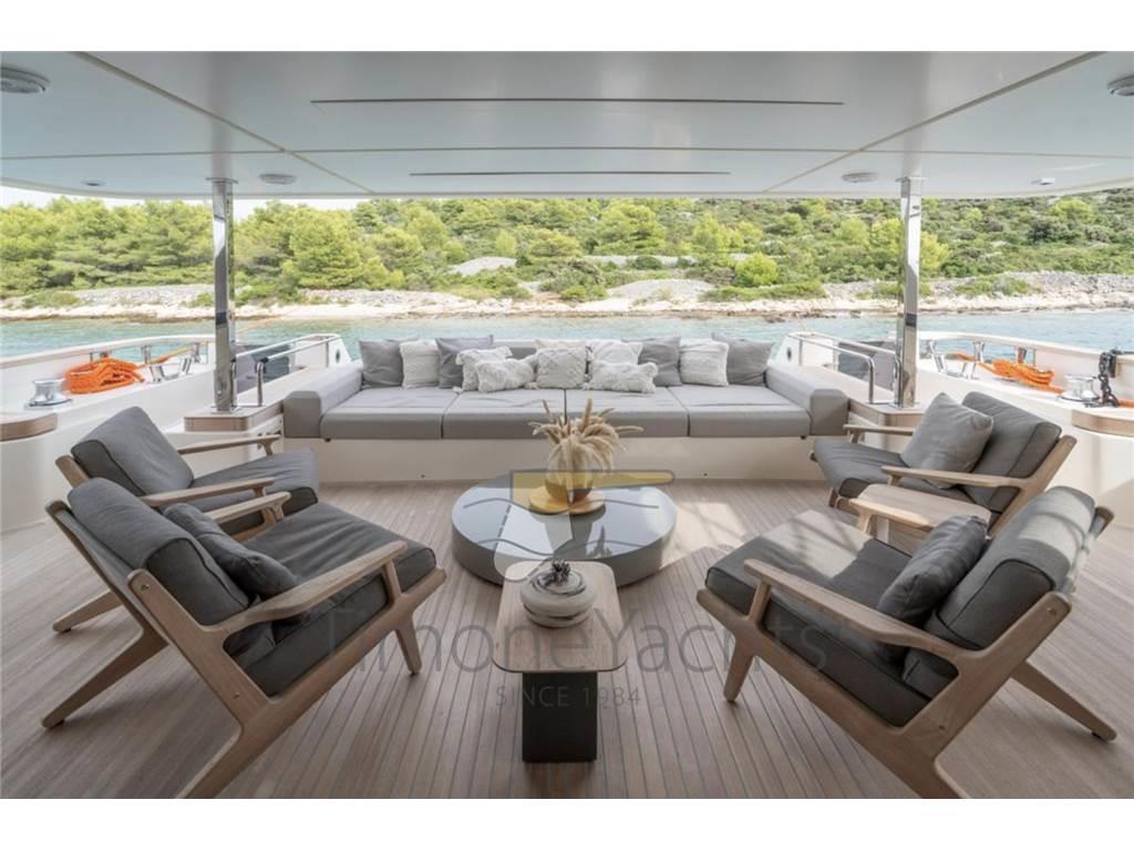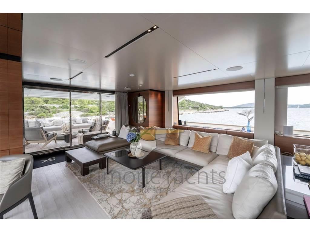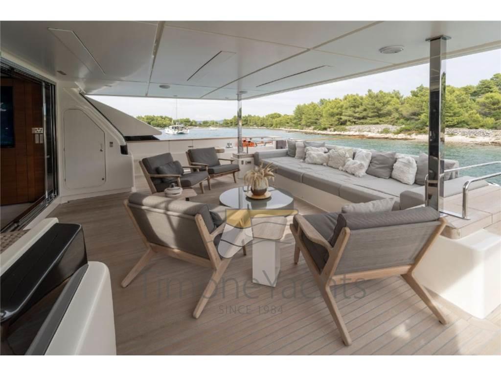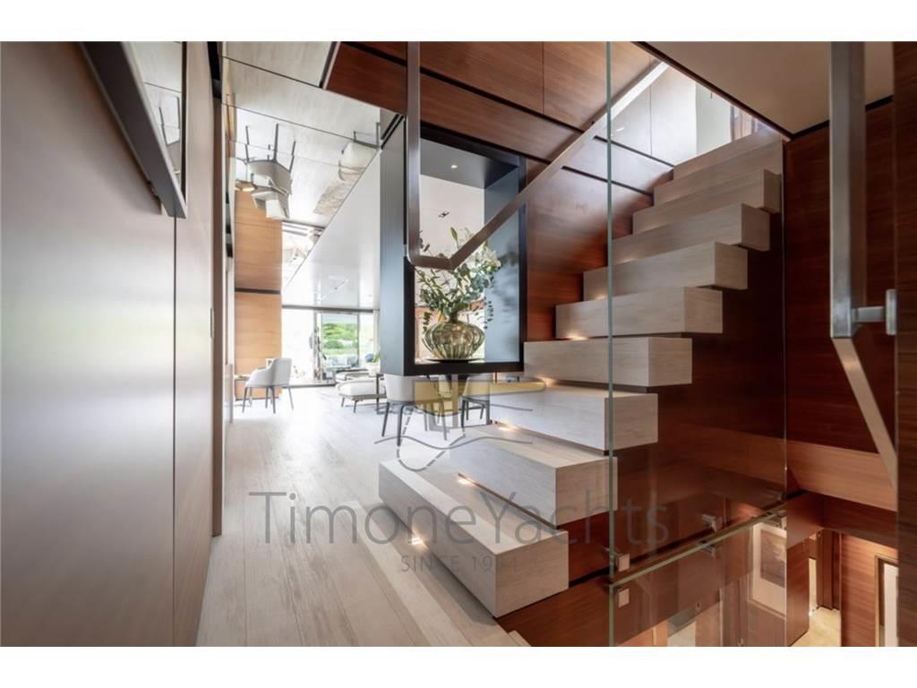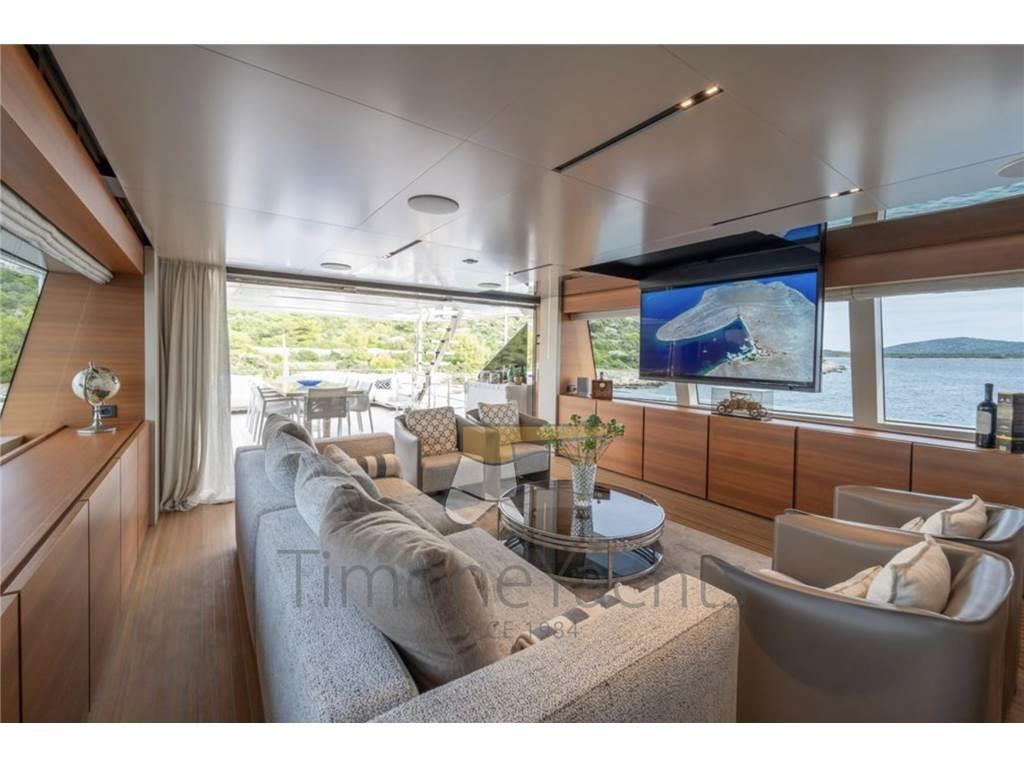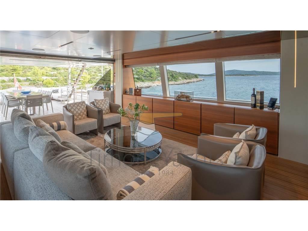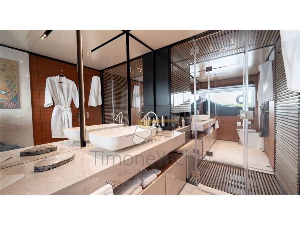 Notas internasEquipaggio: cabina comandante con bagno in zona timoneria, oltre che 5 posti letto crew al ponte inferiore, divisi in 3 cabine con tre bagni. Notas de la instrumentaciónAIS, 3 Comando motori elettronico (main helm + 2 side wings), 2 Contametri catena, DSC vhf, Pilota automatico, Plotter, Radar, Radio VHF, Sedile Copilota.Notas de armamentoAllestimento tecnico e di coperta:Bitte Abbattibili, Camminamenti laterali in teak, Elica di poppa - stern thruster, Elica di prua - bow thruster, Faro orientabile, Garage per tender, Hard top, Impianto antincendio, Lavaggio catena, Lavandino nel Pozzetto, Luci subacquee, Moto d'acqua, Passerella, Porta laterale, Pozzetto Teak, Presa 220V banchina, Presa acqua banchina, Stabilizzatori (nr 2 Seakeeper + ABI Trac fins), Tavolo pozzetto, Tender, Tromba, 2 Winch tonneggio di poppa, 2 Winch tonneggio di prua. Dotazioni domestiche di bordo: Aria condizionata, BBQ/ Grill, Collegamento internet, Controllo Domotica, Dimmer per Luci, 2 Dissalatore, Impianto acque nere, Pavimento interno in legno, Prese interne 12v, Prese interne 220v, Riscaldamento, Serbatoio Acque Nere, 6 WC marino elettrico (+ 4 crew). Intrattenimento: Altoparlanti, Antenna Satellitare TV, DVD, Home Theater, Impianto TV, Meccanismo saliscendi per TV, Radio AM/FM, Stereo, TV. Cucina ed elettrodomestici: Congelatore, Forno, Frigorifero esterno, Frigorifero interno, Ghiacciaia, ICE Maker, Lavasciuga, Lavastoviglie, Lavatrice, Macchina caffè, Microonde, Piastra elettrica, Piastra in vetroceramica, Winecooler. Tappezzerie: Bimini, Cappottina, Cuscineria completa, Cuscineria di poppa, Cuscineria di prua, Cuscineria fly, Cuscineria Pozzetto, Oscuranti, Teli copri finestra, Tenda Elettrica, Tendalino, Zanzariere. |