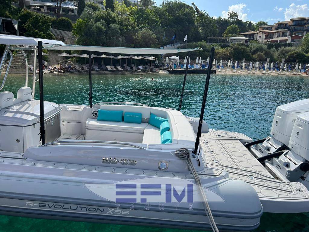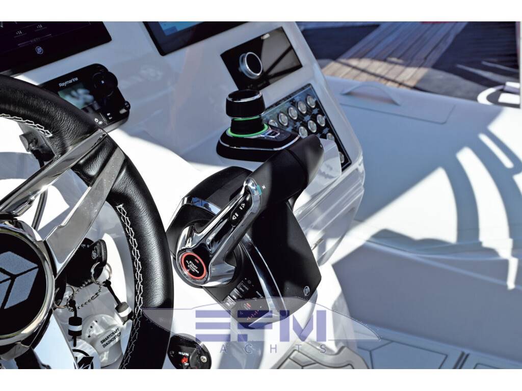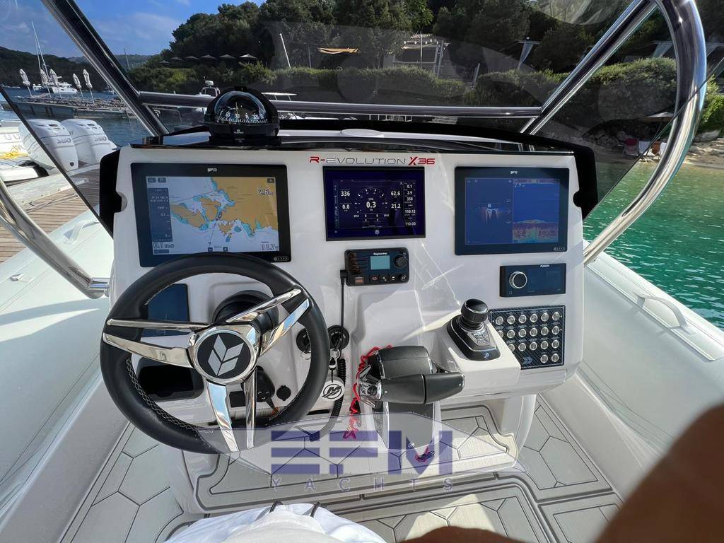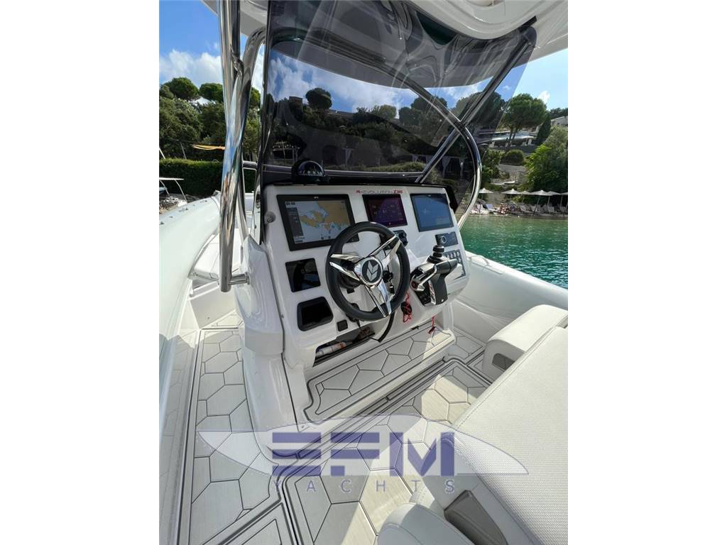 Notas internasLa vetroresina, invece di fondersi a strati sovrapposti, viene predisposta sullo stampo, al di sopra del quale si adagia una rete di piccoli tubi che apporta la resina. Il tutto viene poi coperto da un telo e, grazie a una pompa che estrae l’aria, viene messo sottovuoto. La depressione creata dall’assenza di aria spinge la resina in profondità, fra le fibre di vetro, in modo omogeneo e senza alcuno spreco. Oltre che per lo scafo, questa tecnica viene applicata anche per produrre la coperta e le strutture interne. I vantaggi? Sono tanti. Ci si potrà scordare dell’osmosi. La barca sarà più robusta e più leggera di circa il 30%, dato che viene impiegata più fibra di vetro e meno resina. TUTTI I COMFORT IN COPERTA Agli ospiti non resta che godersi la coperta, spaziosa e ricca di aree per i vari momenti di relax. Si parte dalla dinette di poppa, con tavolo centrale che diventa prendisole o paiolo calpestabile, fino al prendisole di prua. A poppa l’imbarco è agevolato da due passavanti in vetroresina, che permettono di camminare su un piano solido e sicuro, rispetto alle rotondità del tubolare. Sotto la consolle di guida troviamo un vano toilette, completo di lavandino con rubinetto/doccia e wc elettrico, con impianto smaltimento acque a norma CE. Dietro le sedute del pilota è posto un mobile cucina con frigorifero a cassetto da 70 litri, tagliere, lavandino e fornello monofuoco. Sono standard anche molti altri accessori e accorgimenti, come il gonfiatore elettrico e la cuscineria in cellula chiusa, che protegge le sedute dall’umidità e dall’azione del tempo. I passaggi da una zona all’altra sono agevoli, grazie al paiolo in rivestimento sintetico con disegno esagonale. Il T-top garantisce l’ombra necessaria, ma senza influire troppo sul peso: anche questo è realizzato in infusione sottovuoto, sorretto da tubolari in acciaio. Tanti i gavoni, tra cui quelli sotto le sedute di poppa e quelli in cui stivare i tendalini (di serie) e gli sci nautici. I dettagli di questo maxi gommone in realtà ricordano più quelli di uno yacht. Ma se qualcosa non dovesse incontrare il gusto dell’armatore, il livello di personalizzazione è veramente alto. Notas de la instrumentaciónOltre alla qualità costruttiva, i progettisti di Mar.Co hanno tenuto in considerazione anche le ambizioni corsaiole degli armatori. Per montare due o più motori che si prevedono di grossa cilindrata, R-Evolution X36 esce dal cantiere con bracket portante in vetroresina, versione 10,73 metri, con scaletta telescopica in acciaio inox a scomparsa.Per i due motori Mercury Verado V12 da 600 cv, che pesano a secco 572 kg ciascuno, il cantiere ha realizzato una plancia speciale, aumentando la portanza della carena nella zona di poppa. Un accorgimento che, oltre a garantire il corretto assetto del mezzo, si rivelerà fondamentale in navigazione. I Mercury Verado V12 da 600 cv sono l’oggetto del desiderio del momento, Sono motori da 12 cilindri, con trasmissione a due rapporti, i primi fuoribordo con piede sterzante; la timoneria elettro-idraulica è integrata. Sono dotati di un sistema per il lavaggio interno. L’accesso al motore è semplificato dallo sportello superiore, che permette di intervenire anche con i motori in acqua. Ogni 200 ore di moto, o prima di un invernaggio, è previsto il cambio olio e filtri. Quando sono tutti trimmati, occupano poco spazio sullo specchio di poppa, in modo da poterci lavorare agevolmente. La distanza minima tra uno e l’altro deve essere di almeno 27?. Tanti i sistemi di sicurezza, tra cui una leva interna che permette di sbloccare il motore nel caso si fermi con il piede sterzato. A proposito: l’angolo di sterzata è di 30°, che diventano 45° per il piede interno alla sterzata. Questi angoli, insieme al joystick, rendono l’unità che monta i Verado V12 estremamente manovrabile. Una cosa è certa: ad alte velocità non si scherza con virate strette e improvvise. Per motori di questo tipo, la propulsione multipla (almeno in coppia) è scontata. Quindi diventa fondamentale il joystick che troviamo in plancia, che a gennaio ha debuttato anche nella versione con display da 4?. Una delle informazioni fondamentali è l’angolo di barra: dato che non è possibile vederlo voltandosi indietro (la calandra non sterza), sarà il display a indicare qual è il verso dove è orientato l’angolo di sterzata in quel momento Notas de armamentoPanca pozzetto con tavolo abbattibile e trasformabile in prendisole e con portello accesso grande gavone tecnico poppa – Grande prendisole a prua - Autoclave completo di doccia – Bitte porta parabordi – Bussola – Cuscineria completa – Doppia batteria – imbarco acqua in acciaio – imbarco carburante in acciaio – Luci di navigazione complete di asta 360° – N°3 pompe di sentina automatiche– N°4 bitte – Ombrinali di scarico per svuotamento pozzetto – Pannello strumenti con interruttori – Rollbar in acciaio con TTOP - Tendalino custom posteriore con candelieri per copertura totale pozzetto - Parabrezza timoneria – Pozzetto , Plancetta di poppa – Salpa ancora completo di ancora Bruce inox e 50mt di catena nel gavone di prua – Seduta guida doppia con frigo integrata con mobile cucina con lavabo e fornello a gas – Serbatoio acqua 150 l – Serbatoio carburante acciaio inox 750l – Sfiato acqua in acciaio – Sfiato carburante in acciaio – Stacca batteria – Tromba – Verricello – Volante – Locale bagno in consolle con wc elettrico, doccia e lavabo – Consolle guida con strumento elettronico Mercury Vessel/View con Plotter e GPS integrato, caricabatterie e impianto di bordo a 220 V - copri consolle - Illuminazione notturna a led, impianto stereo completo di casse esterne interne. Plancetta bagno con scaletta inox. Salpancora 1500w a prua.Equipaggiamento Extra • T-TOP Vtr • Strumentazione Raymarine : 2 Plotter Axion12 con eco, VHF con gps integrato • telo copri consolle e copri cruscott