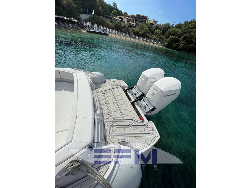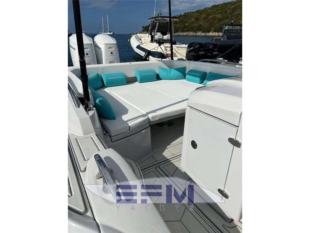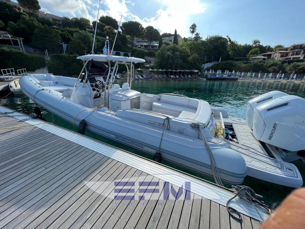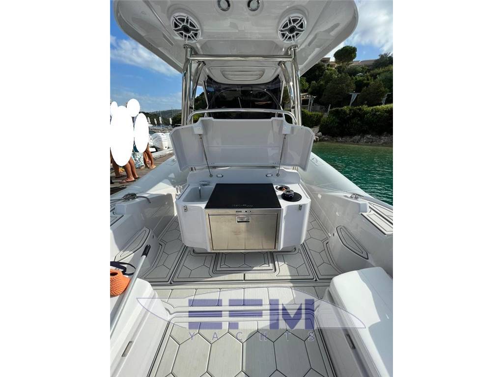 Notas internasLa vetroresina, invece di fondersi a strati sovrapposti, viene predisposta sullo stampo, al di sopra del quale si adagia una rete di piccoli tubi che apporta la resina. Il tutto viene poi coperto da un telo e, grazie a una pompa che estrae l’aria, viene messo sottovuoto. La depressione creata dall’assenza di aria spinge la resina in profondità, fra le fibre di vetro, in modo omogeneo e senza alcuno spreco. Oltre che per lo scafo, questa tecnica viene applicata anche per produrre la coperta e le strutture interne. I vantaggi? Sono tanti. Ci si potrà scordare dell’osmosi. La barca sarà più robusta e più leggera di circa il 30%, dato che viene impiegata più fibra di vetro e meno resina. TUTTI I COMFORT IN COPERTA Agli ospiti non resta che godersi la coperta, spaziosa e ricca di aree per i vari momenti di relax. Si parte dalla dinette di poppa, con tavolo centrale che diventa prendisole o paiolo calpestabile, fino al prendisole di prua. A poppa l’imbarco è agevolato da due passavanti in vetroresina, che permettono di camminare su un piano solido e sicuro, rispetto alle rotondità del tubolare. Sotto la consolle di guida troviamo un vano toilette, completo di lavandino con rubinetto/doccia e wc elettrico, con impianto smaltimento acque a norma CE. Dietro le sedute del pilota è posto un mobile cucina con frigorifero a cassetto da 70 litri, tagliere, lavandino e fornello monofuoco. Sono standard anche molti altri accessori e accorgimenti, come il gonfiatore elettrico e la cuscineria in cellula chiusa, che protegge le sedute dall’umidità e dall’azione del tempo. I passaggi da una zona all’altra sono agevoli, grazie al paiolo in rivestimento sintetico con disegno esagonale. Il T-top garantisce l’ombra necessaria, ma senza influire troppo sul peso: anche questo è realizzato in infusione sottovuoto, sorretto da tubolari in acciaio. Tanti i gavoni, tra cui quelli sotto le sedute di poppa e quelli in cui stivare i tendalini (di serie) e gli sci nautici. I dettagli di questo maxi gommone in realtà ricordano più quelli di uno yacht. Ma se qualcosa non dovesse incontrare il gusto dell’armatore, il livello di personalizzazione è veramente alto. Notas de la instrumentaciónOltre alla qualità costruttiva, i progettisti di Mar.Co hanno tenuto in considerazione anche le ambizioni corsaiole degli armatori. Per montare due o più motori che si prevedono di grossa cilindrata, R-Evolution X36 esce dal cantiere con bracket portante in vetroresina, versione 10,73 metri, con scaletta telescopica in acciaio inox a scomparsa.Per i due motori Mercury Verado V12 da 600 cv, che pesano a secco 572 kg ciascuno, il cantiere ha realizzato una plancia speciale, aumentando la portanza della carena nella zona di poppa. Un accorgimento che, oltre a garantire il corretto assetto del mezzo, si rivelerà fondamentale in navigazione. I Mercury Verado V12 da 600 cv sono l’oggetto del desiderio del momento, Sono motori da 12 cilindri, con trasmissione a due rapporti, i primi fuoribordo con piede sterzante; la timoneria elettro-idraulica è integrata. Sono dotati di un sistema per il lavaggio interno. L’accesso al motore è semplificato dallo sportello superiore, che permette di intervenire anche con i motori in acqua. Ogni 200 ore di moto, o prima di un invernaggio, è previsto il cambio olio e filtri. Quando sono tutti trimmati, occupano poco spazio sullo specchio di poppa, in modo da poterci lavorare agevolmente. La distanza minima tra uno e l’altro deve essere di almeno 27?. Tanti i sistemi di sicurezza, tra cui una leva interna che permette di sbloccare il motore nel caso si fermi con il piede sterzato. A proposito: l’angolo di sterzata è di 30°, che diventano 45° per il piede interno alla sterzata. Questi angoli, insieme al joystick, rendono l’unità che monta i Verado V12 estremamente manovrabile. Una cosa è certa: ad alte velocità non si scherza con virate strette e improvvise. Per motori di questo tipo, la propulsione multipla (almeno in coppia) è scontata. Quindi diventa fondamentale il joystick che troviamo in plancia, che a gennaio ha debuttato anche nella versione con display da 4?. Una delle informazioni fondamentali è l’angolo di barra: dato che non è possibile vederlo voltandosi indietro (la calandra non sterza), sarà il display a indicare qual è il verso dove è orientato l’angolo di sterzata in quel momento Notas de armamentoPanca pozzetto con tavolo abbattibile e trasformabile in prendisole e con portello accesso grande gavone tecnico poppa – Grande prendisole a prua - Autoclave completo di doccia – Bitte porta parabordi – Bussola – Cuscineria completa – Doppia batteria – imbarco acqua in acciaio – imbarco carburante in acciaio – Luci di navigazione complete di asta 360° – N°3 pompe di sentina automatiche– N°4 bitte – Ombrinali di scarico per svuotamento pozzetto – Pannello strumenti con interruttori – Rollbar in acciaio con TTOP - Tendalino custom posteriore con candelieri per copertura totale pozzetto - Parabrezza timoneria – Pozzetto , Plancetta di poppa – Salpa ancora completo di ancora Bruce inox e 50mt di catena nel gavone di prua – Seduta guida doppia con frigo integrata con mobile cucina con lavabo e fornello a gas – Serbatoio acqua 150 l – Serbatoio carburante acciaio inox 750l – Sfiato acqua in acciaio – Sfiato carburante in acciaio – Stacca batteria – Tromba – Verricello – Volante – Locale bagno in consolle con wc elettrico, doccia e lavabo – Consolle guida con strumento elettronico Mercury Vessel/View con Plotter e GPS integrato, caricabatterie e impianto di bordo a 220 V - copri consolle - Illuminazione notturna a led, impianto stereo completo di casse esterne interne. Plancetta bagno con scaletta inox. Salpancora 1500w a prua.Equipaggiamento Extra • T-TOP Vtr • Strumentazione Raymarine : 2 Plotter Axion12 con eco, VHF con gps integrato • telo copri consolle e copri cruscott
