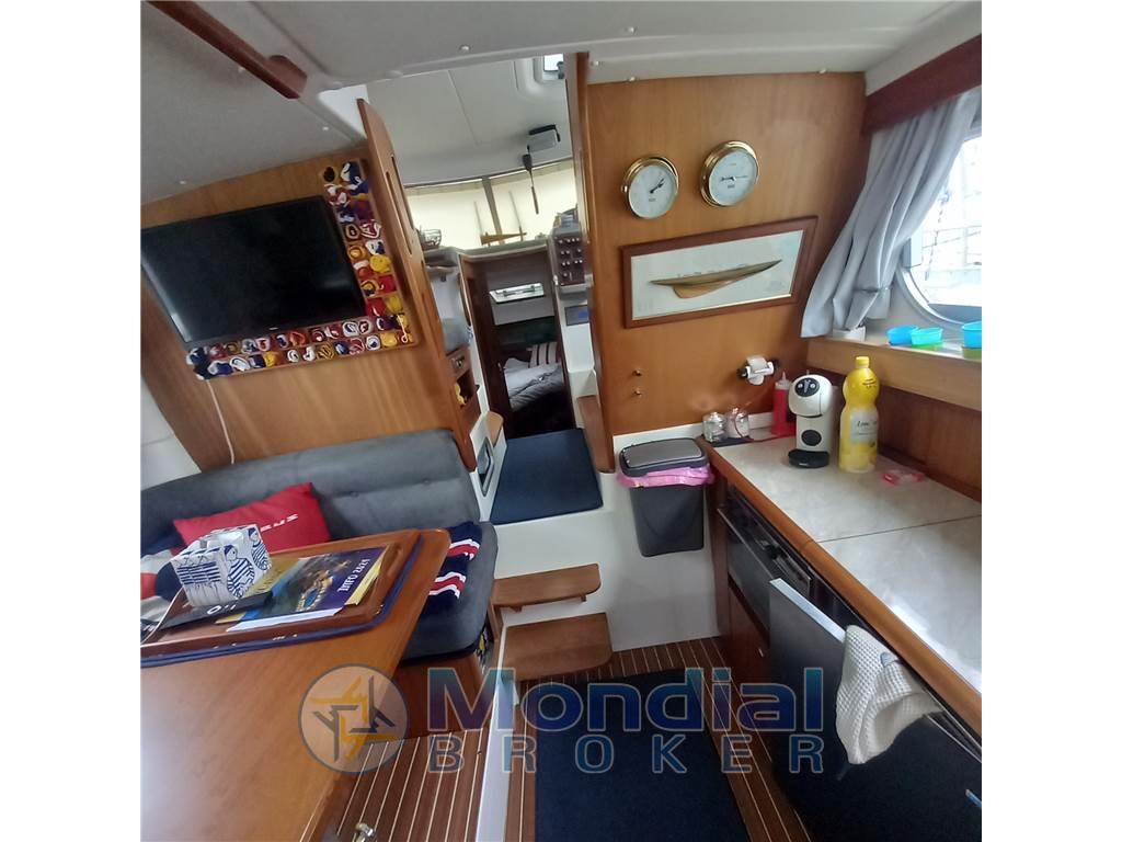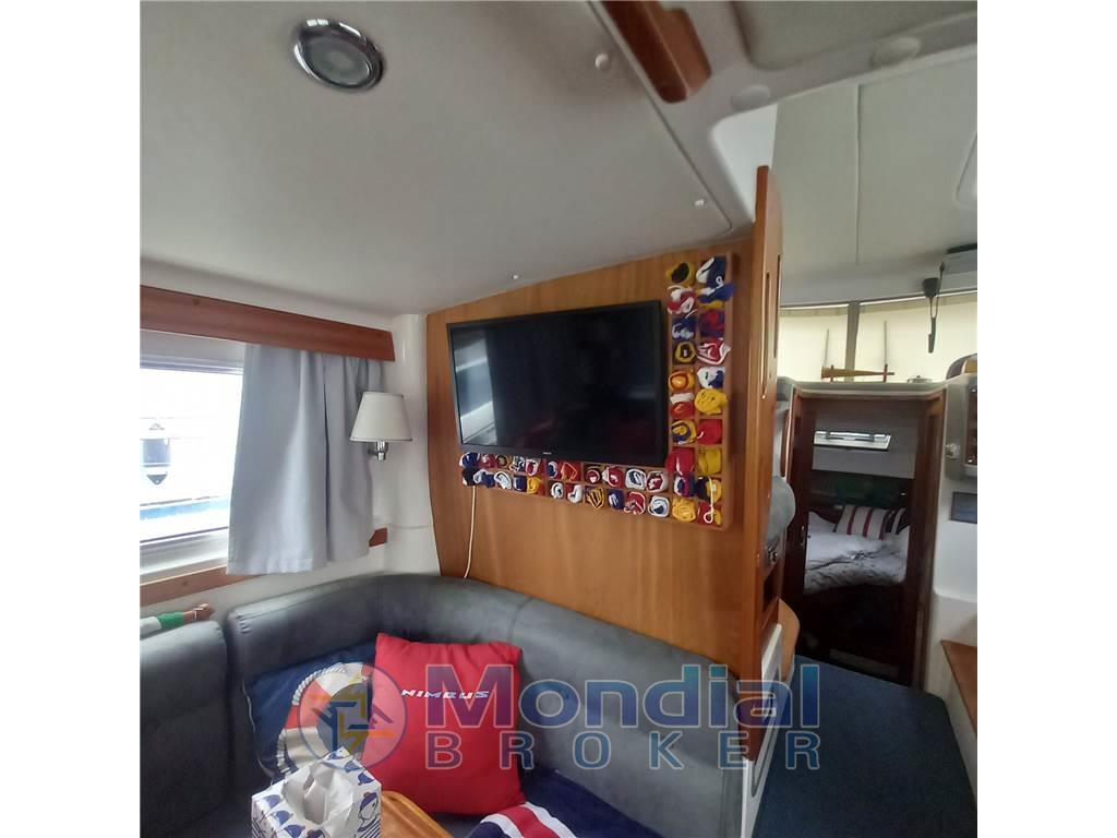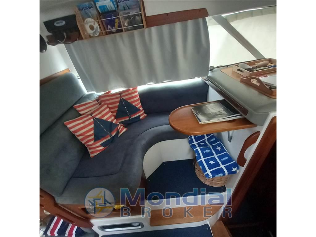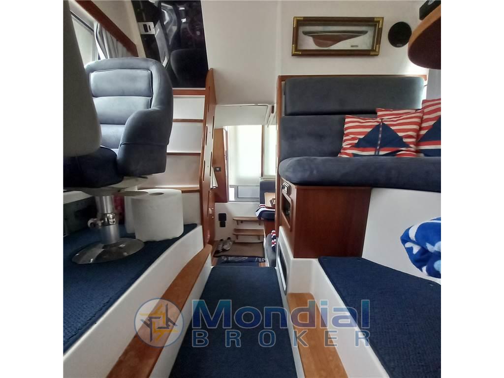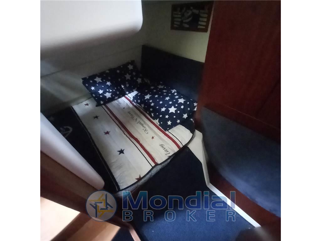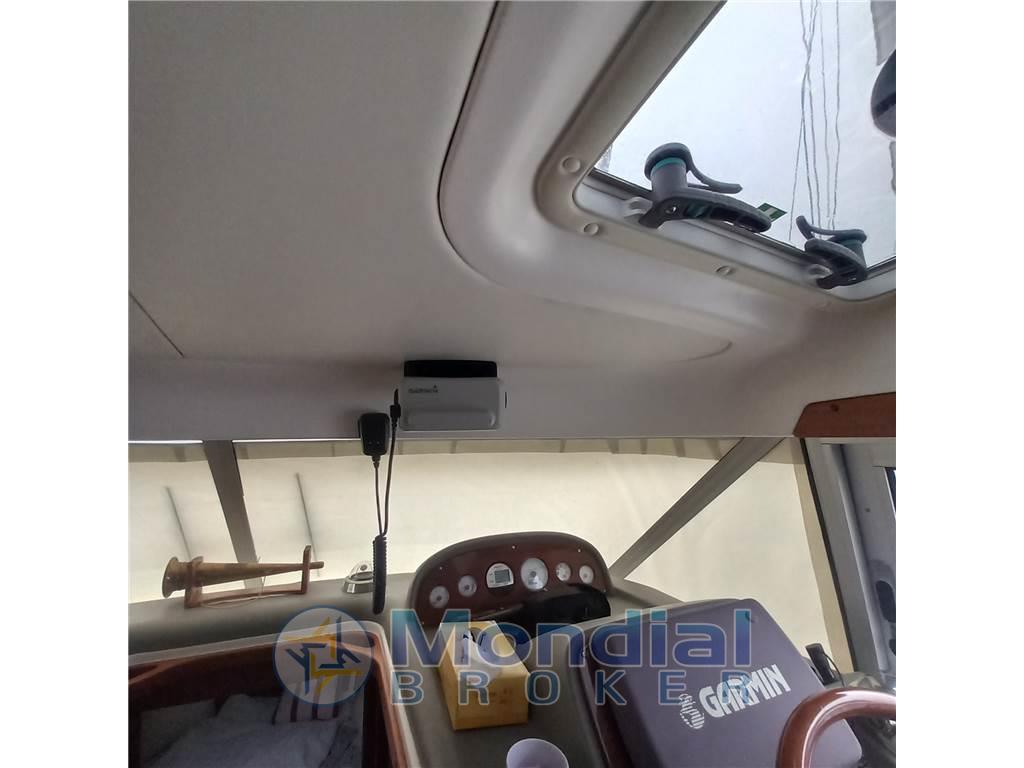 Notas internasNotas de la instrumentaciónAngolo barra, Antenna radar, Bussola, Comando motori elettronico, Computer di bordo, Contamiglia, Display, Ecoscandaglio, GPS (Garmin), Pilota automatico (Raymarine), Radar, Radio VHF, Yacht controller.Notas de armamentoAllestimento tecnico e di coperta:Autogonfiabile, Doccia esterna, Elica di poppa - stern thruster, Elica di prua - bow thruster, Faro orientabile, Flap idraulici, Impianto antincendio, Indicatori Flaps, Luci di cortesia, Motore ausiliario, Passerella, Piattaforma, Pompa di sentina automatica, Pompa di sentina manuale, Pozzetto Teak, Presa 220V banchina, Presa acqua banchina, Ripetitore strumentazione, Salpa Ancore Elettrico, Scaletta da bagno, Sistema Depurazione acque nere, Tavolo pozzetto, Tientibene con cancelletti, Tromba. Dotazioni domestiche di bordo: Aria condizionata, Clima reversibile, Impianto acque nere, Pavimento interno in legno, Prese interne 12v, Prese interne 220v, Serbatoio Acque Nere, WC marino elettrico. Intrattenimento: Altoparlanti, Digitale Terrestre, Impianto TV, Radio AM/FM, Stereo, TV. Cucina ed elettrodomestici: Fornello, Forno, Frigorifero esterno, Frigorifero interno. Tappezzerie: Bimini, Cuscineria completa, Cuscineria di poppa, Cuscineria di prua, Cuscineria fly, Cuscineria Pozzetto, Teli copri finestra, Telo Copertura Fly, Telo copriconsolle, Telo coprisedile, Tendalino. |