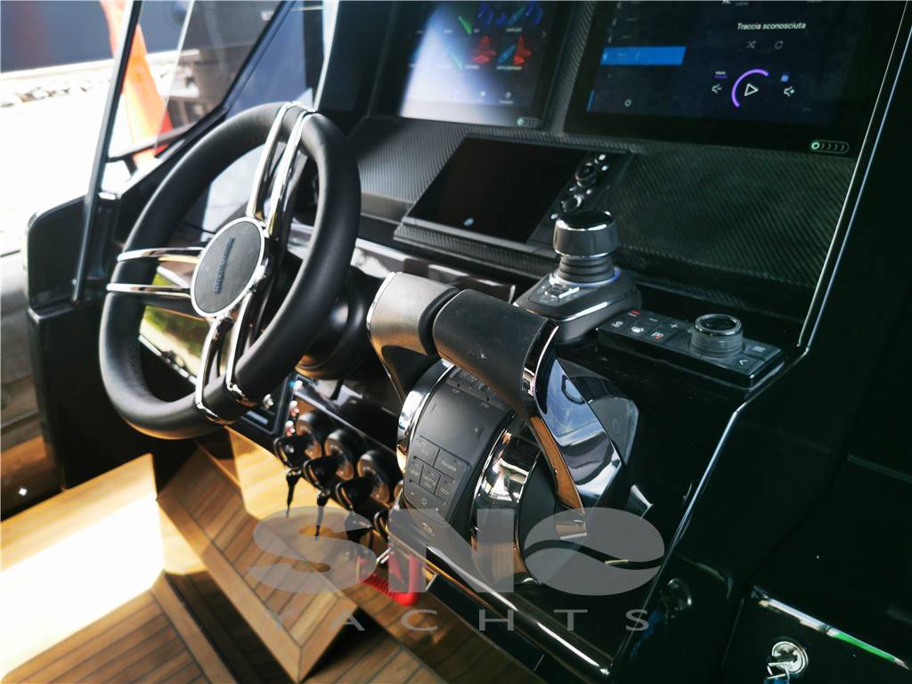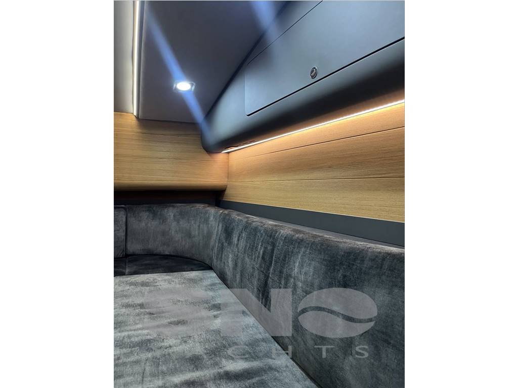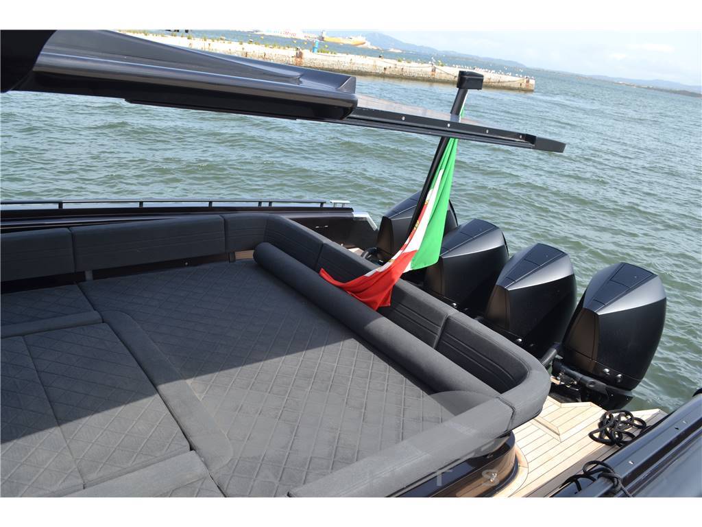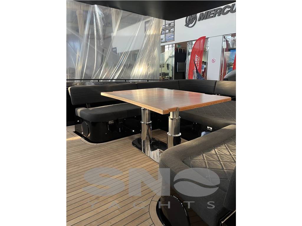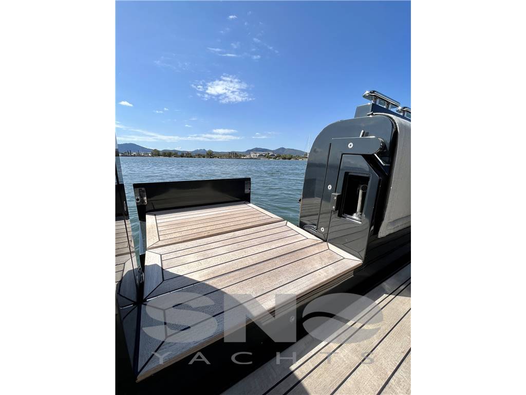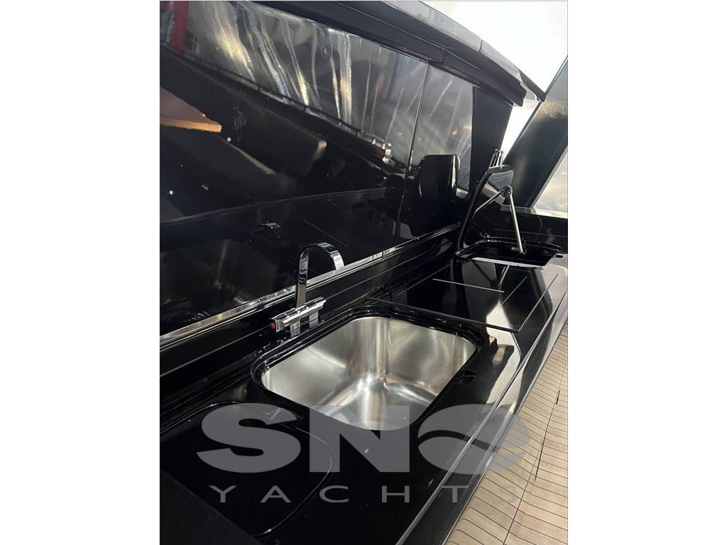 The deck offers a dinette area under a spacious roof and a cabinet with a fridge, sink, kitchen, and storage. The bow can be converted into a large sofa, sundeck, or dining area, covered by a sunshade for unmatched comfort. Below the deck, a dinette that converts into a bed and a bathroom with a separate shower offers a bright and ventilated environment, equipped with air conditioning. The deck design, close to the waterline, facilitates contact with the sea through side doors and stern accesses. The BS 160, with its dominant accessorised steering console, combines reliability, style and easy handling in all conditions.