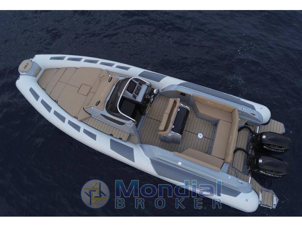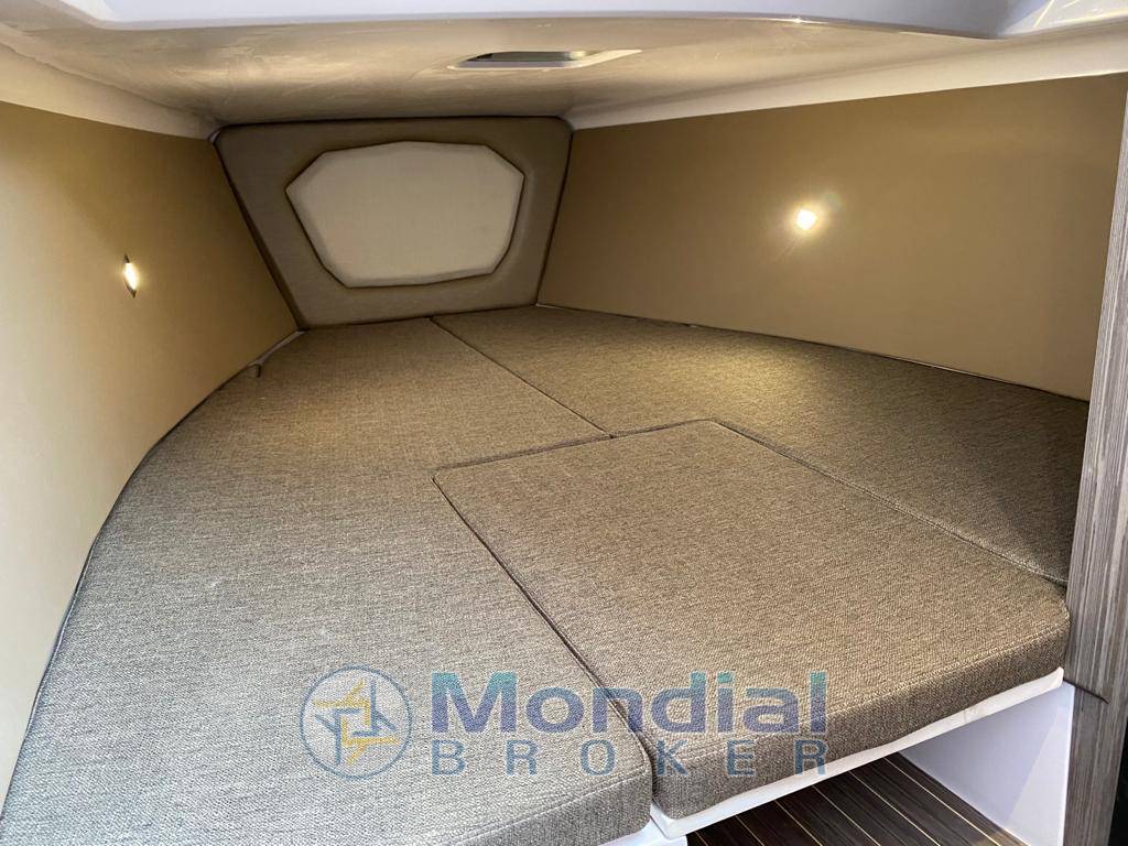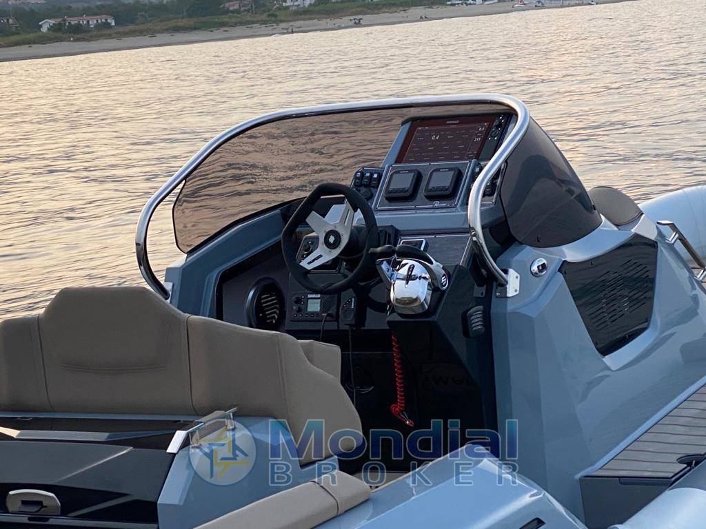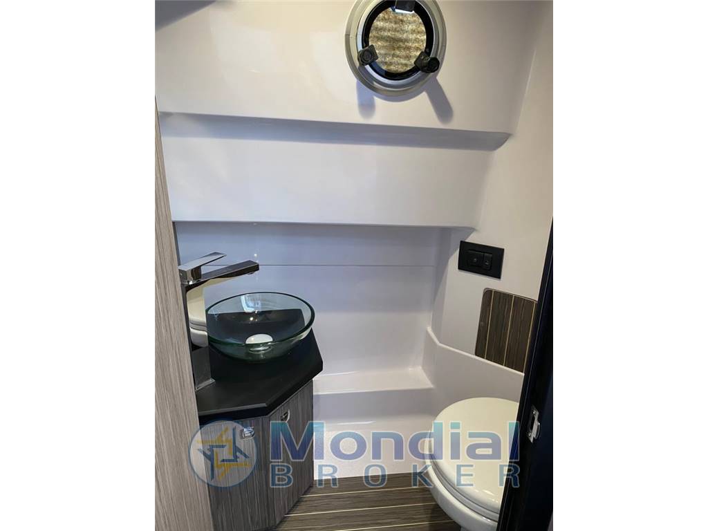 Notas internasIl passaggio tra le due plancette è agevole grazie al supporto che copre la vasca dei motori. Con questa soluzione è possibile sfruttare comodamente entrambe le plancette, nonostante la scaletta di risalita si trovi solo su quella di sinistra e, contemporaneamente, è possibile sollevare i motori per evitare la corrosione galvanica. Per accedere al pozzetto si passa dal lato di sinistra tramite un’apertura ricavata dalla spalliera. Qui il cantiere ha allestito la zona con un divano a C che occupa tutta la larghezza del battello, con la possibilità di estenderlo grazie ad un sistema di sostegni a ribalta che si trovano al di sotto del cuscino centrale. In più, grazie alla predisposizione al centro del quadrato, si può inserire un tavolo che forma una dinette di poppa. Aggiungendo l’ulteriore seduta ribaltabile, ricavata al di sotto del mobile cucina, possono trovare posto comodamente 7 persone. Notas de la instrumentaciónVHF, Lettore CD, Bussola, Ecoscandaglio, GPSStrumentazione elettronica di navigazione Display (Vessel Wiew Suzukiy 9 pollici), GPS (SIMRAD 9 pollici), Joystick (Mercury), Radio VHF (Raymarine VHF 63 GPS), Sedile Copilota (Seduta Boolster), Notas de armamentoDoccia pozzettoComfort / Interni Pompa di sentina elettrica, WC elettrico Steering System Joystick Control Categoria di navigazione B - D’altura |