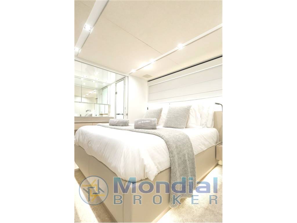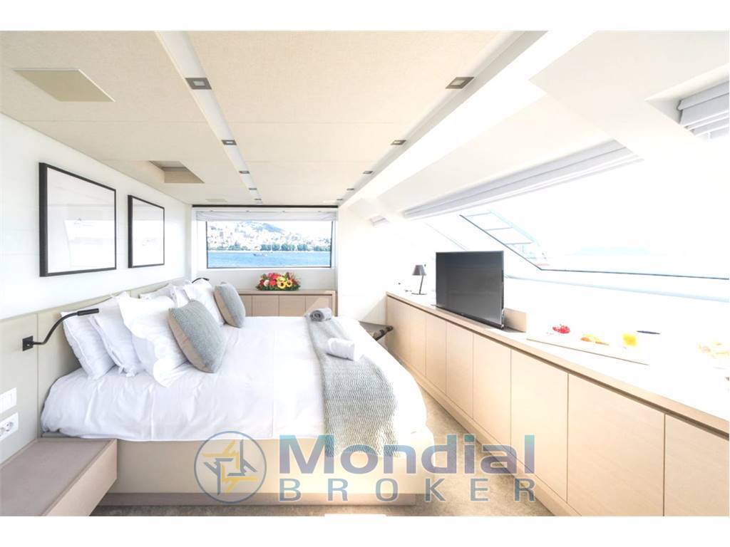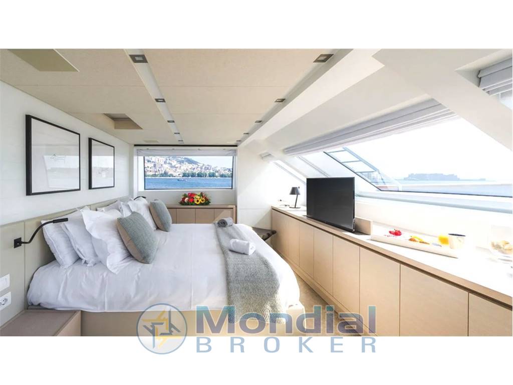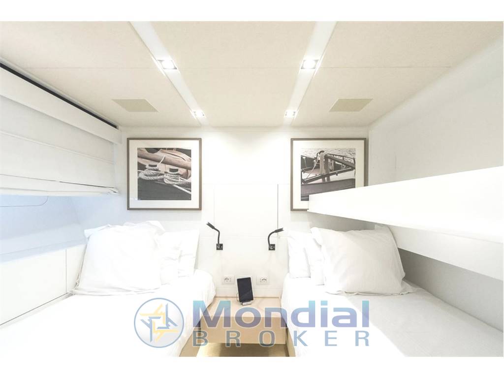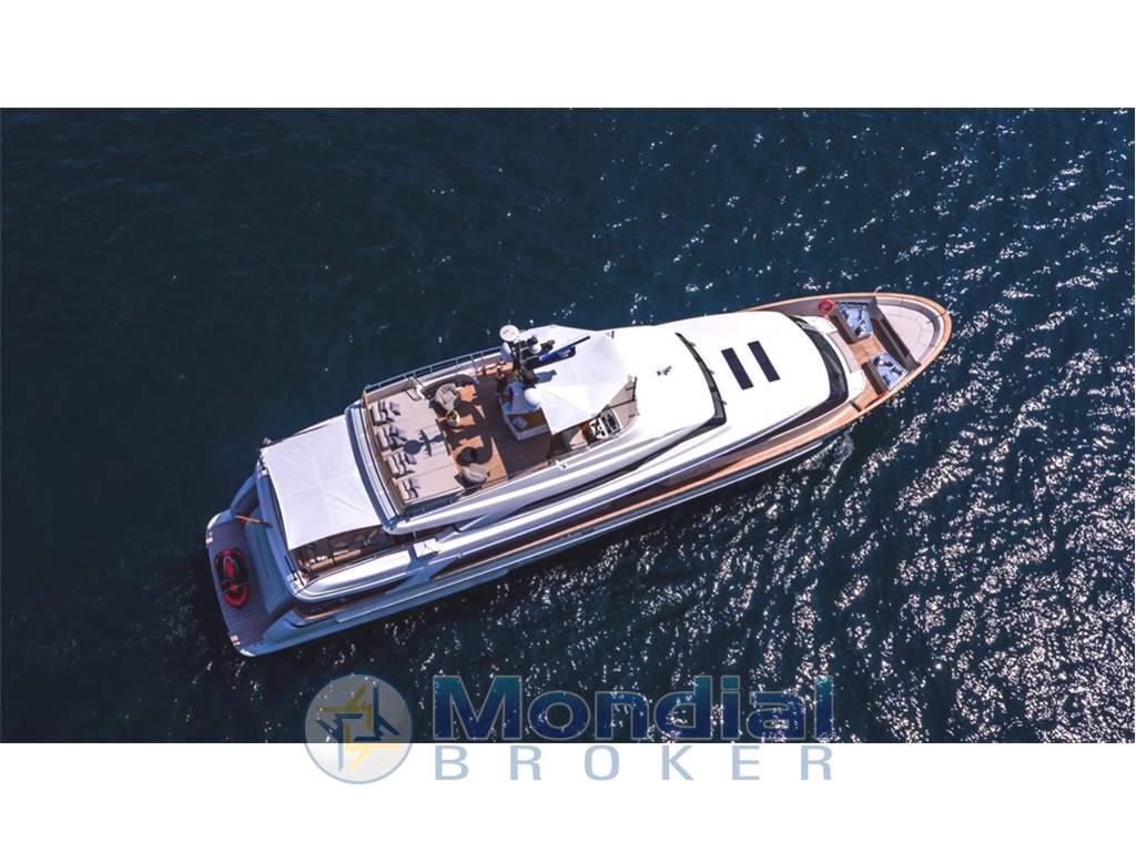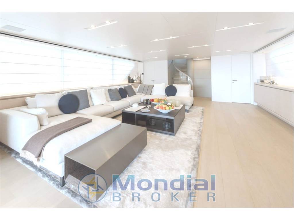 Notas internasGuest Cabin Configuration: Master (Double with King-size bed on Main Deck) 2 VIP Doubles 2 Twin guest cabins, one with additional Pullman bed, the other convertible to double with sliding bed Guest Bathrooms: 7 (day-heads on main deck and upper deck) Crew Accommodation: 6 Persons in 3 cabins with en-suite facilities Crew Bathrooms: 3 Crew mess Main deck with saloon, with corner sofa, armchair and coffee table, Dining room with table for 8, Day-head and fully equipped Galley Upper deck with wheelhouse, day-head, saloon and dining Independent AC controls system in every area finished in marble with parquet flooring Notas de la instrumentaciónWheelhouse Steering Position:Radar (Black Box type) Chart Plotter (Black Box type) Control keyboard for Radar and Chart Plotter 3 x 19” Monitors interfaced with radar, chart plotter, on-board computer and CCTV Rudder angle indicator Autopilot control panel with dedicated tiller 2 x Multi-function instruments (with Anemometer data repetition) 1 x VHF 1 x Magnetic Compass 1 x Search light control panel Sundeck Manoeuvring Position: 1 x Rudder Angle Indicator Antennae Mast: 1 x VHF Antenna 2 x GPS Antennas Open Array 6’ Radar Antenna Anemometer Searchlight Intercom: Dedicated communication system to connect the wheelhouse steering positions with the engine room Internal Communication Telephones: Main saloon Owner’s cabin Crew dinette Captain’s cabin VIP cabins Guest cabins Wheelhouse Sky lounge ENTERTAINMENT EQUIPMENT Saloon Main Deck: TV ‘Smart TV’ LED 50” with an up/down mechanism Multi zone amplifier with AIR play and 5.1 home theatre kit comprising a subwoofer and 5 ceiling integrated speakers with connection to the cockpit and sundeck DVD Blu-ray 3D player iPad Mini for central control of equipment and docking station Cockpit Main Deck: 2 x Paired speakers integrated in the headlining connected to the saloon equipment Controlled by the saloon iPad Mini Sky Lounge Upper Deck: TV ‘Smart TV’ LED 46” with an up/down mechanism Multi zone amplifier with AIR play and 5.1 home theatre kit comprising a subwoofer and 5 ceiling integrated speakers with connection to the cockpit and sundeck DVD Blu-ray 3D player iPad Mini for central control of equipment and docking station Cockpit Upper Deck: 2 x Paired speakers integrated in the headlining connected to the sky lounge equipment Controlled by the sky lounge iPad Mini Sun Deck: 4 x (2 + 2) Paired speakers integrated in walls connected to the sky lounge equipment iPad Mini for central control of the equipment and docking station Owner’s Cabin: TV ‘Smart TV’ LED 40” Amplifier with AIR play and 2.1 home theatre kit comprising a subwoofer and 2 ceiling integrated speakers DVD Blu-ray 3D player iPad Mini for central control of equipment and docking station Forward Guest Cabins (2): TV ‘Smart TV’ LED 28” Amplifier with 2 ceiling integrated speakers DVD Blu-ray 3D player Infrared signal repeater Aft Guest Cabins (2): TV ‘Smart TV’ LED 32” Amplifier with 2 ceiling integrated speakers DVD Blu-ray 3D player Infrared signal repeater Captain’s Cabin: 8 Autoradio with DVD player and 2 ceiling integrated speakers TV predisposition Crew Cabins: Predisposition for TV, car stereo and ceiling speakers Galley/Crew Dinette: TV LED 28” Compact Hi-Fi system with 2 ceiling integrated speakers DVD player connected to the Hi-Fi system Infrared signal repeater Helm: Autoradio with 2 ceiling integrated speakers Bow Area: Predisposition for speakers connected to the sun deck zone of the sky lounge amplifier Land TV antenna and AM/FM radio antenna Audio system managed by CRESTRON Notas de armamentoBow Thruster: Electrical bow thruster 400VAC/50Hz 3-phase, 45kWStabilizers: 2 x CMC Electric zero speed stabilizers 400 VAC/50Hz 3-phase, 5kW Trimming System: Stainless-steel Intruder (AISI 316) on the transom, below the waterline, to raise the stern during navigation and increasing the performances Air Conditioning: 240,000 BTU/h Chiller Unit composed by 2 x compressors installed in the engine room ELECTRICAL SYSTEM Electrical Circuits: 400VAC/50Hz 3-phase grounded neutral, for main power circuits 230VAC/50Hz single phase for accommodation and technical area lights 24 VDC from batteries, with negative to earth, for small appliances, visual signals, night accommodation lights, emergency lights, electronics and main engine starters 12VDC from batteries with grounded neutral, for diesel generators start up and VHF emergency power supply 12VDC from transformer DC/DC for radio navigation system Generators: 1 x 70 kW KOHLER 70EFOZDJ, and 1 x 54 kW KOHLER 54EFOZDJ 400/230 VAC, 50Hz 3-phase @ 1500 RPM Batteries: Services Batteries: 24VDC gel/AGM batteries (500Ah) Main Engines Electronic Control Batteries: 24VDC gel/AGM battery for each of main engines’ own electronic control Main Engines Start Batteries: 24VDC gel/AGM battery for main engines’ start up Generators Start Batteries: 12VDC gel/AGM batteries for starting each electric generator Emergency Batteries: 24VDC gel/AGM batteries for stairs, escape hatches and passages emergency lights; engine room emergency lights; emergency power supply for navigation lights and relevant switchboard; emergency power supply for fire detection system; emergency power supply for navigation electronics; emergency power supply for firefighting pump VHF Emergency Battery: 12VDC gel/AGM battery Battery Chargers: 1 x 24VDC automatic battery charger for service batteries 1 x 24VDC automatic battery charger for main engines start up batteries 1 x 24VDC automatic battery charger for main engines electronic control batteries 1 x 24VDC automatic battery charger for emergency batteries 1 x 12VDC automatic battery charger for generators start up batteries 1 x 12VDC automatic battery charger for the VHF emergency batteries Shore Power: GLENDINNING Cablemaster CM8 for shore sockets 100/125 A with 20m cable Insulation Transformer: 400VAC/50Hz 3-phase, 60kVA 3ph/3ph+G+N |