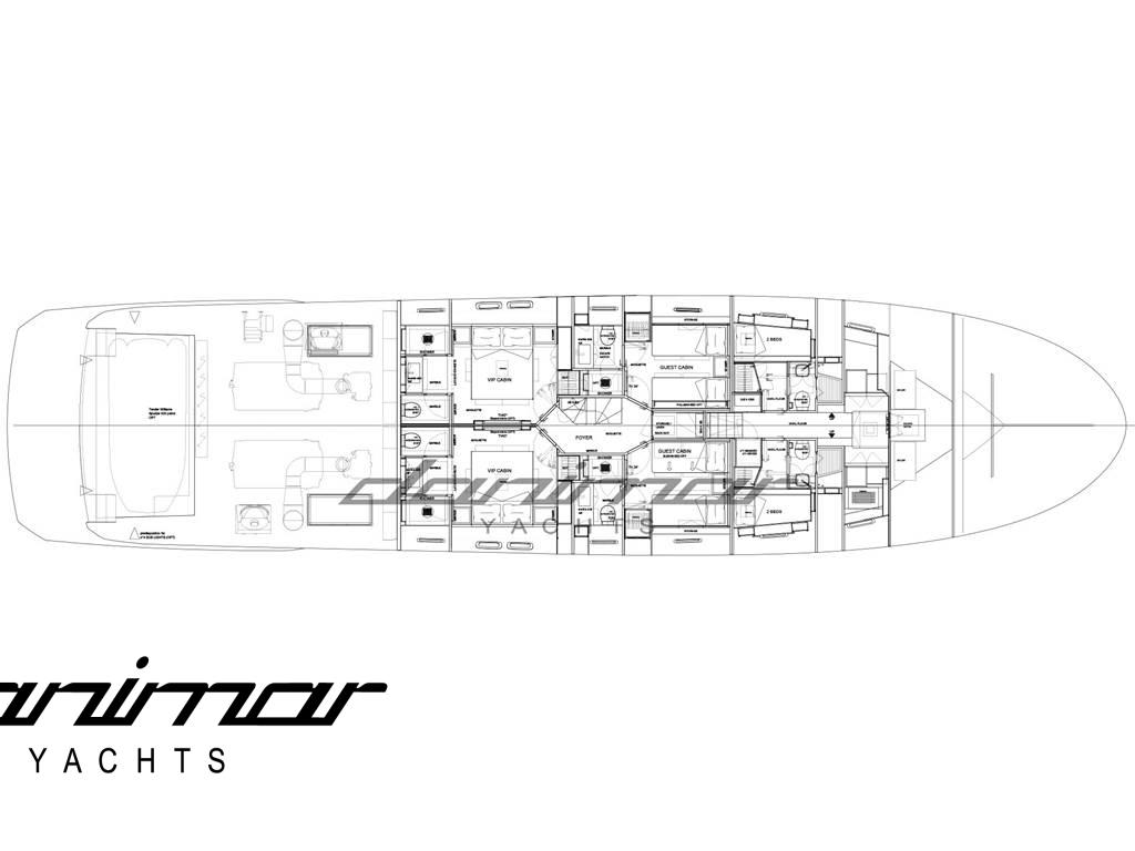 Notas internas2 Doppia in piano, 3 Matrimoniale italiana, 2 Cabina equipaggio, 6 Toilette.