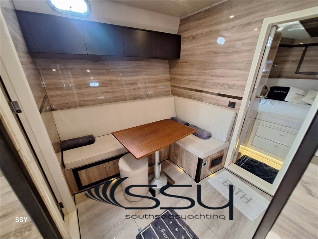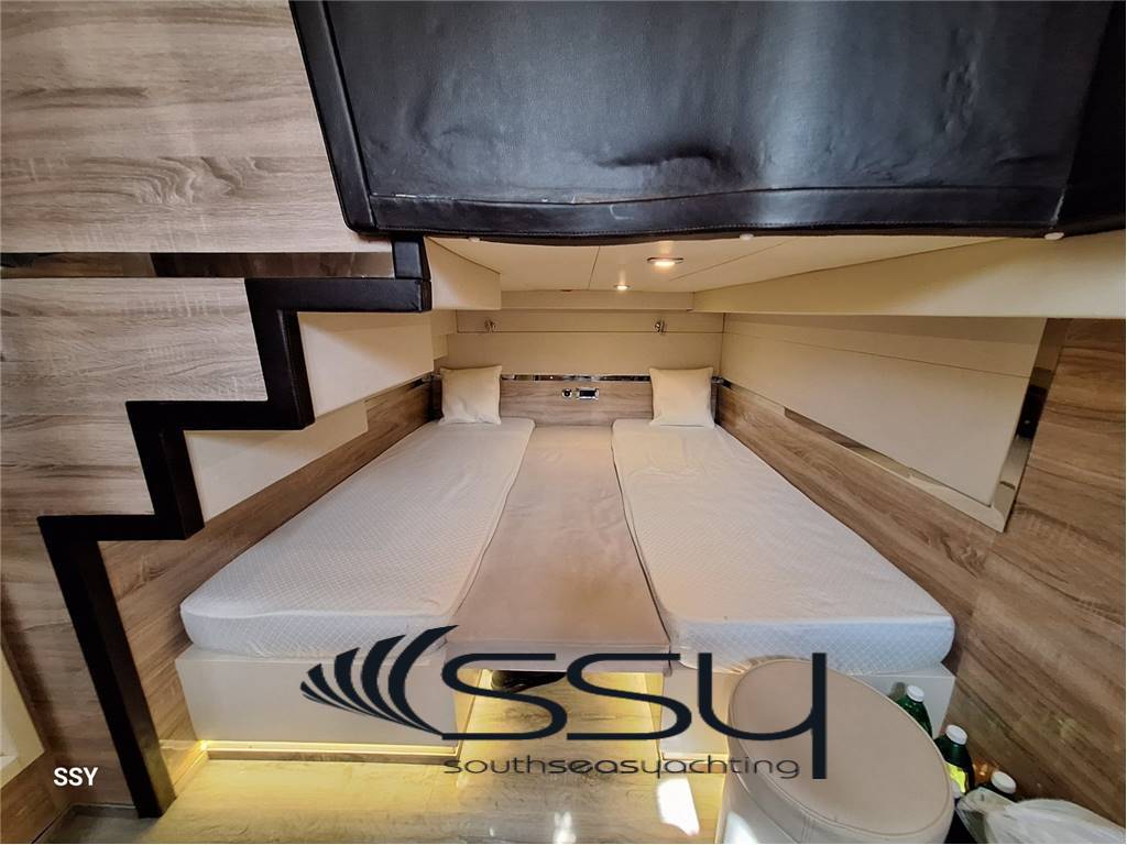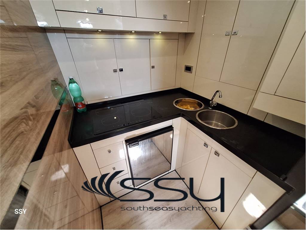 Notas internas- quadrato living con a sx divano ad “l” in pelle e tavolo telescopico, zona cucina contrapposta completa di doppio lavello, piano cottura Schott Ceran, frigorifero Indel e forno a microonde; - Cabina armatoriale matrimoniale a prua con doppio armadio, LED TV ed impianto stero; - cabina ospiti verso poppa con letti in piano trasformabile in matrimoniale ed impianto stereo; - ampio bagno con doppio accesso e completo di doccia. 2-CABIN VERSION with maple wood interiors and white lacquered furniture. - The main salon features an L-shaped leather sofa to port with a telescopic table, and a fully equipped galley to starboard, including double sink, Schott Ceran cooktop, Indel refrigerator, and microwave oven; - The master cabin is located forward and offers a double bed, two wardrobes, LED TV, and a stereo system; - The guest cabin, located aft, has twin beds convertible into a double bed, and also features a stereo system; - There is a spacious bathroom with dual access and a separate shower. Notas de la instrumentaciónVHF Icom IC-M323;2xGarmin GPSMap 8012 tocuhscreen multifunction plotters; digital engine instruments; echo + log + wind; rudder ind. level / ind. angolo di barra; trim tab / ind. flaps; bowthruster MaxPower elica di prua; electric searchlight / faro di ricerca elettrico. Notas de armamento- gruppo elettrogeno Onan 4MDKBH 220V/50Hz;- caricabatterie Victron Centaur 12V/100A; - caricabatterie gruppo Quick SBC 140 NRG 12V/12A; - impianto A/C reversibile Coolmar; - verricello salpancora Quick; - ancora e musone in acciaio inox; - garage tender + scaletta bagno retrattile; - passerella idraulica a scomparsa; - tendalino di poppa con pali ad innesto; - impianto HIFI Fusion MS-RA70 (int/est); - impianto TV con digitale terrestre; - mobile bar pozzetto con lavello e frigo Indel; - tavolo pozzetto ampliabile; - prendisole a prua ed a poppa; - prese USB interne ed esterne; - cappe ed oscuranti completi; - dotazioni di sicurezza complete. - Onan 4MDKBH generator 220V/50Hz; - Victron Centaur battery charger 12V/100A; - Quick SBC 140 NRG battery charger 12V/12A (for generator); - Coolmar reversible air conditioning system; - Quick electric anchor windlass; - Stainless steel anchor and bow roller; - Tender garage + retractable swim ladder; - Retractable hydraulic gangway; - Aft sun awning with removable poles; - Fusion MS-RA70 Hi-Fi system (interior/exterior); - TV system with digital terrestrial antenna; - Cockpit bar cabinet with sink and Indel fridge; - Extendable cockpit table; - Bow and aft sunpads; - USB sockets inside and outside; - Complete set of covers and blinds; - Full set of safety equipment. |