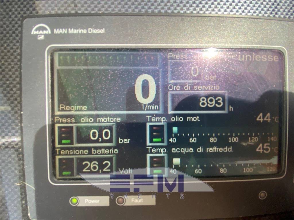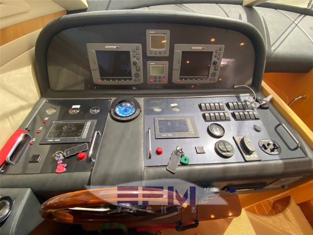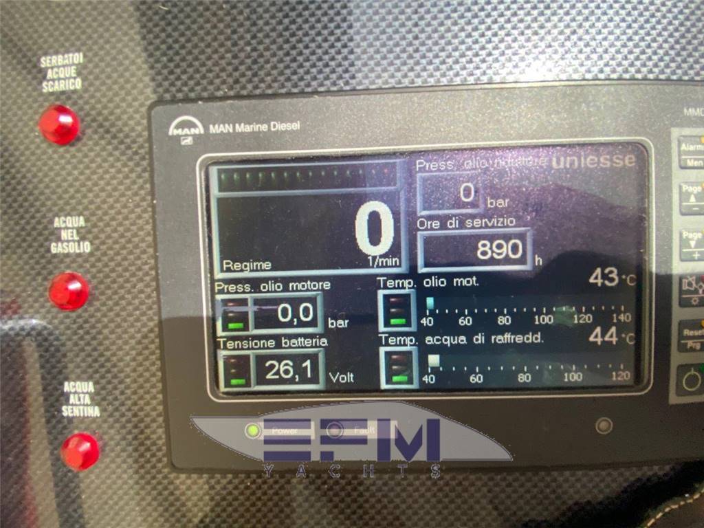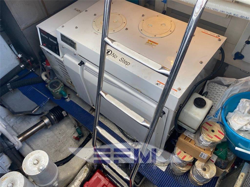 Construction CE omologation certificate category ?A? Topsides and deck in GPR hand laid vinilester resin with airex sandwich Transverse and longitudinal reinforcement throughout hull made with unidirectional and woven roving glassfibre Bottom deck and Flybridge in blister resistant vinilester resin hand laid Isophtalic gelcoat finishing (ivory colour Uniesse standard) Epoxy resins, antiosmosis and ntifouling bottom paint Deck and Hull Anchor Bruce Kg. 30 Air intake for engine aeration Bow and Stern stainless steel fairleads (nr. 02) Cockpit and swimming platform in teak Cockpit shower with hot/cold water mixer control Cylindrical fenders (nr. 06) Diesel fillers (nr. 02) Dockside water pressure Electric connecting cable for shore power supply Electric hydraulic gangway Opacmare Electric windlass 1500 W with controls (bow, bridge and Flybridge) Engine Man 900 hp Glass windshield Halogen lighting in the cockpit Hatch on bow Large chain locker complete with Vtr doors on bow Large cockpit sofa with imitation leather cushions Lateral cockpit storage Mooring lines Seawater electric pump with outlets in cockpit and on bow with chain wash Stainless steel cleats on bow (nr. 02) Stainless steel grab rail Stainless steel lateral cleats (nr. 02) Stainless steel cleats on aft (02) Stainless steel pulpit and stanchions Stainless steel safety transom gates to swimming platform (nr. 02) Stainless steel swimming platform ladder Vtr hatch-way to crew cabin from the cockpit Water filler Zinced chain (10mm mt. 75) Windscreen wipers (02) and wiper washer (02) Flybridge Canvas cover for consolle and cabinet on Flybridge Helmsman and passenger?s Vtr bench seat with imitation leather cushions Large ?C? shaped Vtr sofa with imitation leather cushions Halogen Lighting Plexiglass and stainless steel windscreen Round adjustable wood table Stainless steel mast for radar and boat hook Stainless steel safety handrail to cockpit Sun bathing area with imitation leather cushions Vtr cabinet with sink and hot/cold water mixer Vtr consolle Vtr radar-arch for navigation lights, Tv/Vhf antenna and Gps |