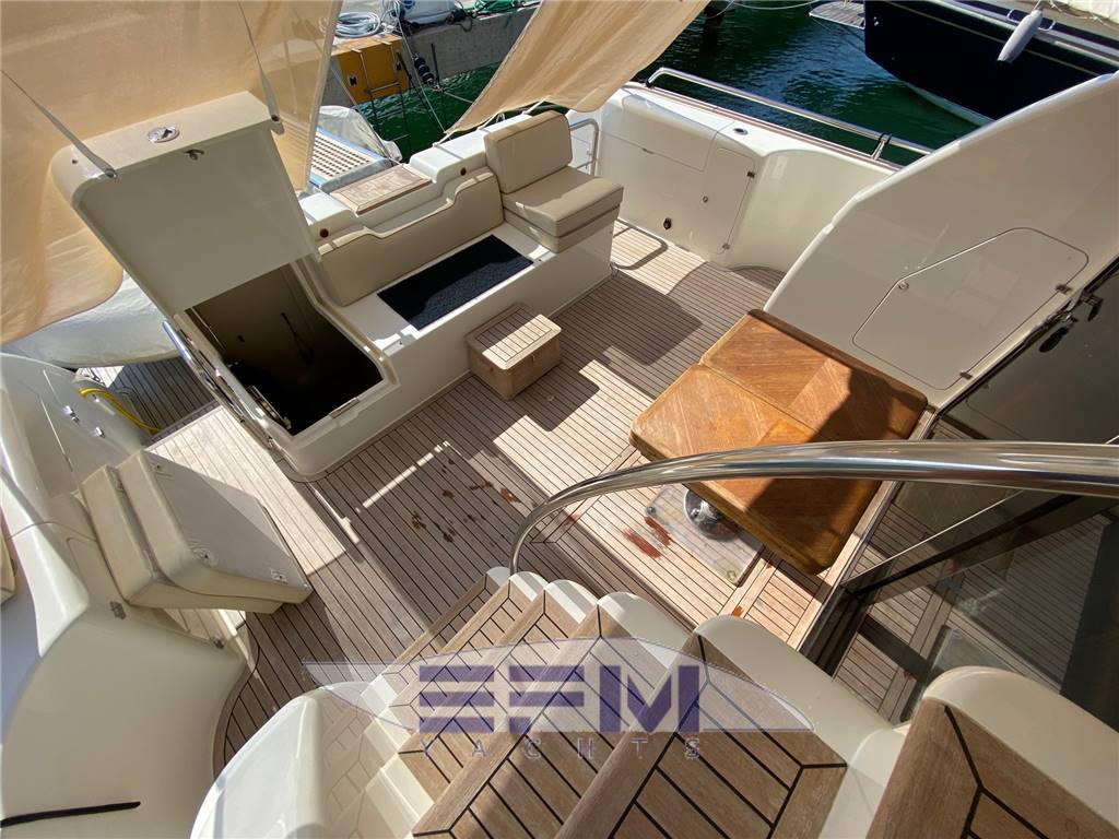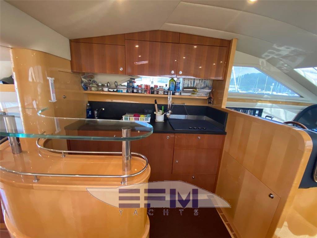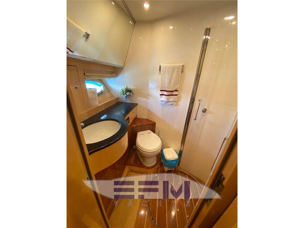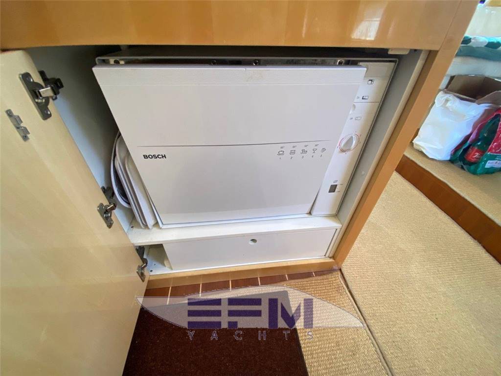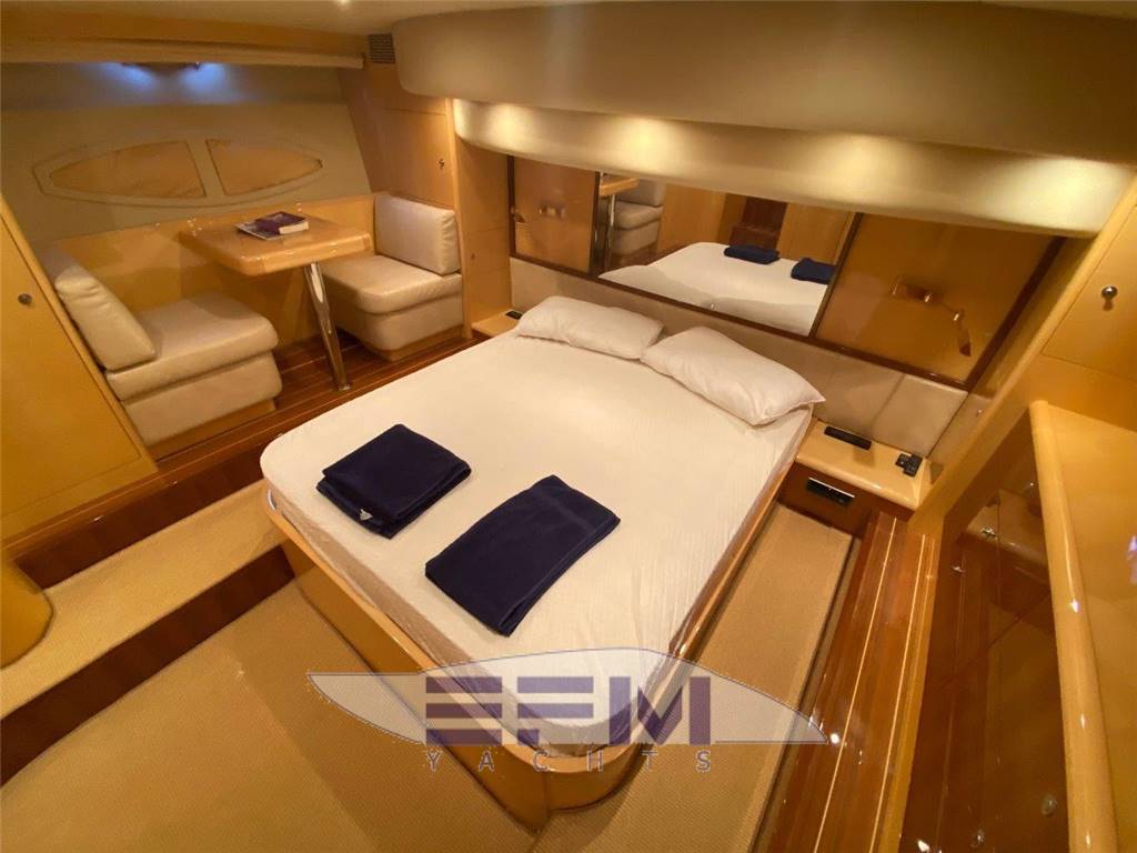Construction CE omologation certificate category ?A? Topsides and deck in GPR hand laid vinilester resin with airex sandwich Transverse and longitudinal reinforcement throughout hull made with unidirectional and woven roving glassfibre Bottom deck and Flybridge in blister resistant vinilester resin hand laid Isophtalic gelcoat finishing (ivory colour Uniesse standard) Epoxy resins, antiosmosis and ntifouling bottom paint Deck and Hull Anchor Bruce Kg. 30 Air intake for engine aeration Bow and Stern stainless steel fairleads (nr. 02) Cockpit and swimming platform in teak Cockpit shower with hot/cold water mixer control Cylindrical fenders (nr. 06) Diesel fillers (nr. 02) Dockside water pressure Electric connecting cable for shore power supply Electric hydraulic gangway Opacmare Electric windlass 1500 W with controls (bow, bridge and Flybridge) Engine Man 900 hp Glass windshield Halogen lighting in the cockpit Hatch on bow Large chain locker complete with Vtr doors on bow Large cockpit sofa with imitation leather cushions Lateral cockpit storage Mooring lines Seawater electric pump with outlets in cockpit and on bow with chain wash Stainless steel cleats on bow (nr. 02) Stainless steel grab rail Stainless steel lateral cleats (nr. 02) Stainless steel cleats on aft (02) Stainless steel pulpit and stanchions Stainless steel safety transom gates to swimming platform (nr. 02) Stainless steel swimming platform ladder Vtr hatch-way to crew cabin from the cockpit Water filler Zinced chain (10mm mt. 75) Windscreen wipers (02) and wiper washer (02) Flybridge Canvas cover for consolle and cabinet on Flybridge Helmsman and passenger?s Vtr bench seat with imitation leather cushions Large ?C? shaped Vtr sofa with imitation leather cushions Halogen Lighting Plexiglass and stainless steel windscreen Round adjustable wood table Stainless steel mast for radar and boat hook Stainless steel safety handrail to cockpit Sun bathing area with imitation leather cushions Vtr cabinet with sink and hot/cold water mixer Vtr consolle Vtr radar-arch for navigation lights, Tv/Vhf antenna and Gps |