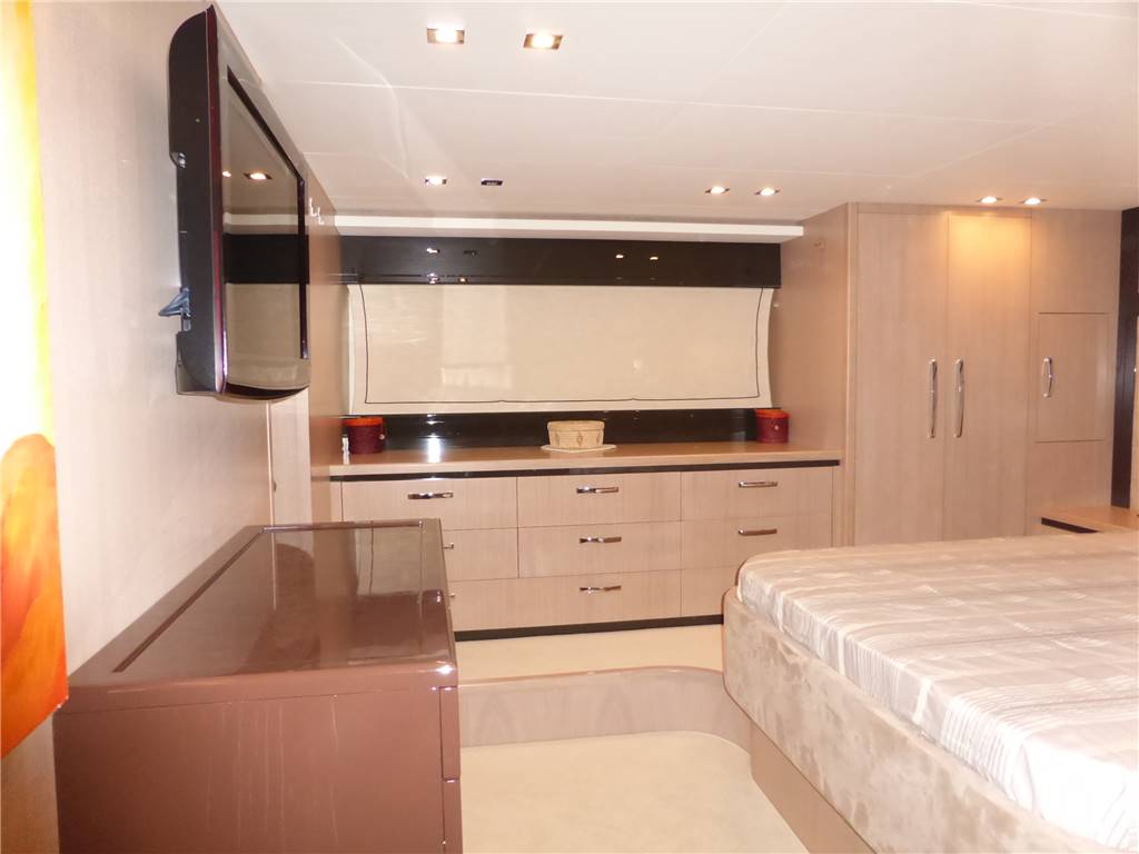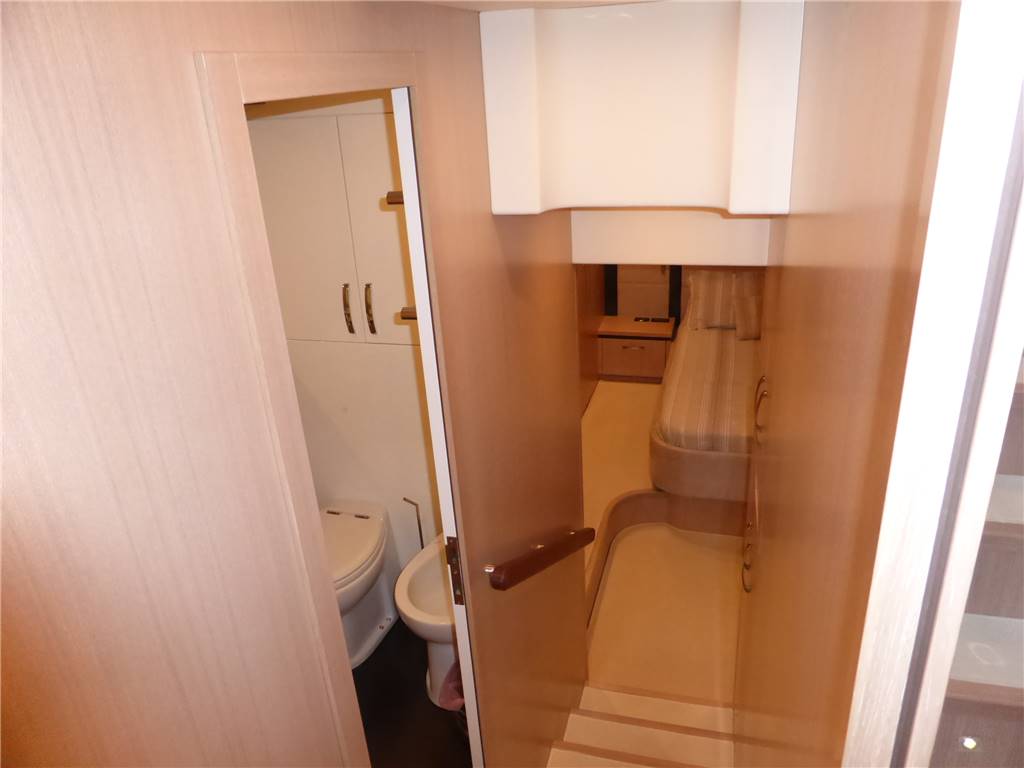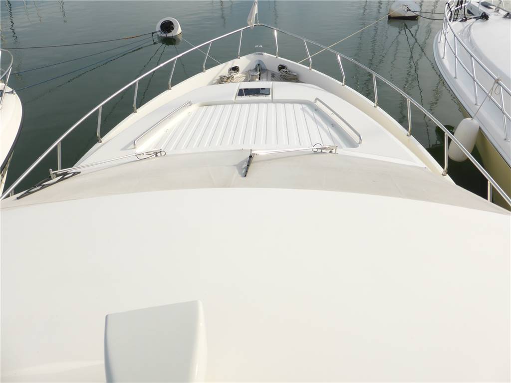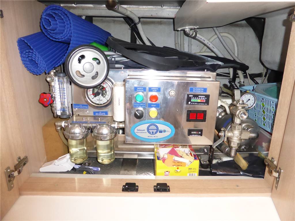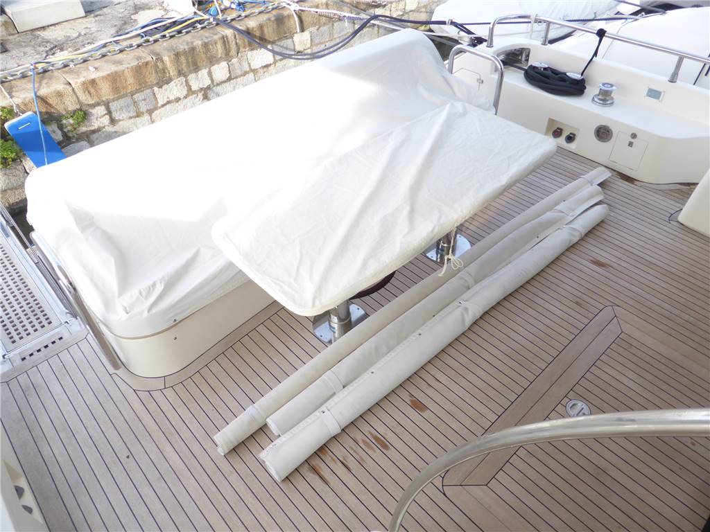 Notas de armamentoFaro poppa x ormeggio - 2 Winches tonneggio - Full teak - Elica di prua e di poppa - Luci Subacquee - Tender con fb - Gruetta opacmare sul fly per alo tender - Lavatrice, Lavasciuga - Lavastoviglie - Dissalatore 180LT - Doppia antenna Satellitare per internet e Sky con decoder digitale terrestre dvd - 2 Generatori KOHLER - Climatizzatore automatico tropicalizzato a doppia pompa di calore e con comando separato in ogni ambiente - icemaker - Impianto radio stereo cd Panasonic - Passerella idraulica maggiorata a scomparsa - Cabina equipaggio allestita - Vericello elettrico con telecomando , ancora Bruce con 100 mt. catena maggiorata + ancora di rispetto - Tv Lcd Toshiba in ogni cabina e salone - casse acque nere - copripozzetto e finestrature complete - monitor pozzetto - cuscinerie complete - dotazioni di sicurezza complete - luci di cortesia a led complete color blu Pozzetto passavanti e plancetta di poppa in teak - mobile fly completo con lavabo, frigo e barbecue - scaletta bagno movimento apertura elettrica - Dotazioni sicurezza normativa italiana - Copri finestrature laterali copertura parabrezza e tenda camper posteriore.