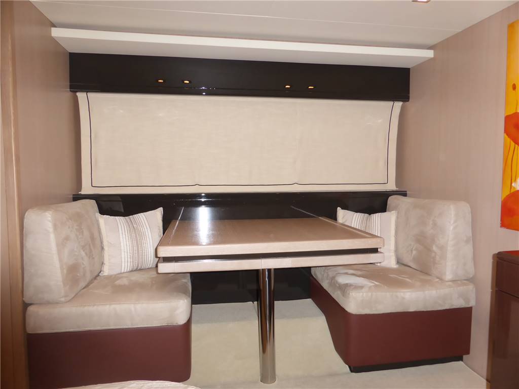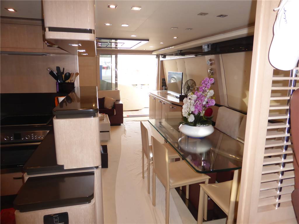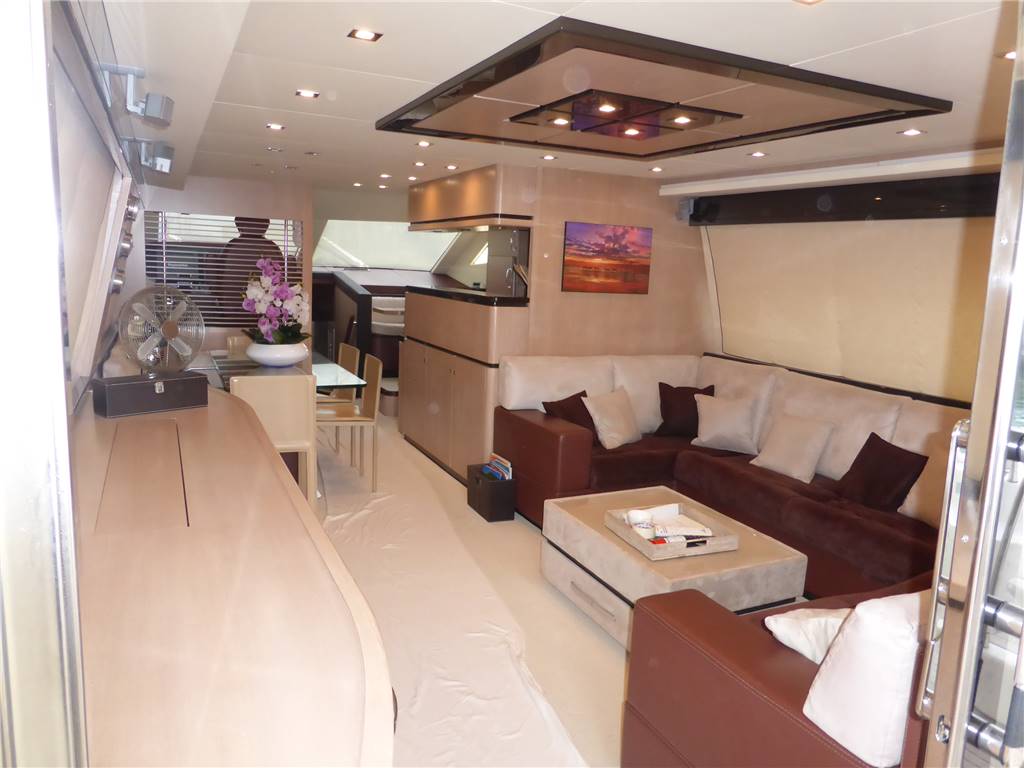 Notas internasStupendi e luminosi interni in rovere sbiancato e pavimentazioni in moquette color panna - Al ponte superiore entrando a dritta troviamo la zona Living Tv composta da un ampio divano a U in pelle Nabuk Bianco panna e con tavolo basso in Pelle e ripiano in vetro , contrapposto grande mobile basso di servizio a murata con grande Tv Lcd 50' completo di impianto dolby surround Hifi e con altoparlanti Bose e Home theatre al soffitto e con dvd e decoder Sky , piu' a prua troviamo la zona pranzo composta da un secondo divano a 3 posti uguale al primo a murata, tavolo in cristallo con basamento in acciaio inox completo con altre 4 sedie in legno color panna e con contrapposto il mobile esterno della zona cucina in legno fatta a ferro di cavallo e completa di pensili , dispensa, elettrodomestici ,piano cottura, forno, frigo, freezer, piano lavoro, forno m/onde, lavastoviglie, doppio lavello con gruppo miscelatore . Piu' avanti e subito a dritta della timoneria troviamo un secondo divano a C in pelle Nabuk Bianco panna e con tavolo rotondo con ripiano in Teak. A sx separata dal salone con una tenda a pacchetto si trova la timoneria con il sedile a comando elettrico, porta laterale alla Viareggina e la scala in legno con alzate in moquette che da accesso al ponte inferiore dove troviamo la zona notte con le cabine e servizi - Verso poppa tramite un piccolo corridoio con disimpegno per il bagno e scendendo 2 scalini troviamo la grande e raffinata suite armatoriale con letto matrimoniale e mobile completo di cassettiere , grande armadio con mobile e cassettiere + grande specchio , doppio divanetto contrapposto con 4 sedute e tavolo , scrittoio con seduta , Tv Lcd 42' Toshiba a parete con impianto Hifi dvd e decoder per sky , splendido bagno privato tutto con pavimento in ceramica bianca e rivestimento in laccato panna e , con mobile laccato bianco con incorporato il lavabo in vetroceramica verde , wc , bidet e con box doccia separato con porta di entrata in cristallo - Corridoio con Pavimento in moquette panna - piu' a prua troviamo la cabina ospiti con 2 letti in piano, armadio ,Tv lcd Sharp dvd radio stereo e cd , bagno privato con mobile laccato bianco con incorporato il lavabo in vetroceramica verde , wc , box doccia angolare - A estrema prua cabina vip con letto matrimoniale, armadi, specchiere e cassettiere, Tv Lcd a parete Toshiba + impianto radio cd e dvd e con bagno privato con pavimento in ceramica bianca e rivestimento in laccato panna e , con mobile laccato bianco con incorporato il lavabo in vetroceramica verde , wc ,e con box doccia separato con porta di entrata in cristallo. Con entrata separata dall' esterno e con bagno privato troviamo l' alloggio equipaggio con una cabina a 2 letti a castello , bagno con doccia separata , zona lavanderia con lavatrice e cucina completa - Grande pozzetto in teak con grande tavolo in teak e grande divano con cuscineria per 6 persone e plancetta allungata a poppa con passerella idraulica. Sul Fly timoneria, mobile cucina con barbecue lavabo e frigo , divani, prendisole e gruetta per alo tender